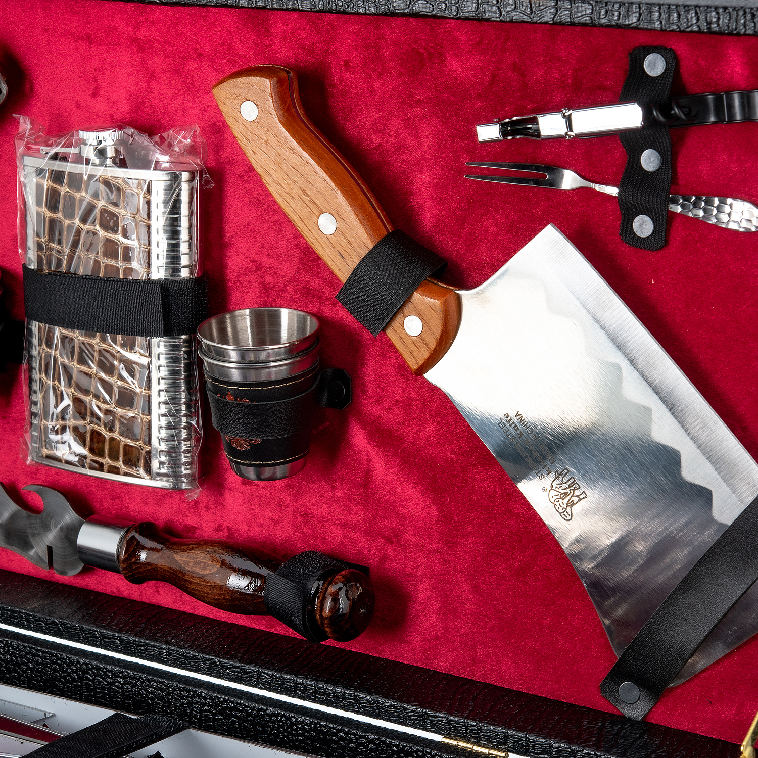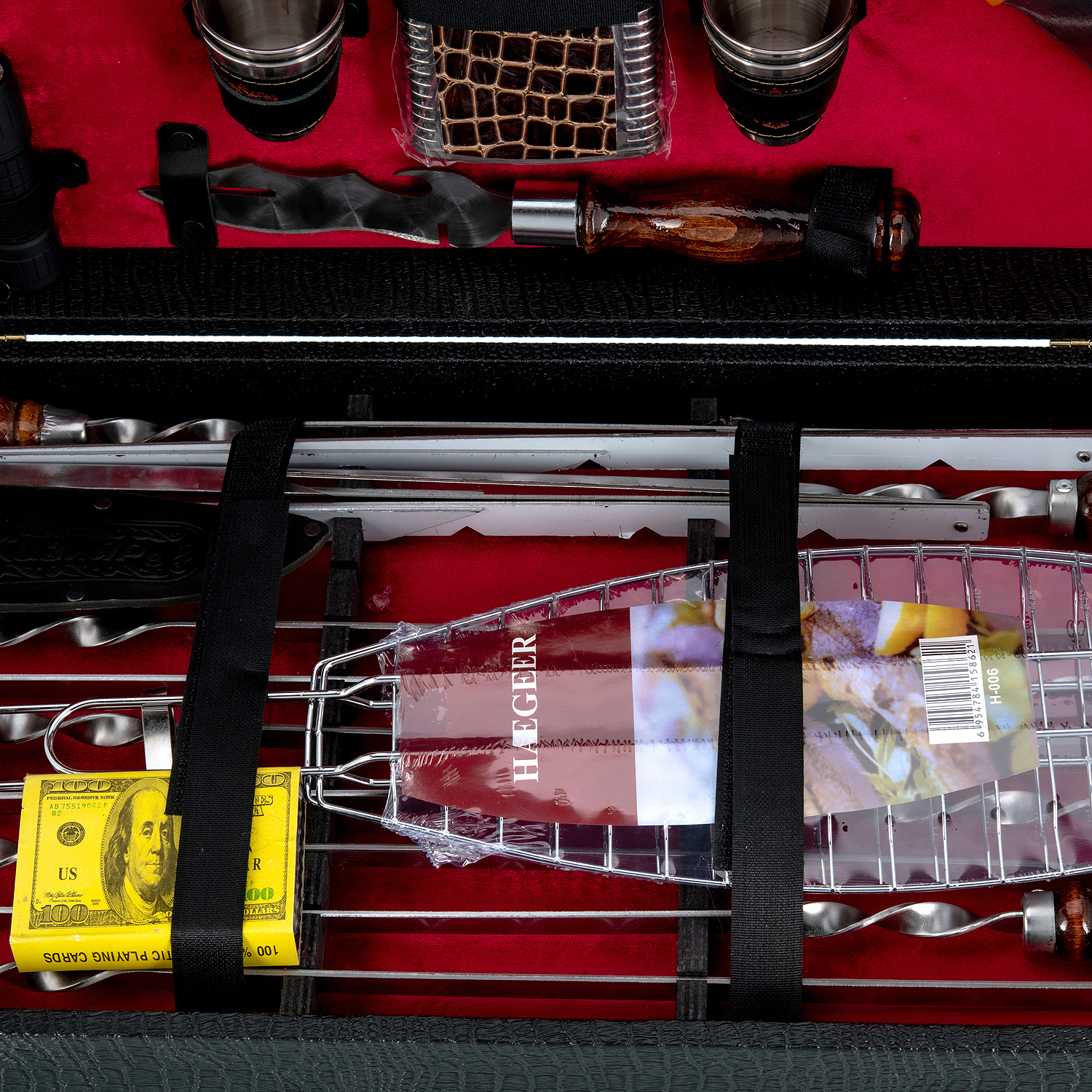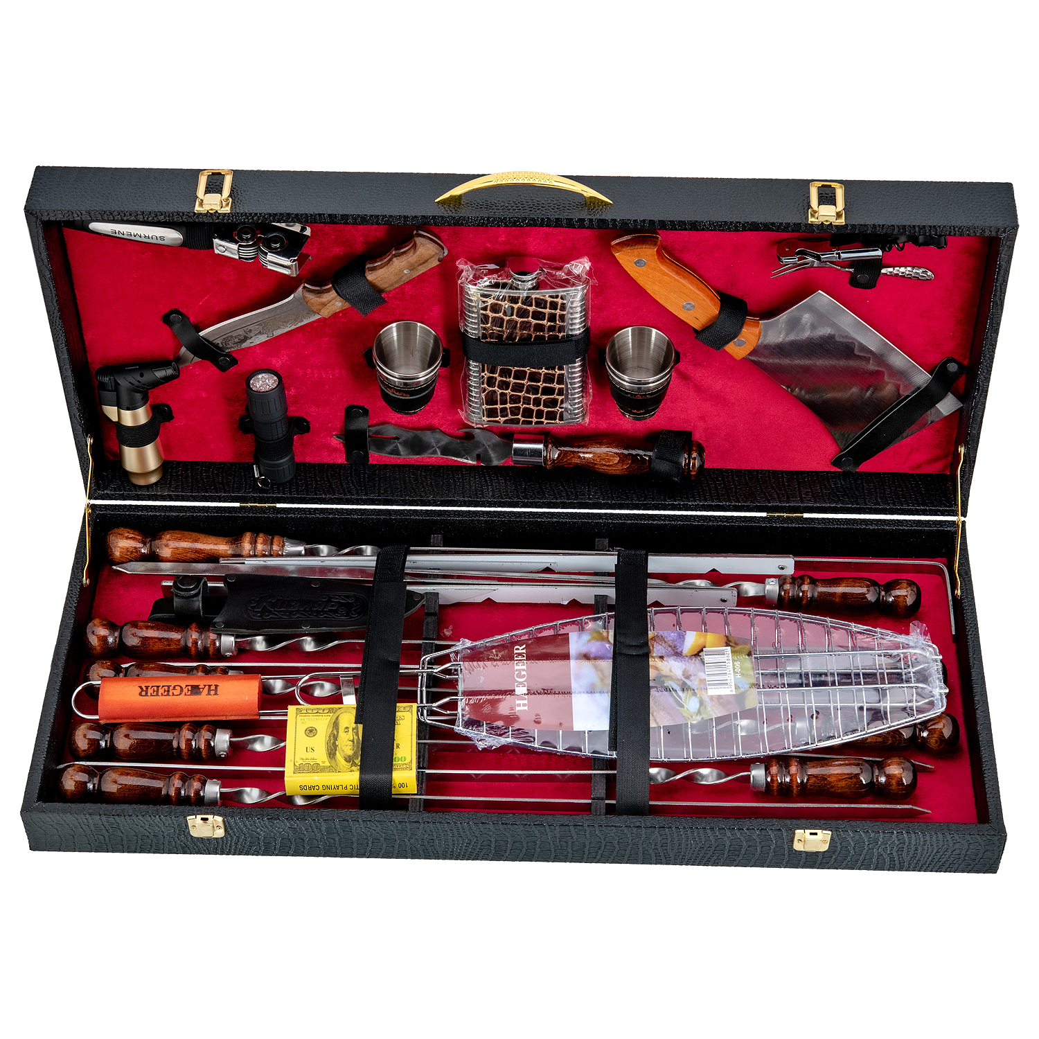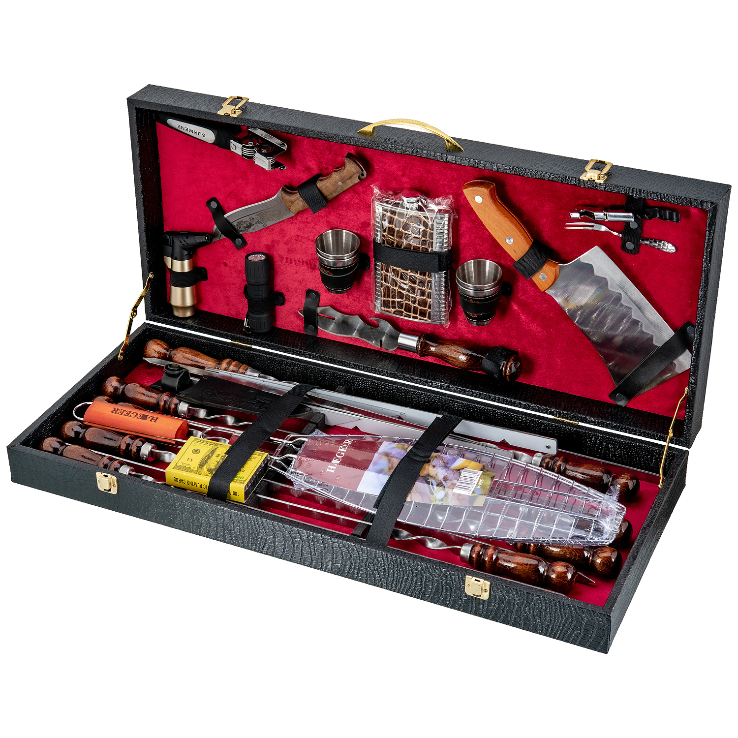 Комплектация: открывашка 3 шт., нож 1 шт., топорик 1 шт., зажигалка 1 шт., фонарик 1 шт., фляга 1 шт., стопка 4 шт., шампур 6 шт., мангал 1 шт., решетка 1 шт., колода карт 1 шт.