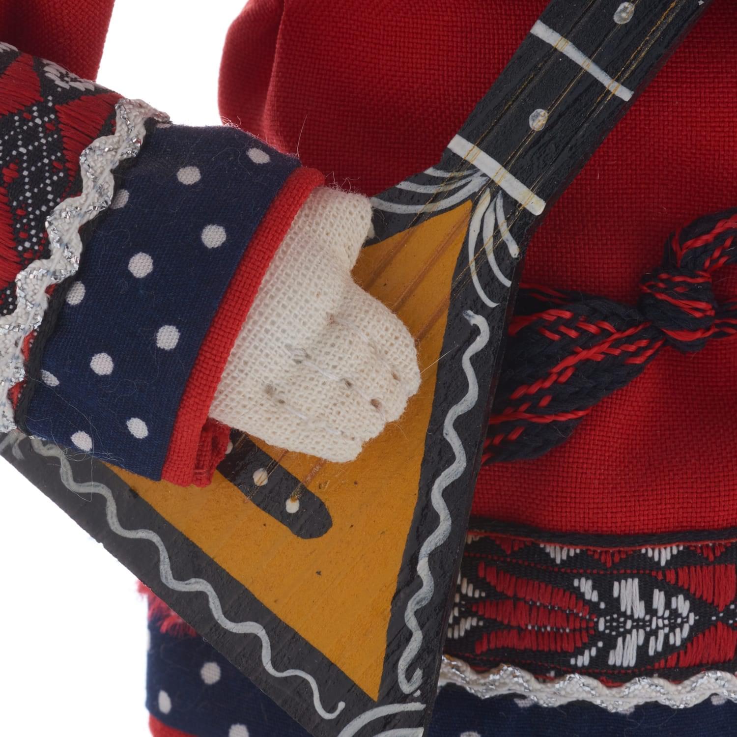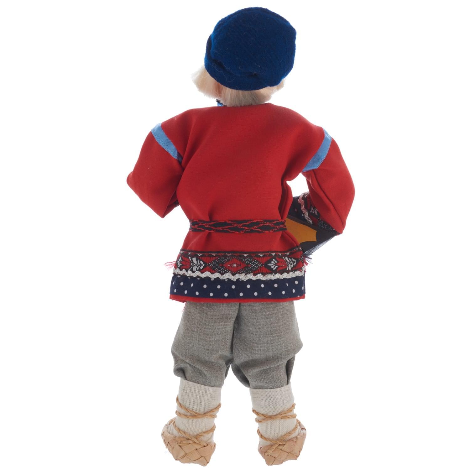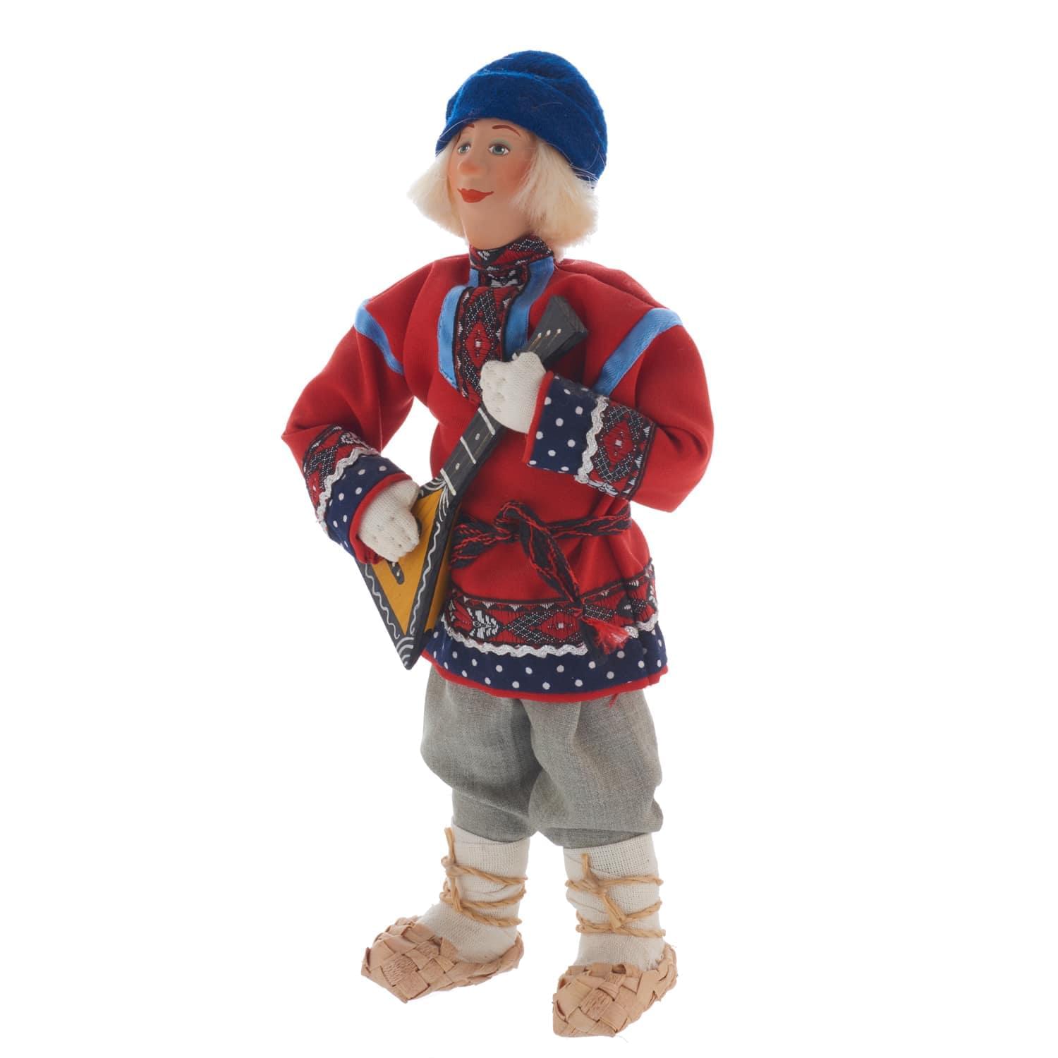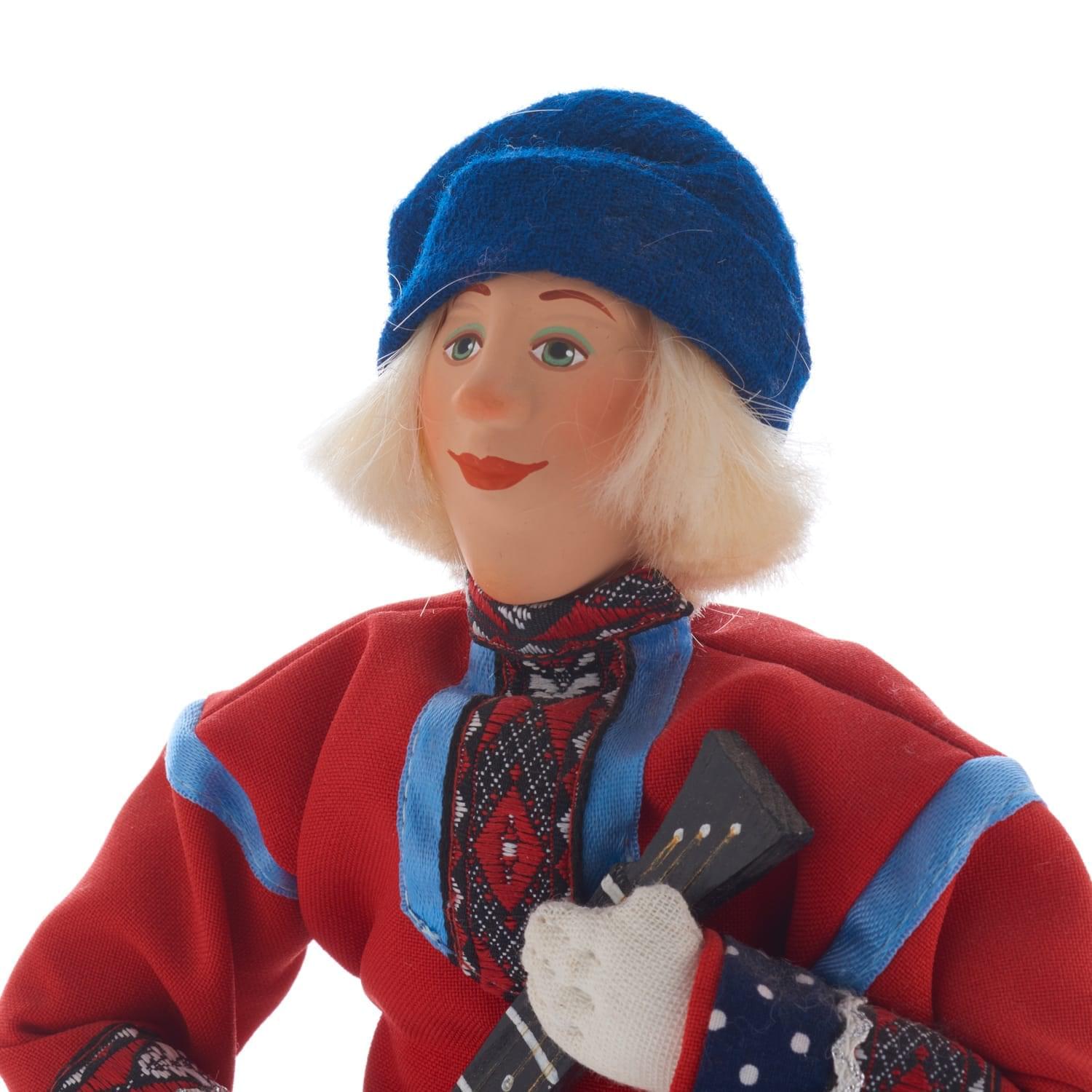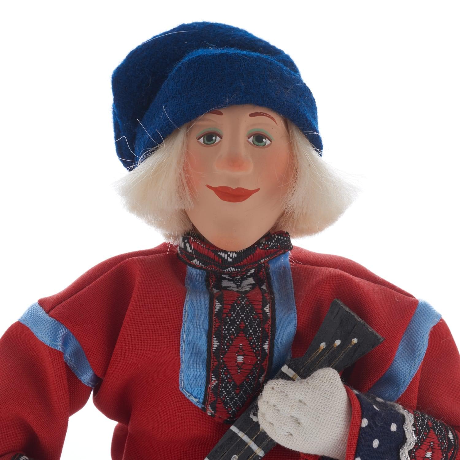 Перед Вами - образ русского красавца в крестьянском костюме, плетеных лаптях, рубахе-косоворотке, повязанной поясом-оберегом, со струнным щипковым инструментом в руках. Федя - знатный кавалер и лучший парень на деревне! Эта кукла представляет собой особый род штучного сувенира, универсальный элемент декора для интерьера, который непременно порадует любителя небанальных образцов хэндмейда и русского фольклора.