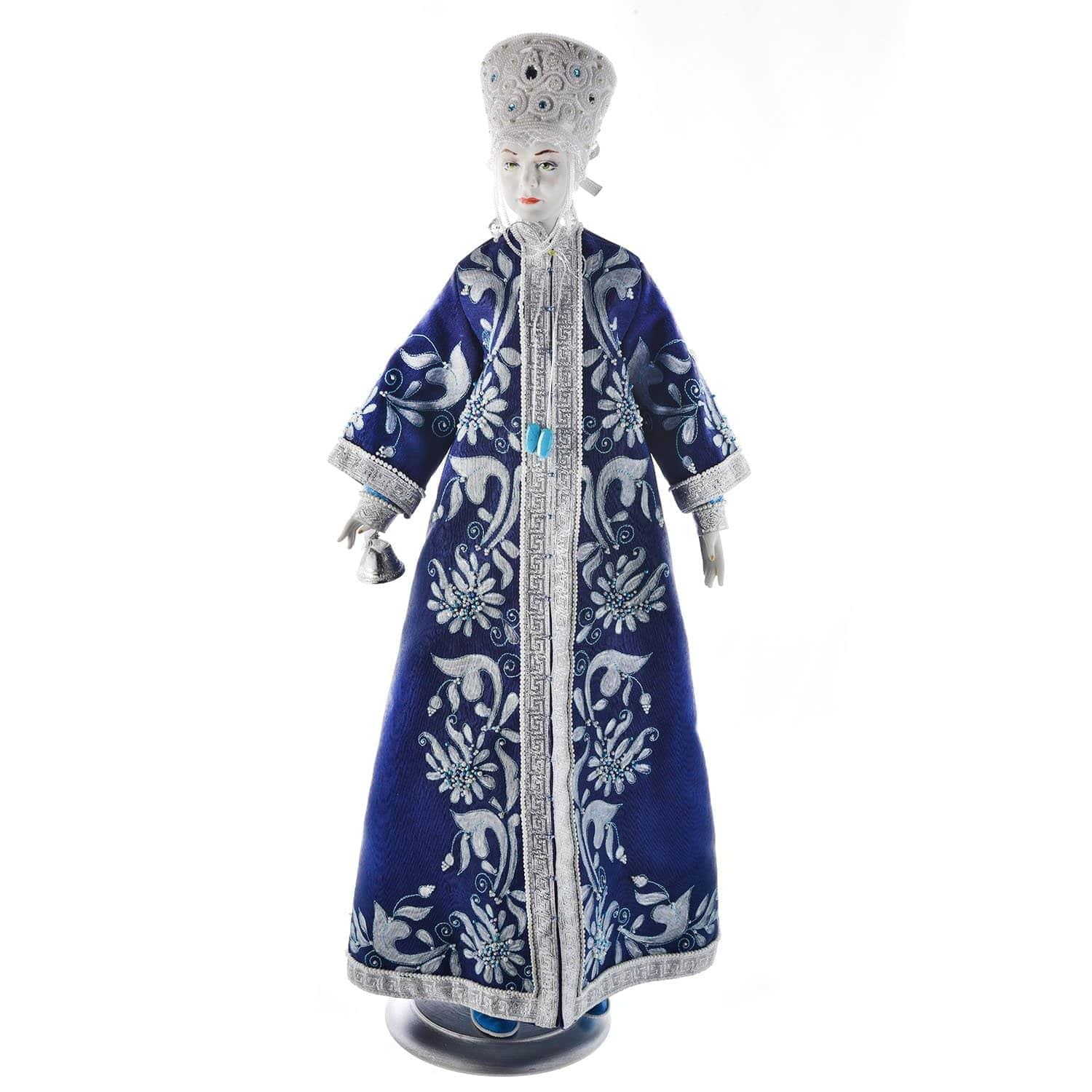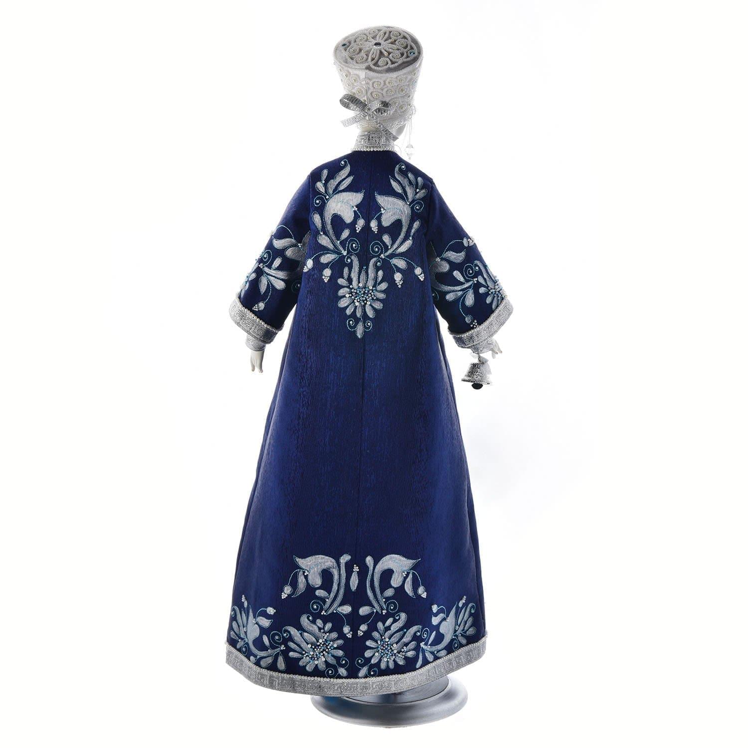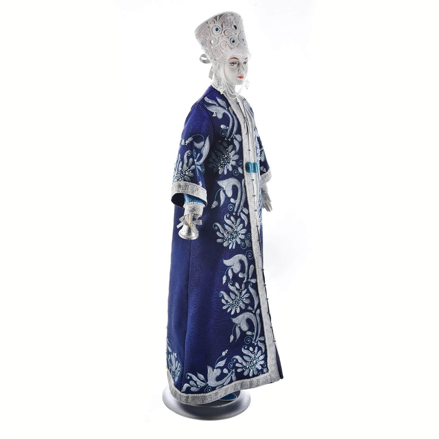 Кукла наряжена в длинный синий кафтан, отделанный в старинной русской традиции растительно-цветочным узором в коричневых тонах. Для декорации костюма использованы пайетки и бисер. В качестве основного материала послужил твердый фарфор, изготовленный по особой рецептуре, называемый "русским белым золотом".
