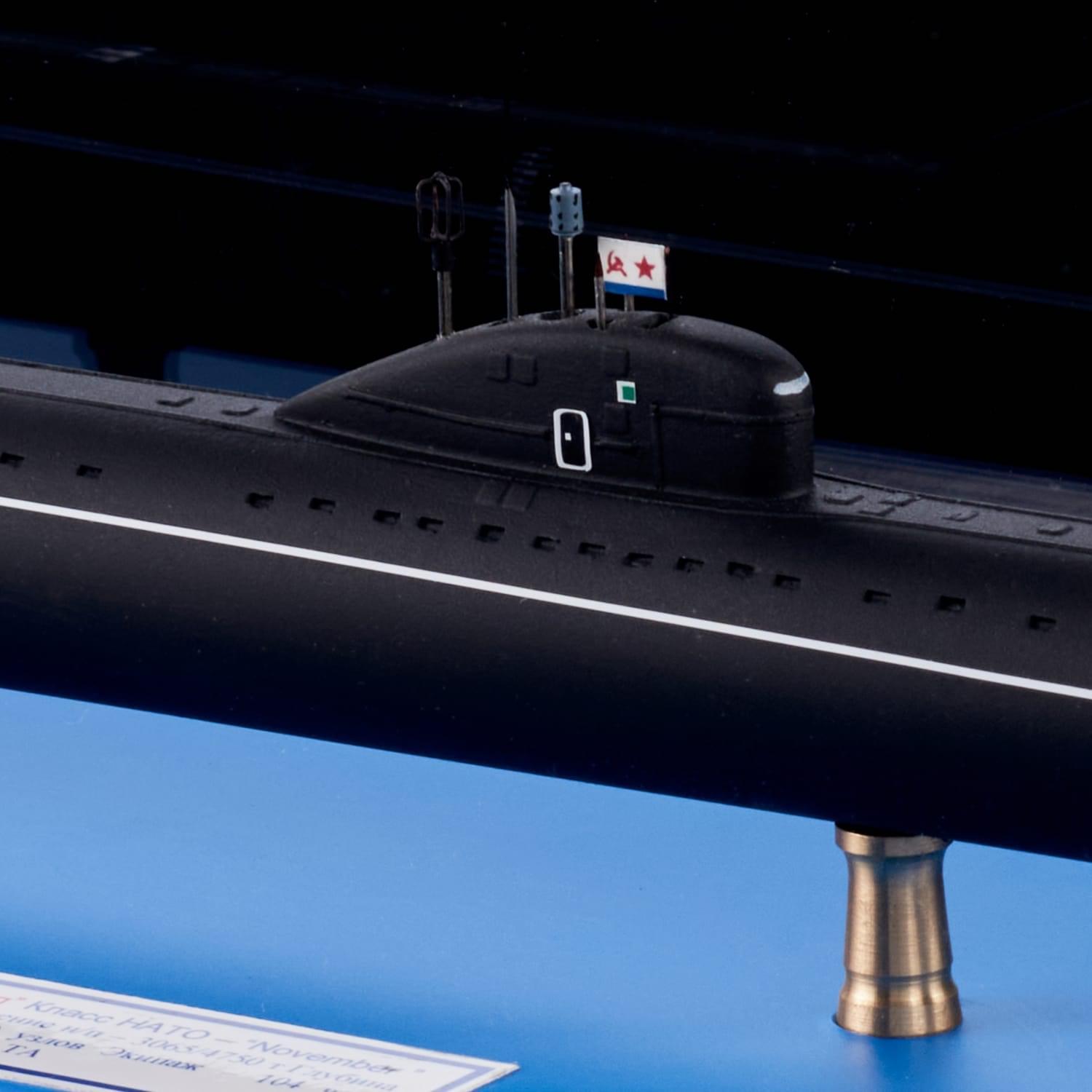 Первые советские атомные подводные лодки. Головной корабль, К-3 «Ленинский Комсомол», относился к проекту 627, последующие строились по измененному проекту 627А. Проектировало и строило корабли СКБ-143 СПМБМ «Малахит». В результате их создания СССР стал второй в мире державой, имеющей атомный подводный флот. Корабли проекта 627-627А имели отличные для той эпохи характеристики, но обладали и недостатками, исправлявшимися в новых проектах. С 1957 по 1963 годы в строй вступили 13 субмарин, проходивших службу на Северном и Тихоокеанском флотах. Субмарина К-8 погибла, остальные списали в начале 1990 годов. Входили в состав Северного и Тихоокеанского флотов и участвовали в несении боевой службы, отправляясь в боевые походы, производили всплытия близ Северного полюса, ходили в тропические широты, совершали кругосветные походы. Материалы: оргстекло, пластик, краски.