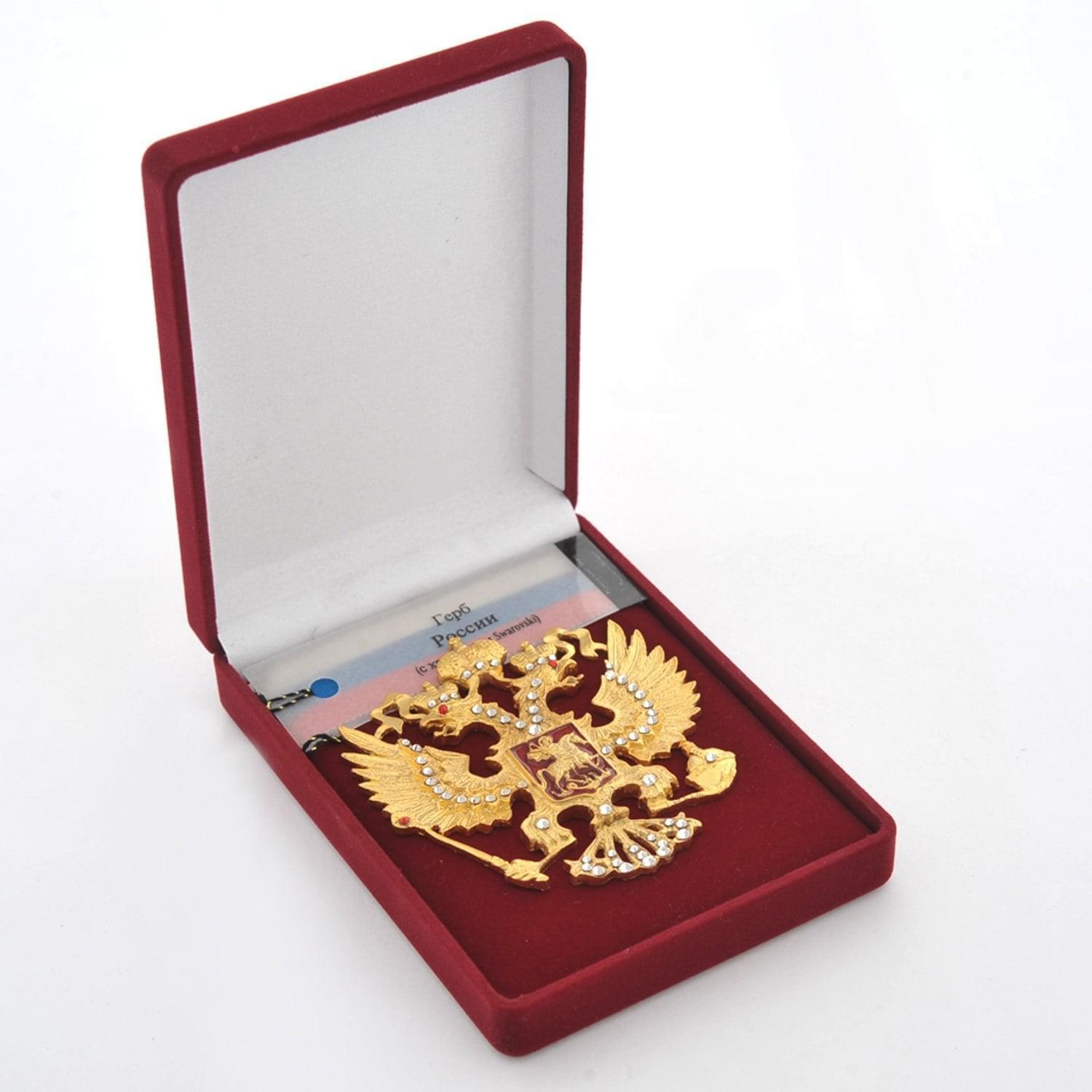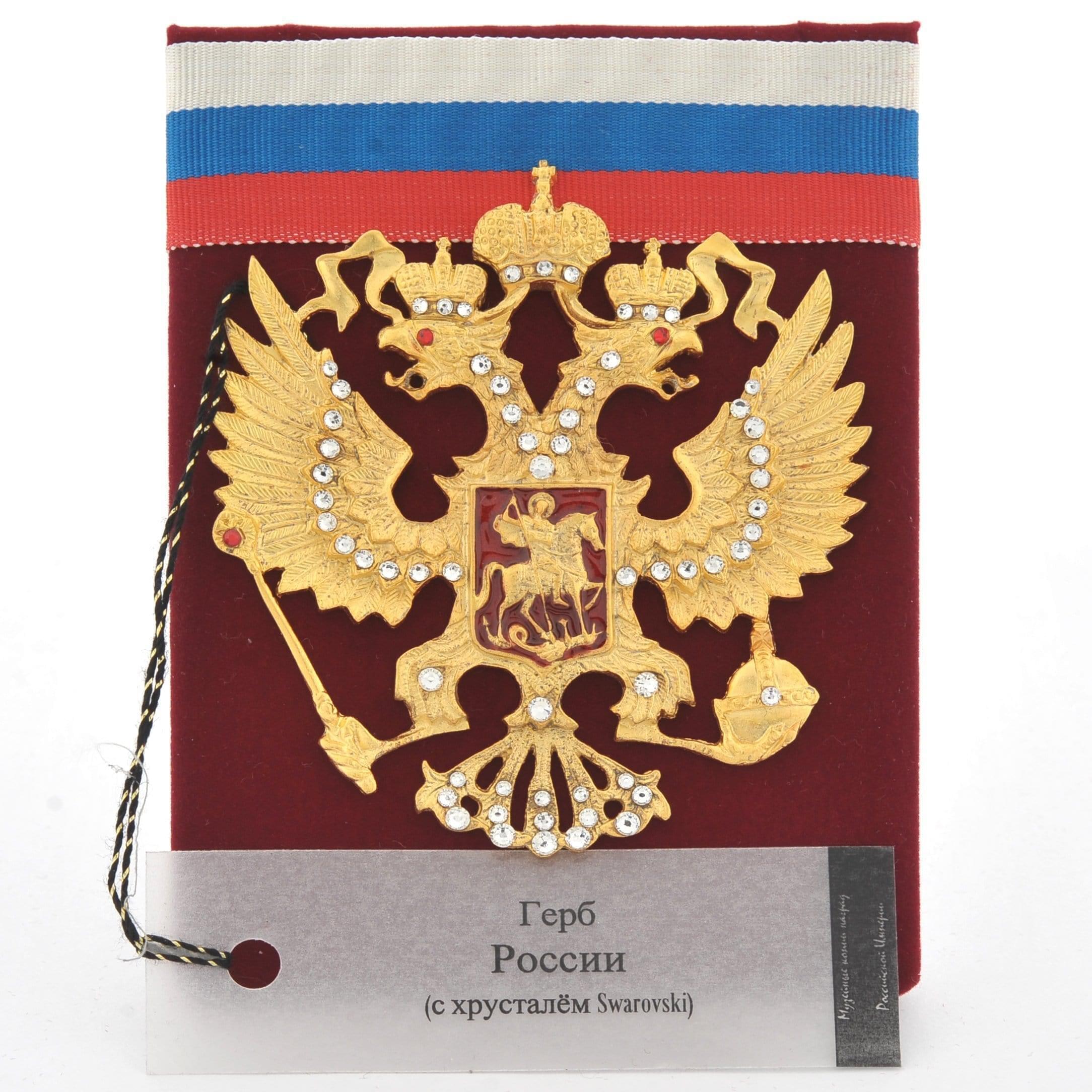 Декоративный греб России создан из цветного сплава металлов и украшен цветной эмалью, а также кристаллами Sawrovski. Ручная работа ювелиров отличается высокой детализацией, качественно выполненным декором. Сувенирный герб Российской Федерации станет хорошим памятным подарком чиновнику, руководителю или коллекционеру. Еще больше орденов, сувенирных медалей, декоративных гербов собрано в специальном разделе