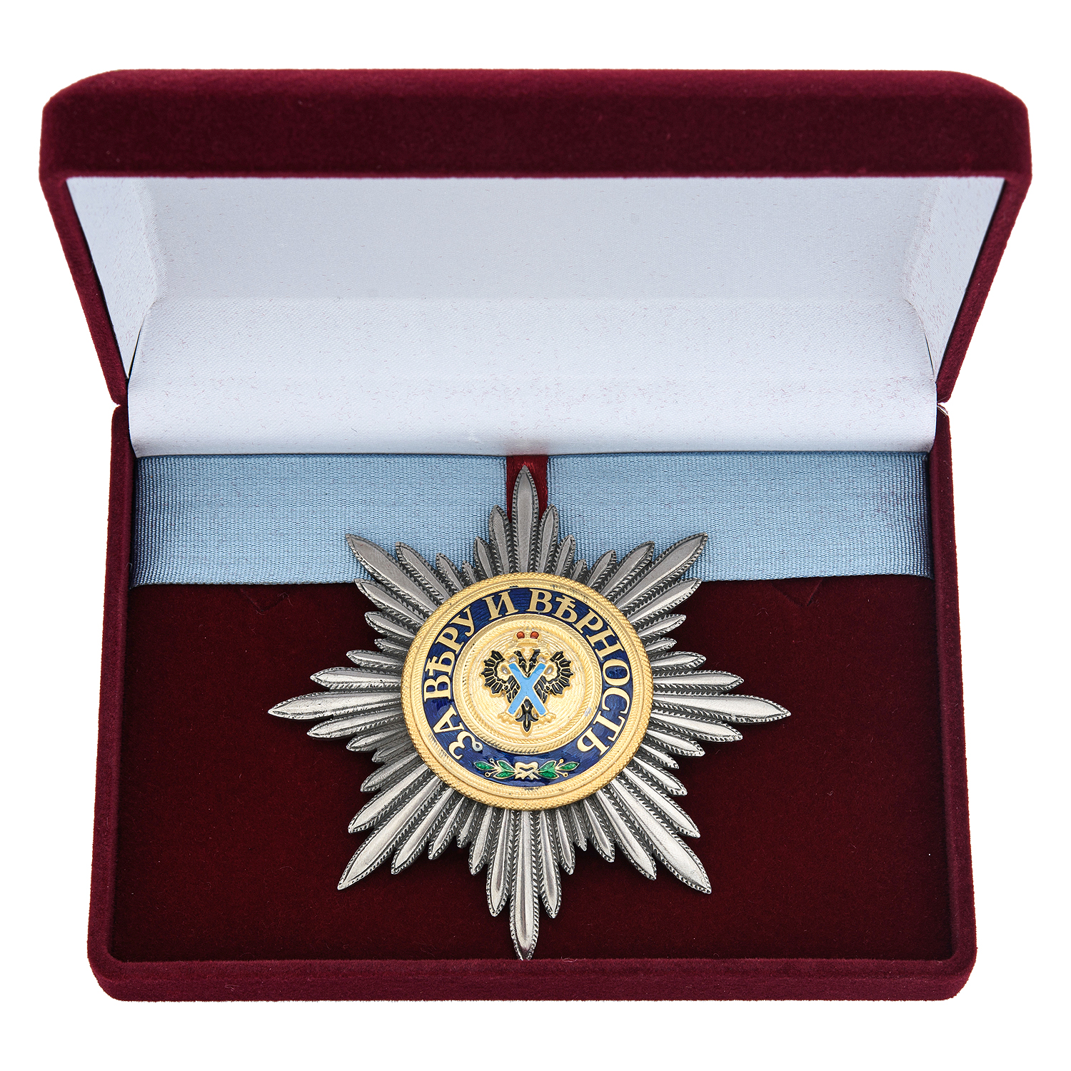 Орден святого Андрея Первозванного, первый и самый главный орден Российской империи, был учрежден Петром I. Им награждались монархи, высокие сановники, зарубежные чины. Петр I, много сил отдавший развитию российского флота, неслучайно выбрал символом первого ордена Андрея Первозванного. Покровитель русской земли, апостол Андрей всю жизнь провел в странствиях, и считался покровителем мореплавателей. Учрежден в 1698 или 1699 году Петром I. Первым кавалером ордена стал дипломат Федор Головин в 1699 году. Ученик Иисуса Христа Андрей Первозванный по церковной легенде занимался распространением христианства на территории будущей Руси и считается покровителем России. Он был распят на косом кресте (Андреевский крест) в Греции около 70 года н. э., что определило дизайн наградных знаков.
