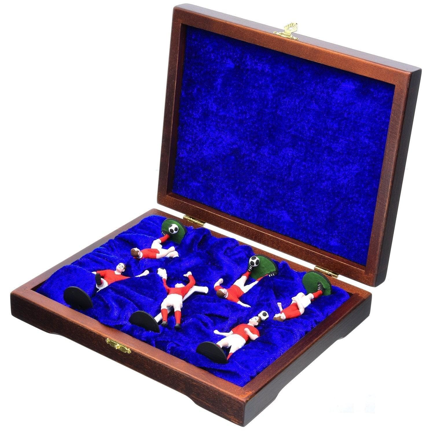 Три статуэтки из олова, в которых воплощены динамичные образы российских футболистов, представлены в шкатулке из древесины русской березы с бархатным ложементом внутри. Статуэтки являются авторскими образцами оловянного литья с коллекционной ценностью. Вашему вниманию - вариант универсального мужского подарка в русском стиле для профессионального футболиста, футбольного болельщика.