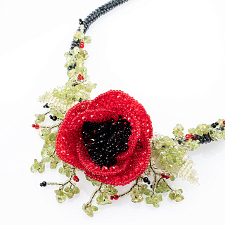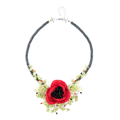 Колье из бисера и камня «Алый мак»