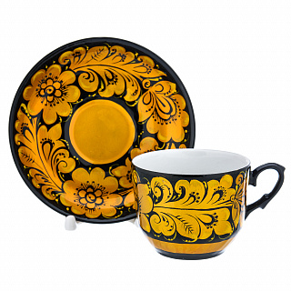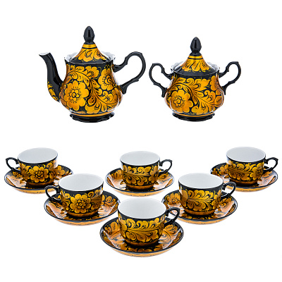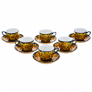 Чайный сервиз на 6 персон «Кудрина на черном». Хохлома