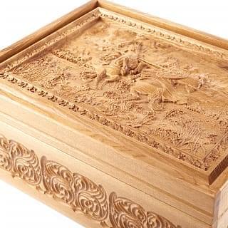 Домино в резной шкатулке из дуба «Поединок Пересвета с Челубеем»