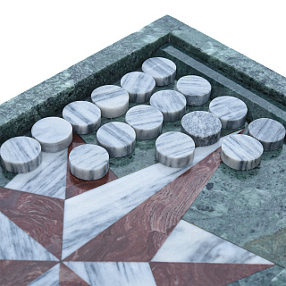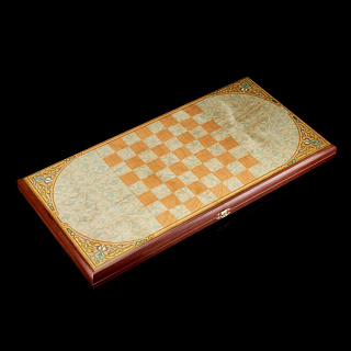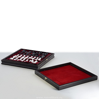 Шахматный ларец с натуральным перламутром и фигурами из цветного хрусталя (отделка серой тканью) 45х45 см