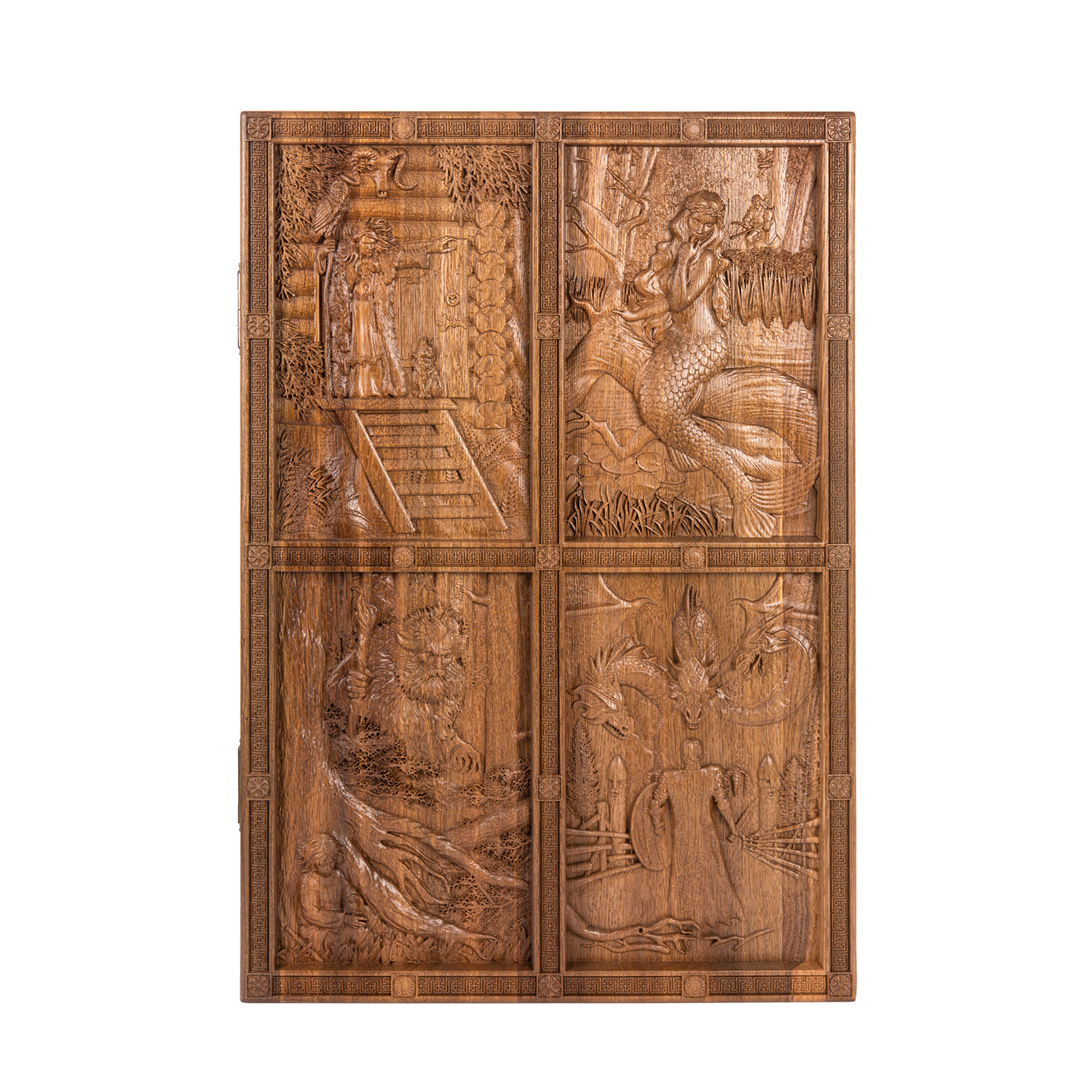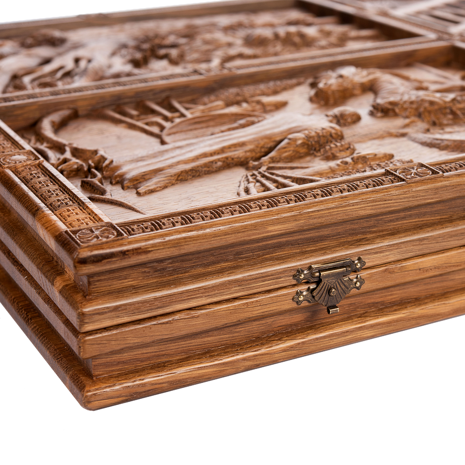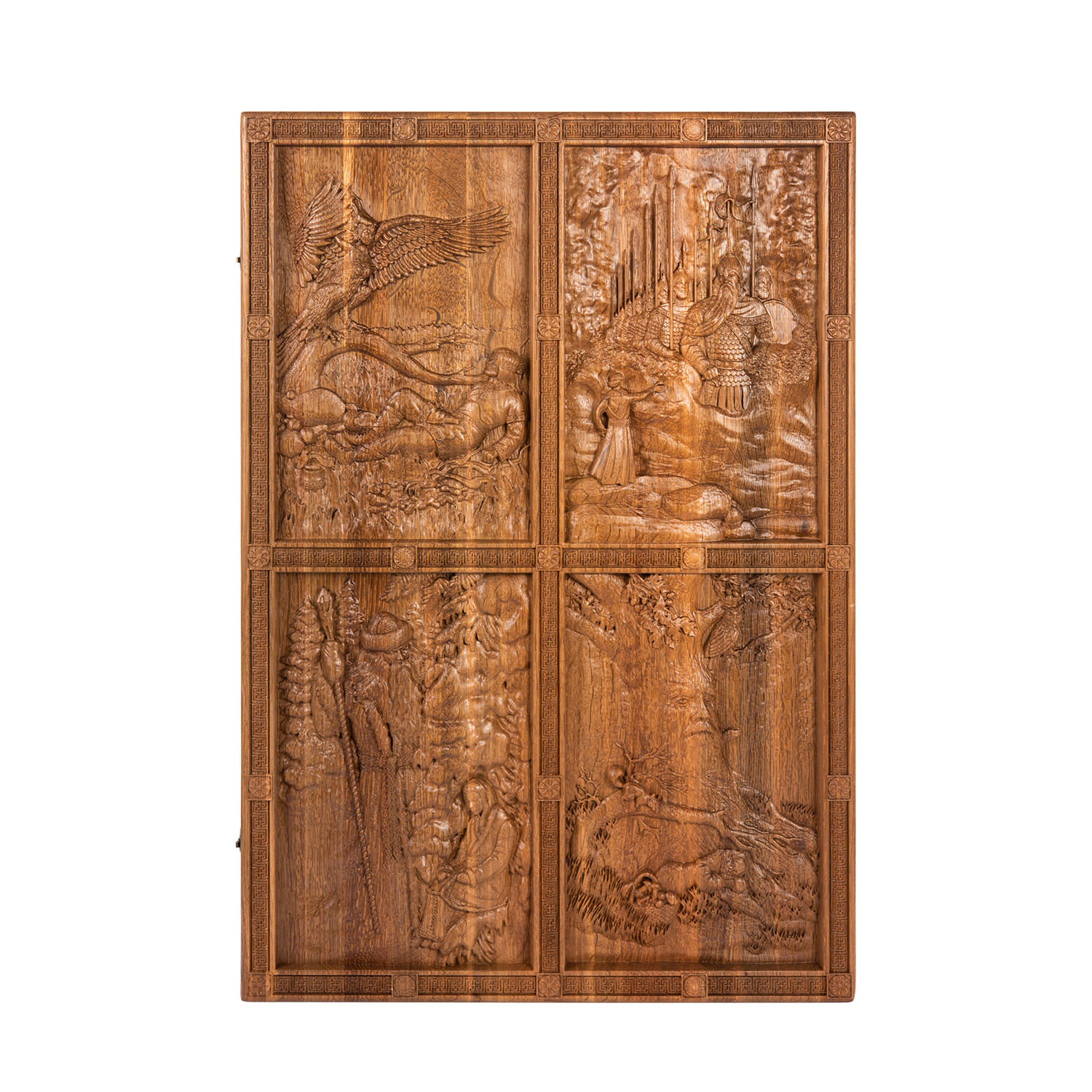 Подарочные нарды «Былинные» – это настоящее произведение искусства, созданное руками талантливых мастеров по авторскому эскизу. Они выполнены из цельного массива морёного дуба, который отличает великолепная текстура и приятный естественный оттенок. Нарды украшены при помощи художественной резьбы по дереву. Сюжеты, нанесённые на внешнюю сторону доски, изображают героев русских народных былин и эпосов. Такие нарды станут отличным подарком, хранящим в себе теплоту рук мастеров и дух Руси.