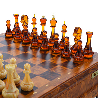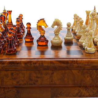 Шахматный ларец из капа с фигурами из янтаря 38х38 см