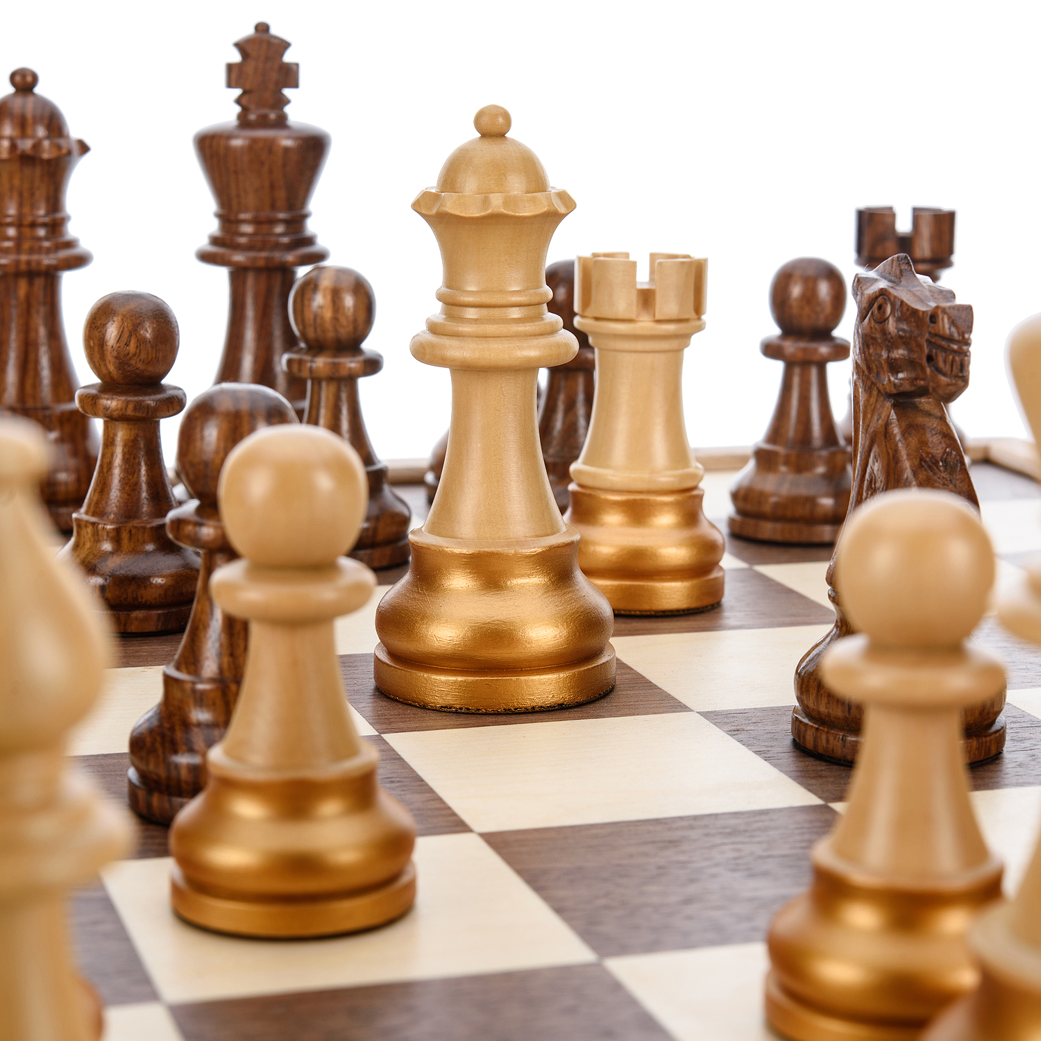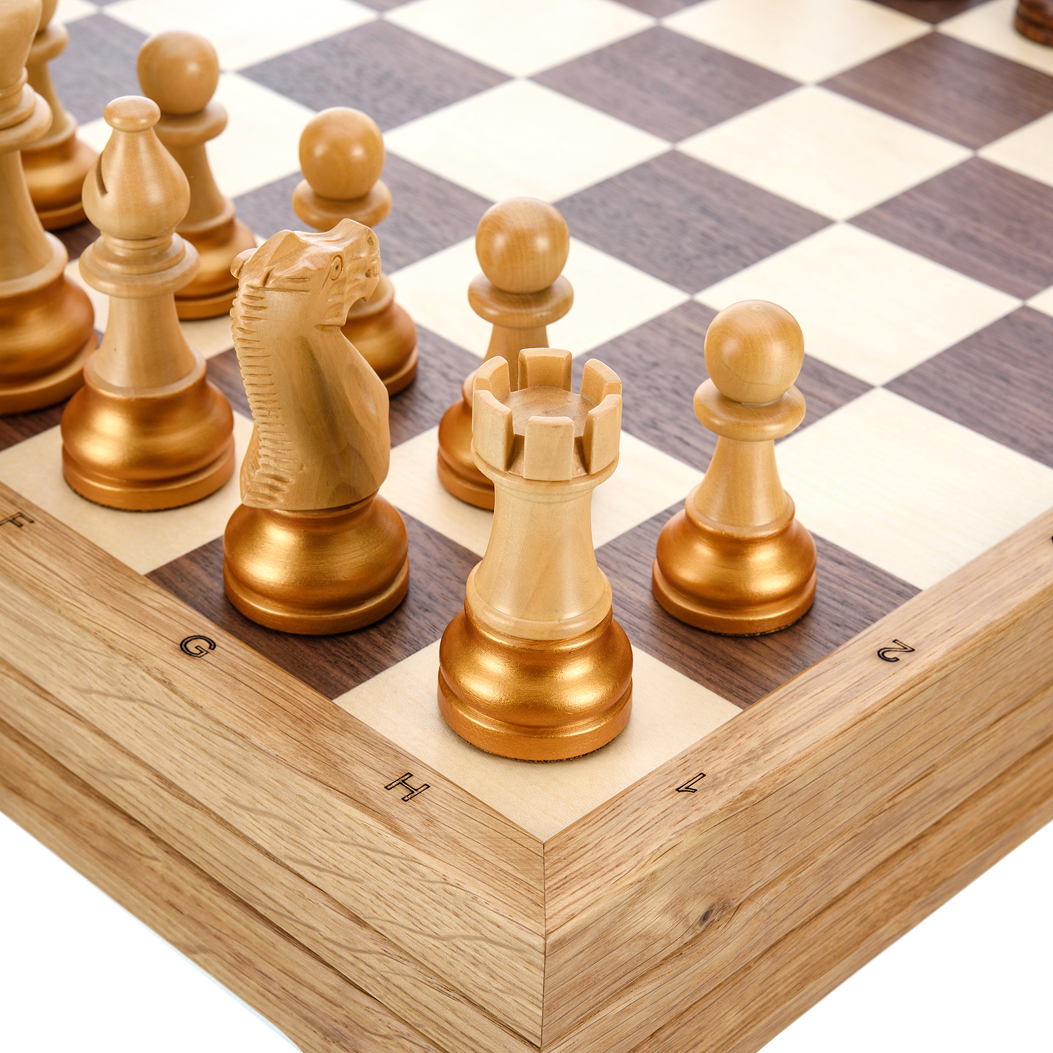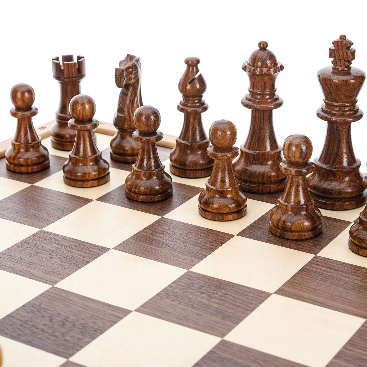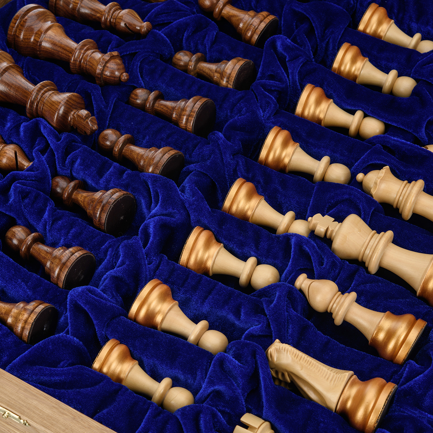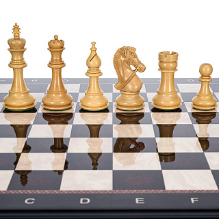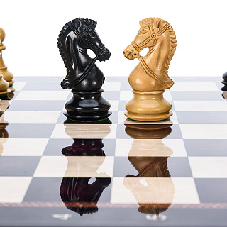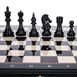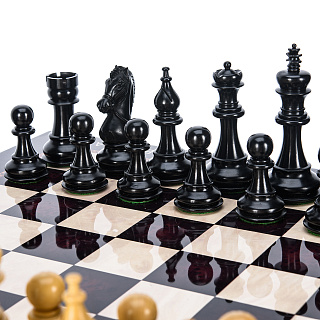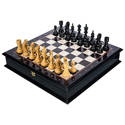 Шахматный ларец с инкрустацией и фигурами из янтаря 30х30 см