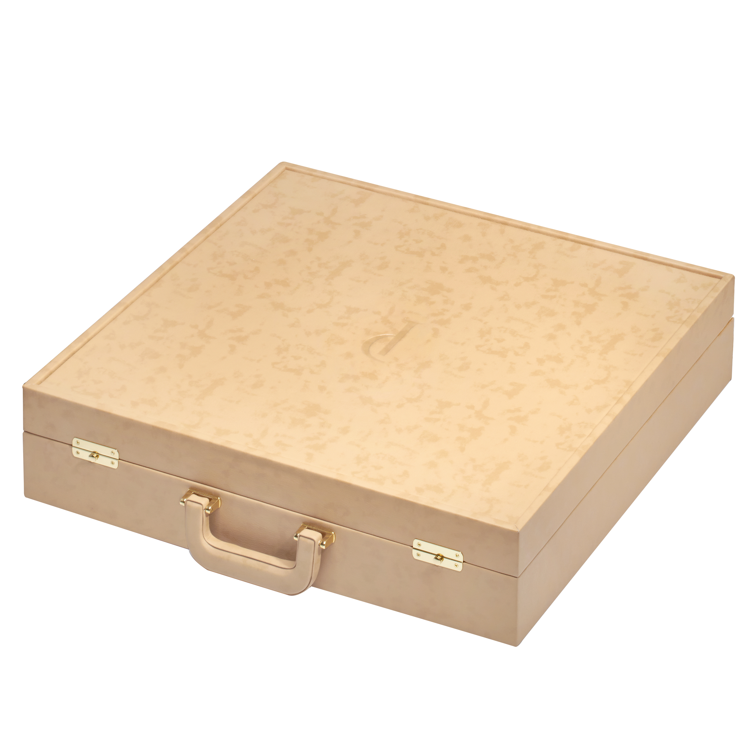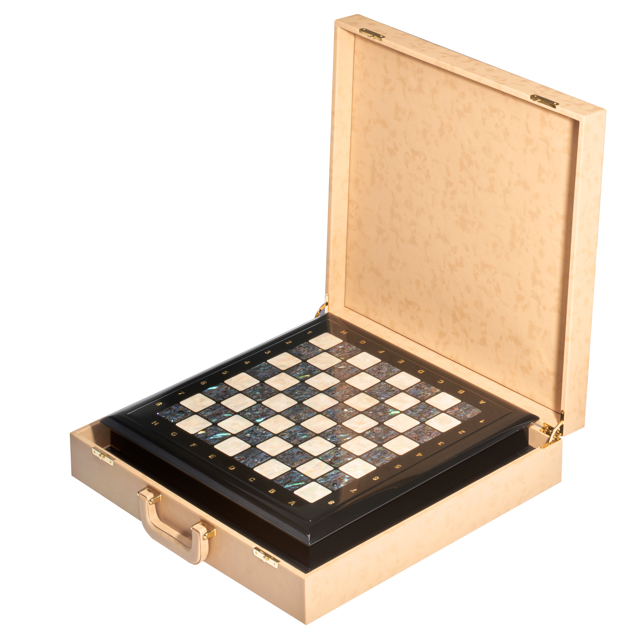 Шахматный ларец с натуральным перламутром и фигурами из цветного хрусталя (отделка бежевой тканью) 45х45 см