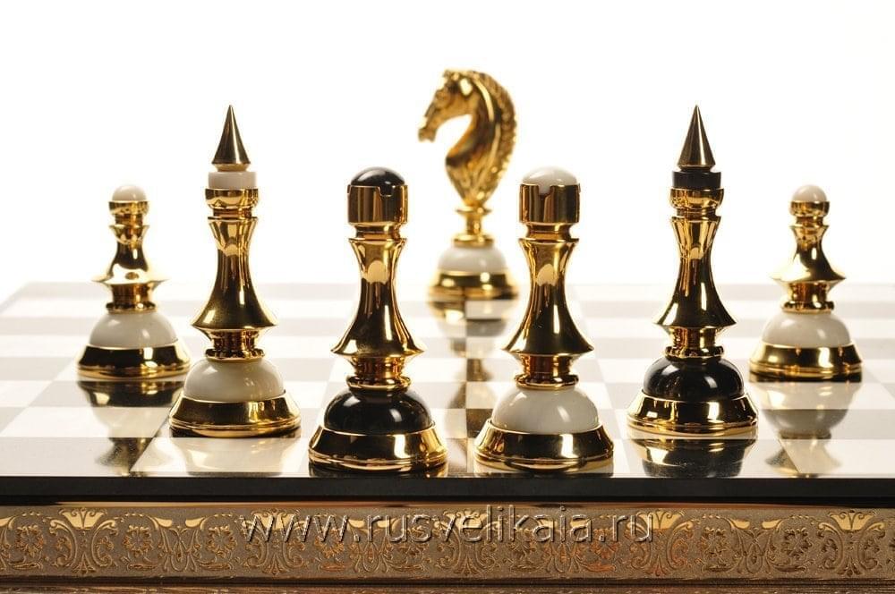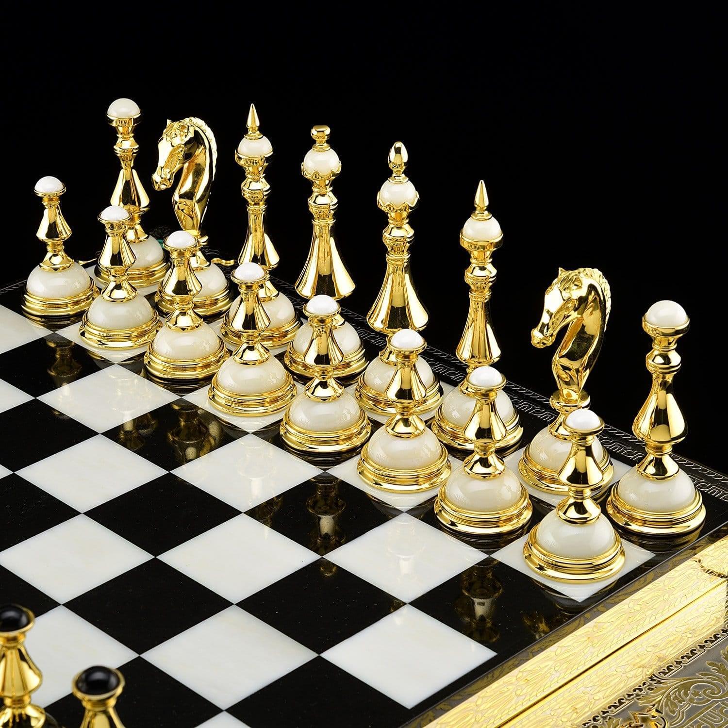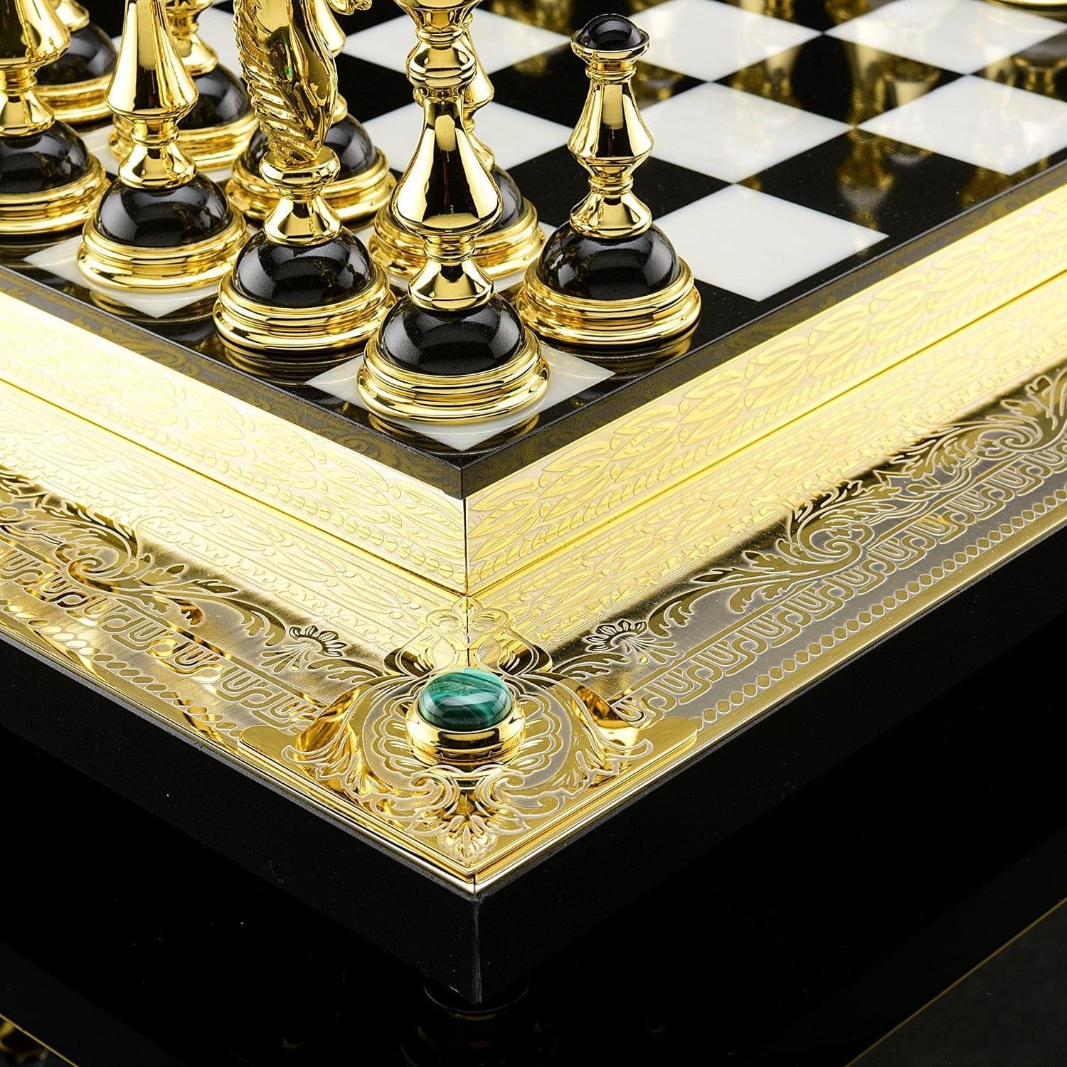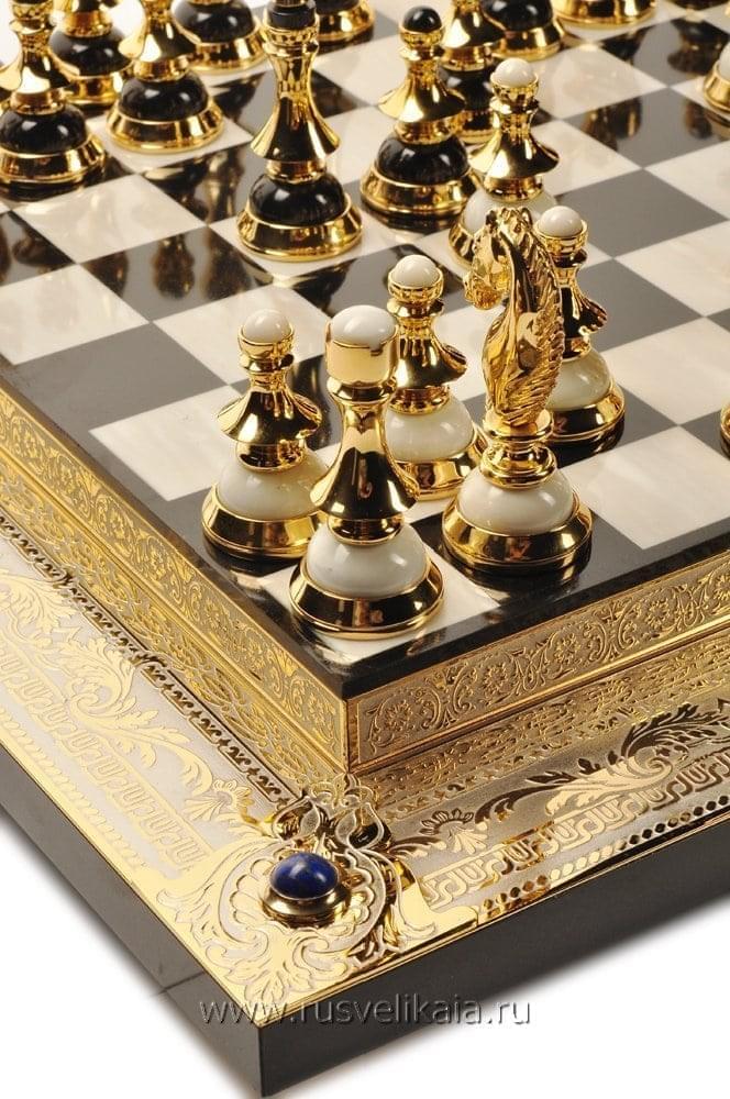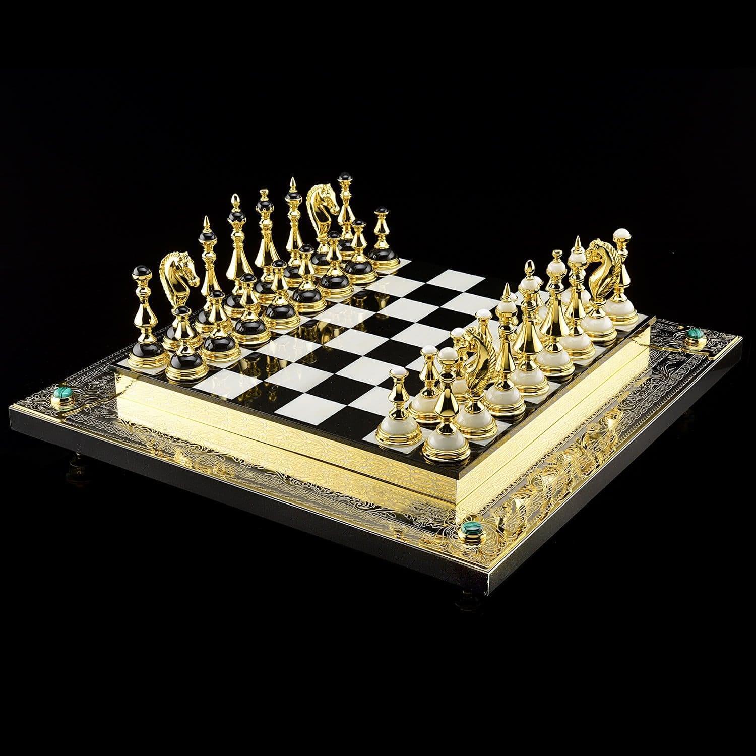 Из белого и черного мрамора с самоцветами в форме кабошонов и позолоченными элементами, декорированными в технике Златоустовской гравюры, эти шахматы представляют произведение российского декоративно-прикладного искусства. Мрамор (с латинского - блестящий камень, каменная глыба) как полезный и красивый минерал признан людьми во времена античности. Самоцвет нашли впервые в Греции. Там он являлся символом любви, греки использовали мрамор в скульптуре, строили из него храмы богам, в частности, богине любви Афродите. Для высвобождения магии камня, его носят в качестве украшения. Такой оберег привлекает любовь, оберегает от ревности, разрыва в отношениях. Он способствует скорейшему браку и рождению здоровых детей. В Древнем Риме считалось, что минерал не боится темной магии, поэтому из него сооружали дома, амулеты. В Индии его считают спутником добра. Люди верят, что каждая семья должна иметь дома хотя бы статуэтку из камня. Природная энергия мрамора укрепляет нервы, иммунитет.