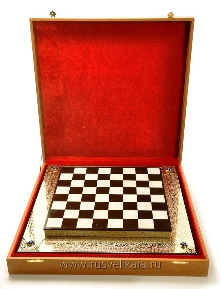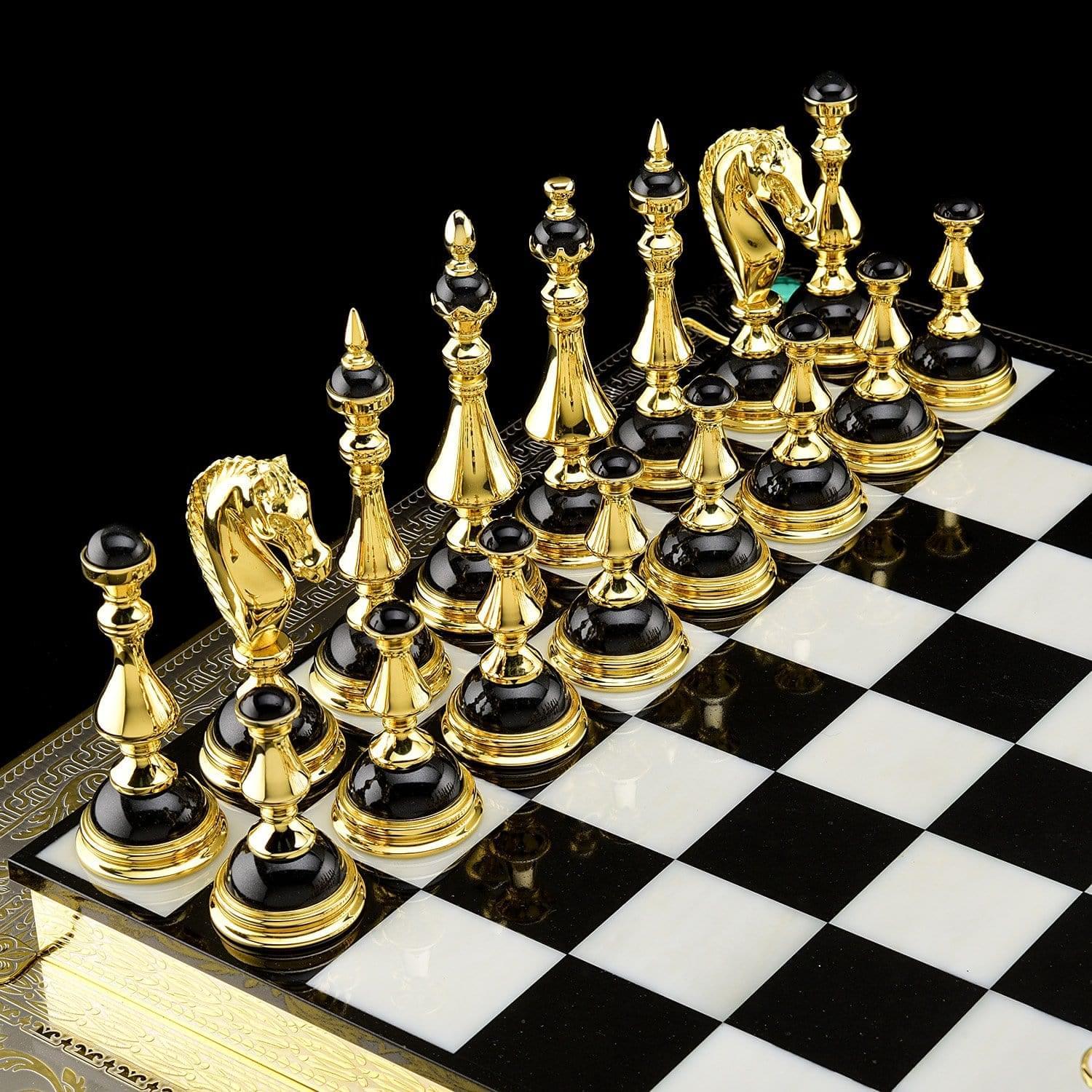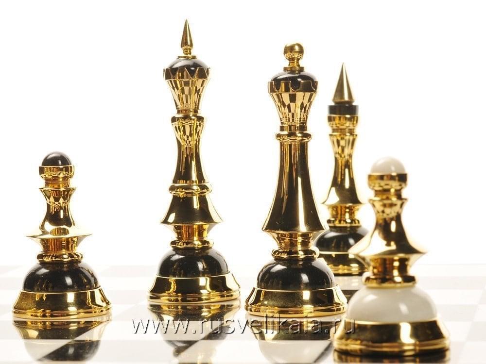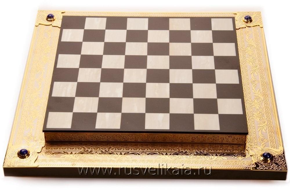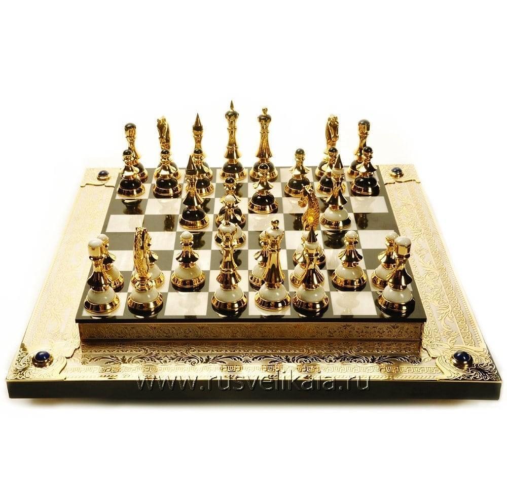 Из белого и черного мрамора с самоцветами в форме кабошонов и позолоченными элементами, декорированными в технике Златоустовской гравюры, эти шахматы представляют произведение российского декоративно-прикладного искусства. Мрамор (с латинского - блестящий камень, каменная глыба) как полезный и красивый минерал признан людьми во времена античности. Самоцвет нашли впервые в Греции. Там он являлся символом любви, греки использовали мрамор в скульптуре, строили из него храмы богам, в частности, богине любви Афродите. Для высвобождения магии камня, его носят в качестве украшения. Такой оберег привлекает любовь, оберегает от ревности, разрыва в отношениях. Он способствует скорейшему браку и рождению здоровых детей. В Древнем Риме считалось, что минерал не боится темной магии, поэтому из него сооружали дома, амулеты. В Индии его считают спутником добра. Люди верят, что каждая семья должна иметь дома хотя бы статуэтку из камня. Природная энергия мрамора укрепляет нервы, иммунитет.