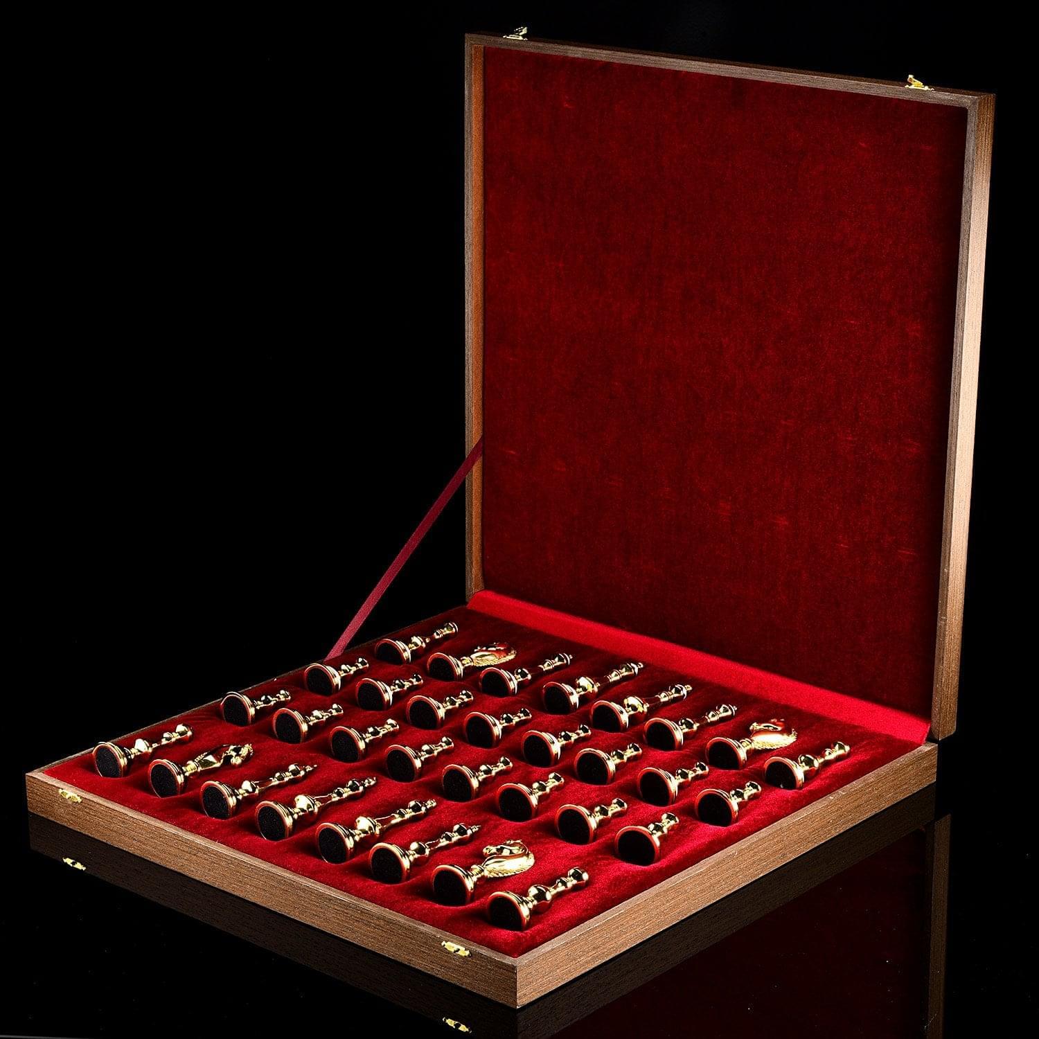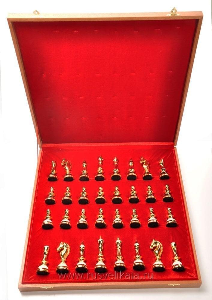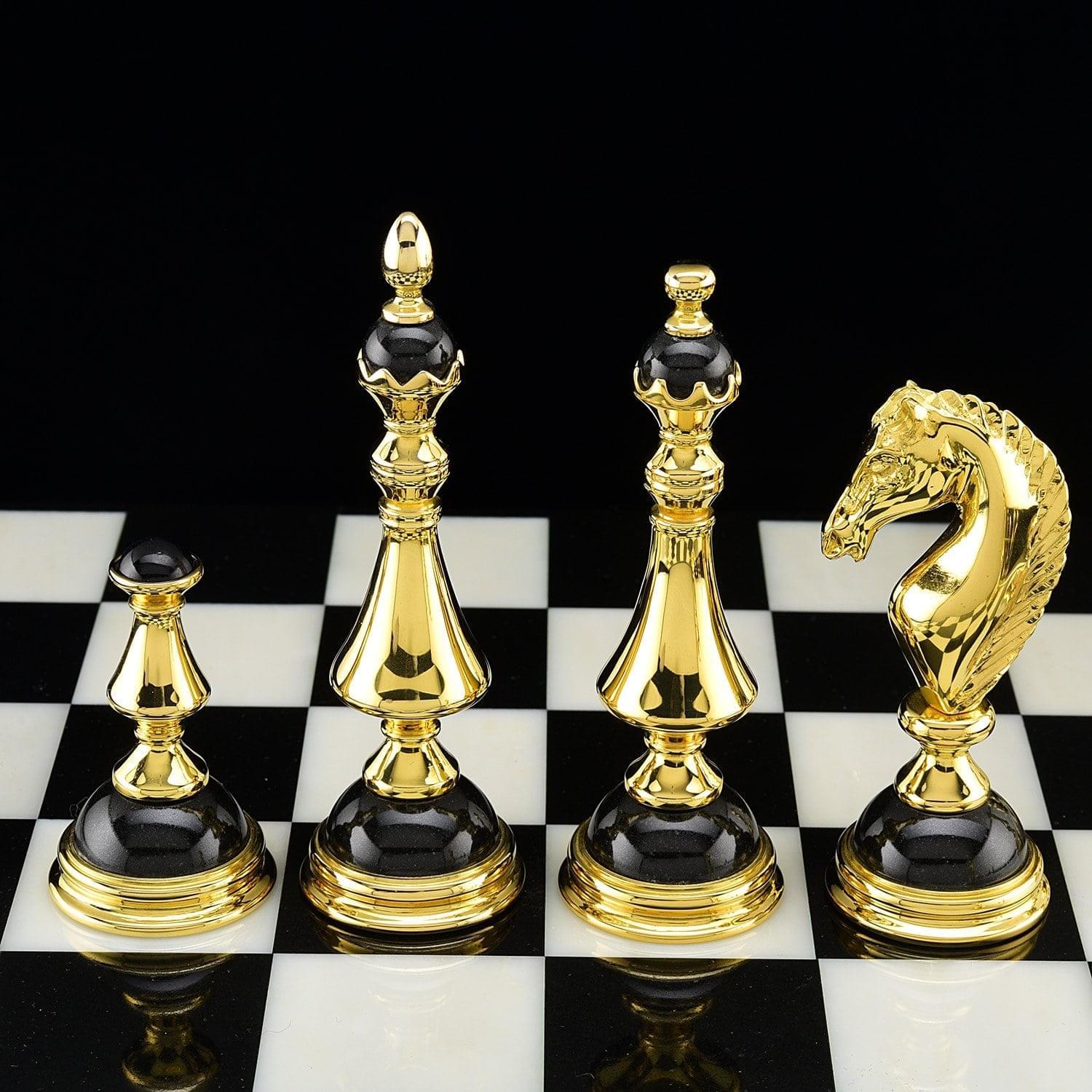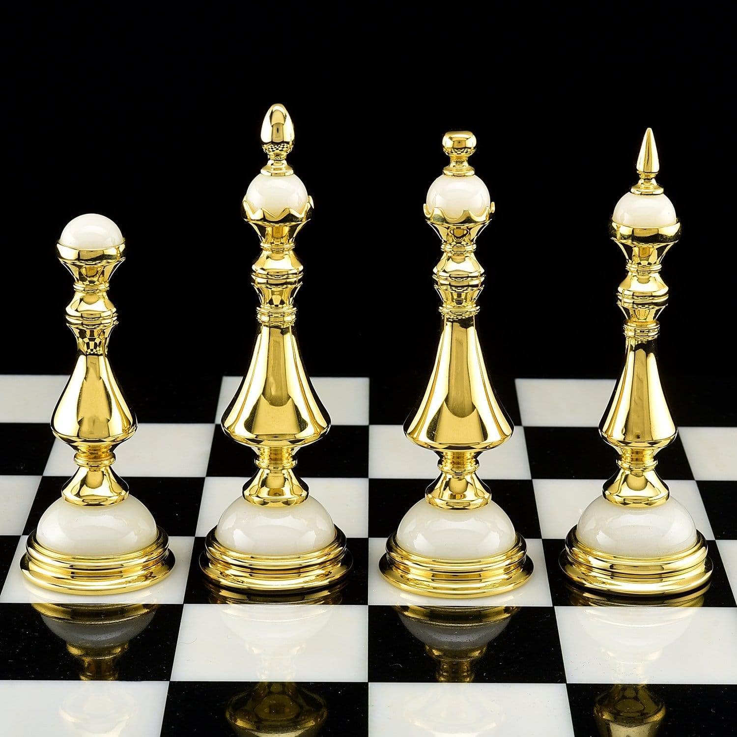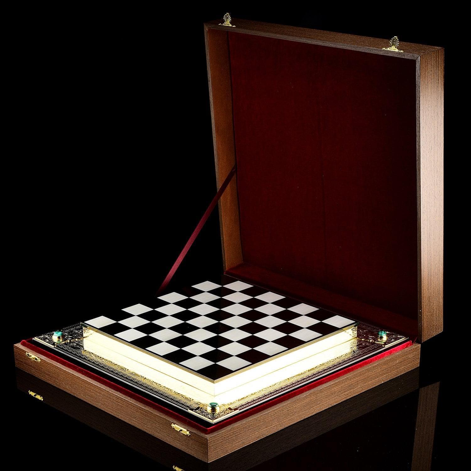 Из белого и черного мрамора с самоцветами в форме кабошонов и позолоченными элементами, декорированными в технике Златоустовской гравюры, эти шахматы представляют произведение российского декоративно-прикладного искусства. Мрамор (с латинского - блестящий камень, каменная глыба) как полезный и красивый минерал признан людьми во времена античности. Самоцвет нашли впервые в Греции. Там он являлся символом любви, греки использовали мрамор в скульптуре, строили из него храмы богам, в частности, богине любви Афродите. Для высвобождения магии камня, его носят в качестве украшения. Такой оберег привлекает любовь, оберегает от ревности, разрыва в отношениях. Он способствует скорейшему браку и рождению здоровых детей. В Древнем Риме считалось, что минерал не боится темной магии, поэтому из него сооружали дома, амулеты. В Индии его считают спутником добра. Люди верят, что каждая семья должна иметь дома хотя бы статуэтку из камня. Природная энергия мрамора укрепляет нервы, иммунитет.