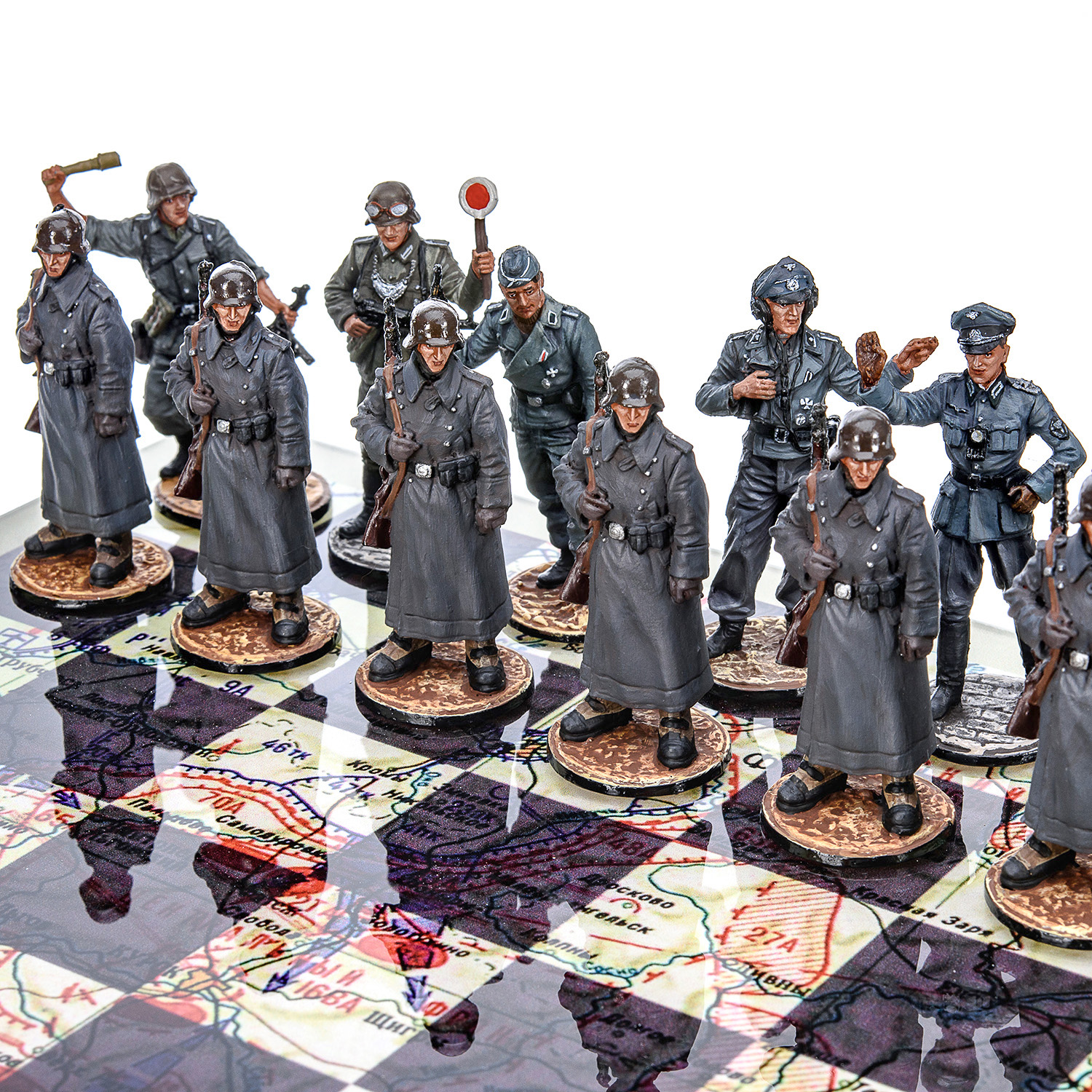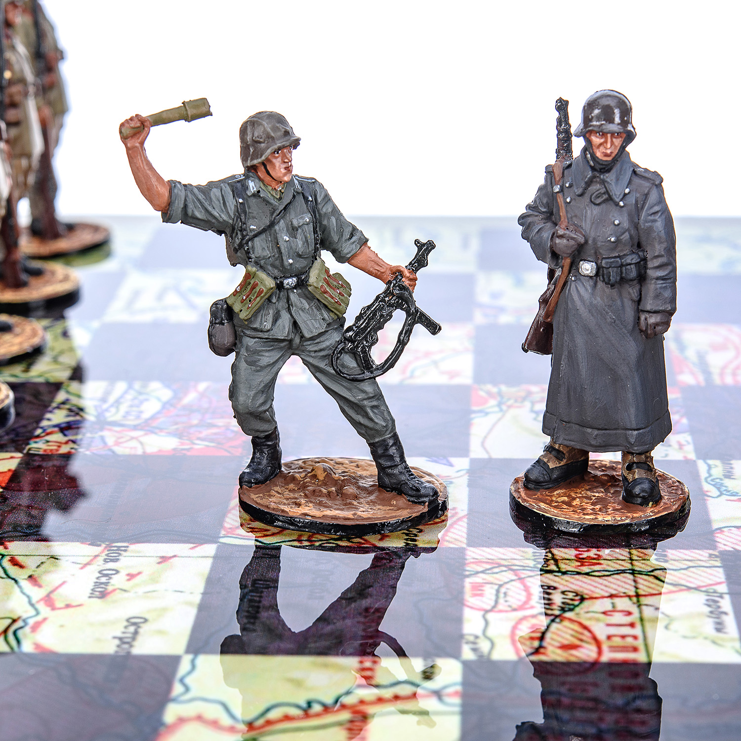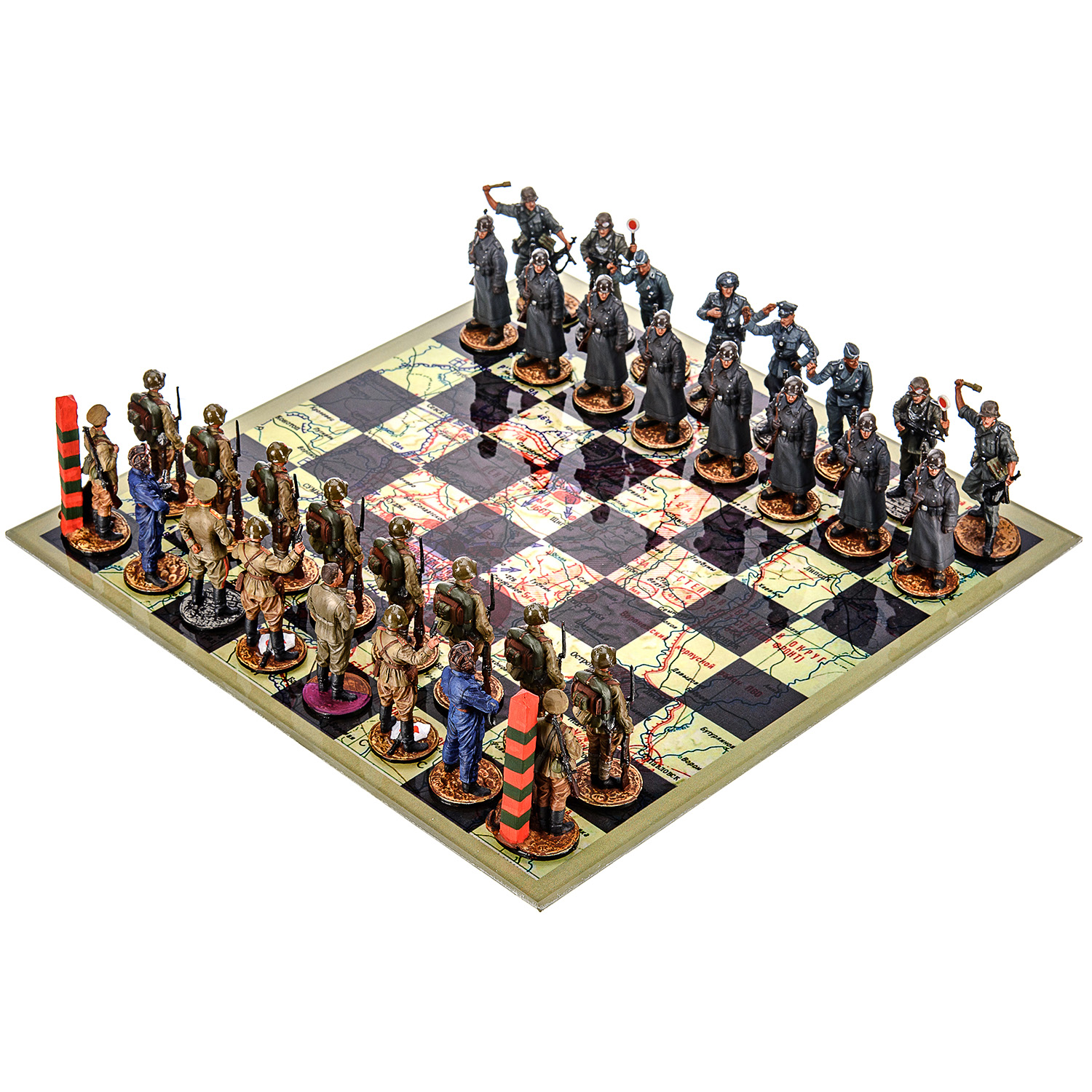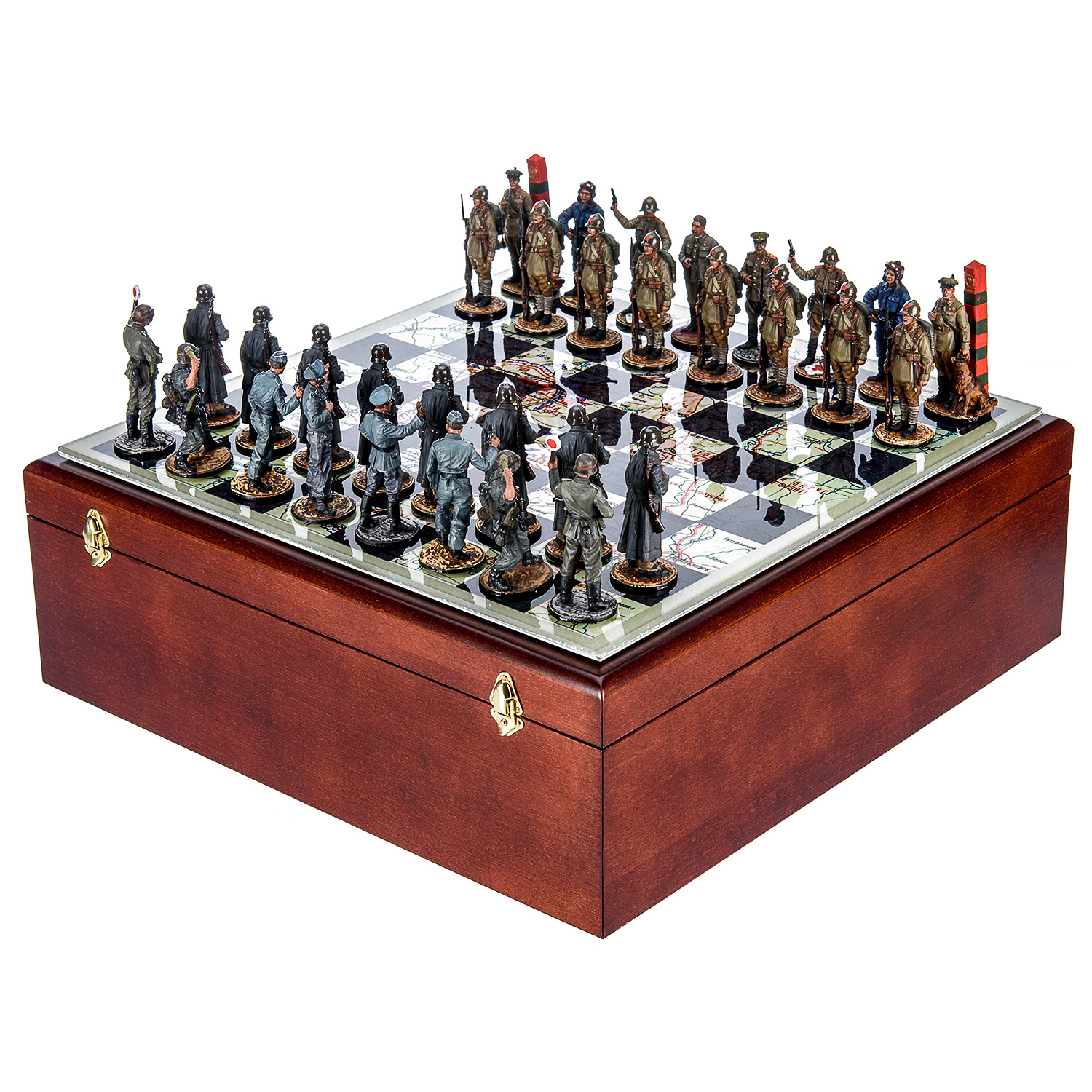 Шахматы коллекционные с оловянными фигурами на стеклянном игровом поле "Вторая Мировая война".