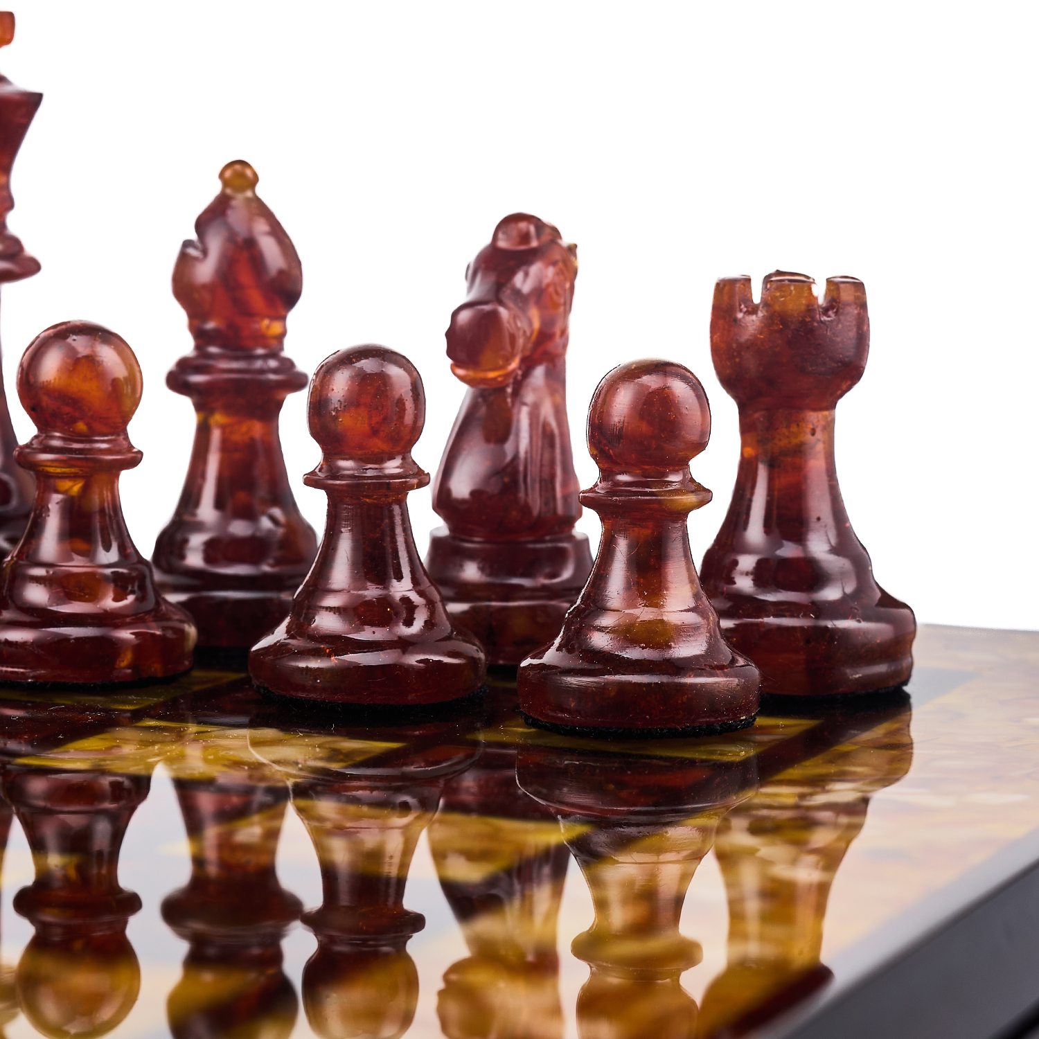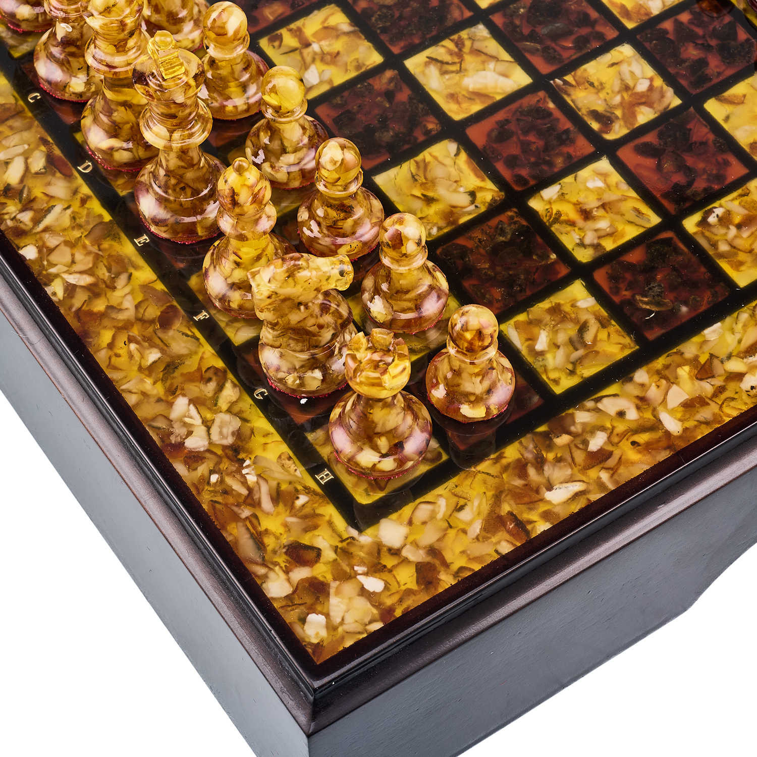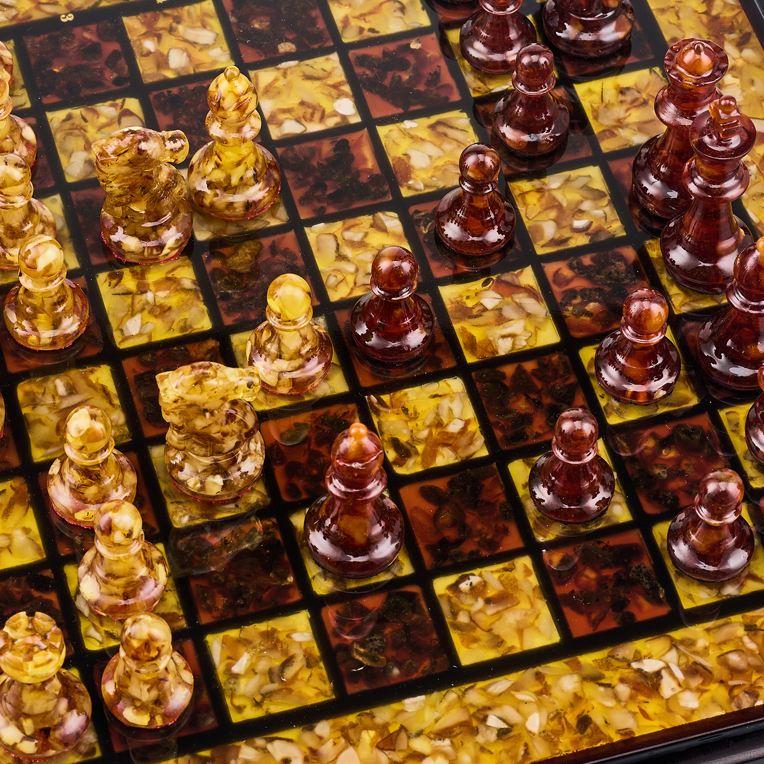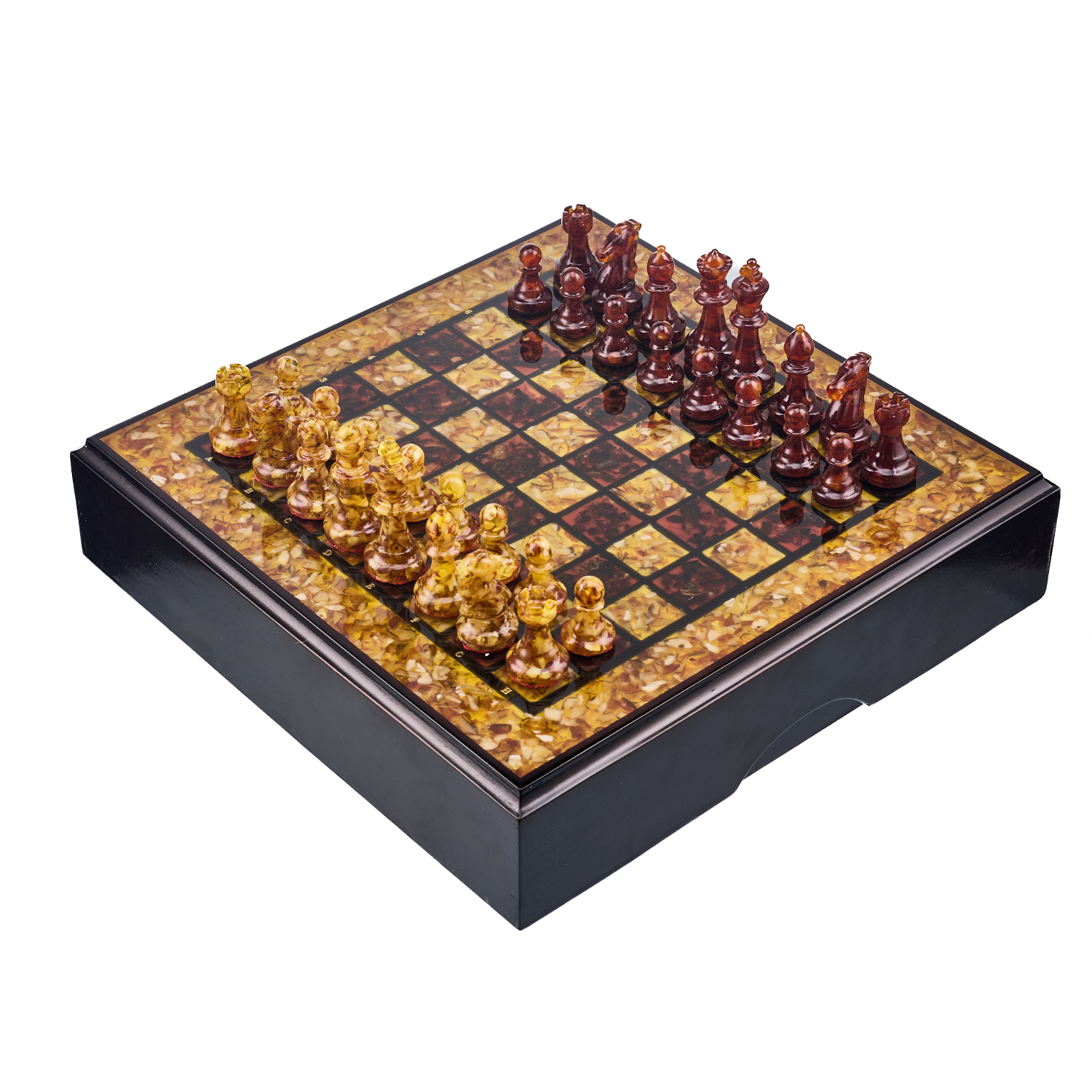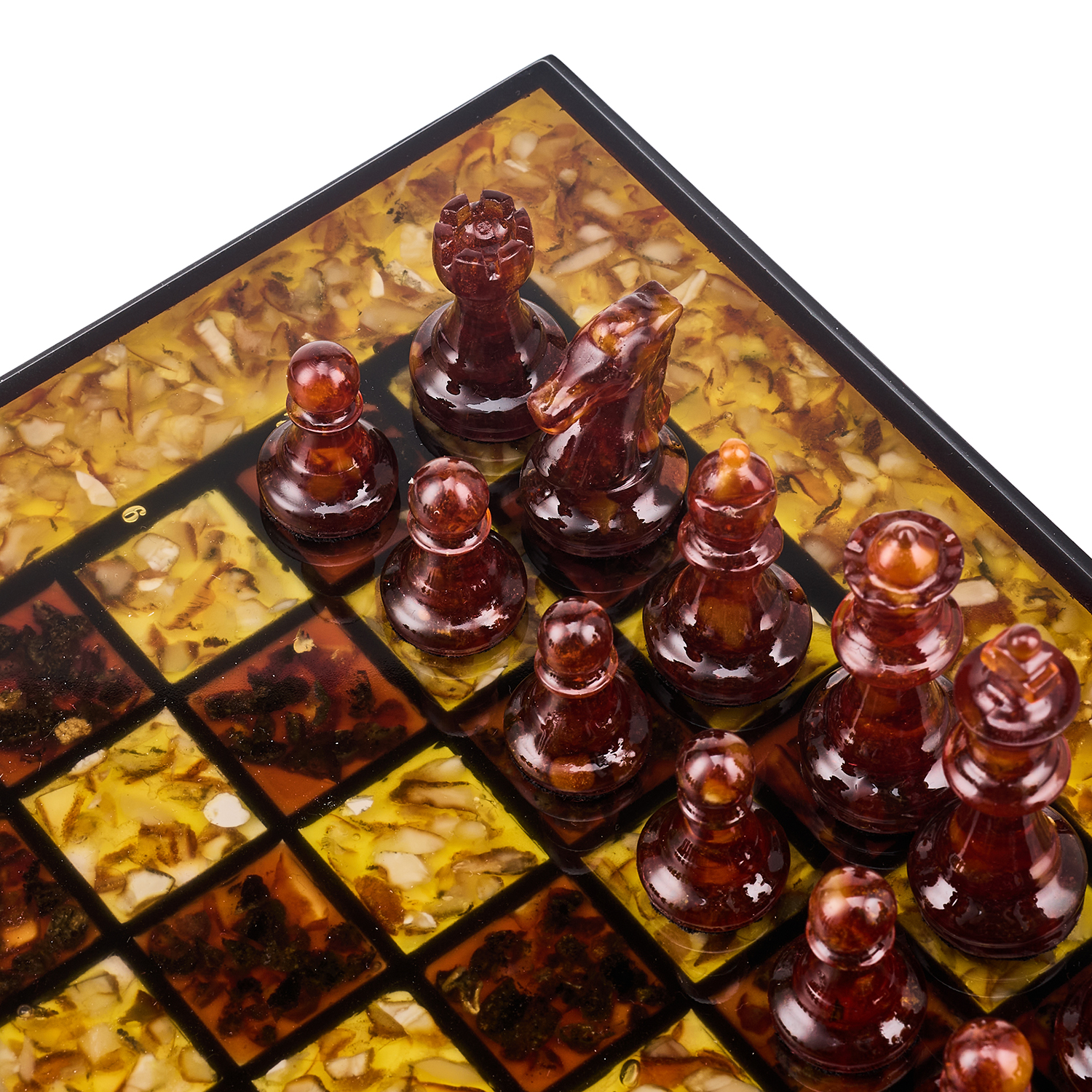 Шахматы с инкрустацией и фигурами из янтаря.
