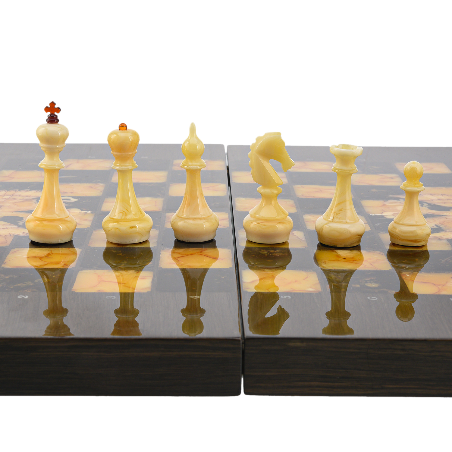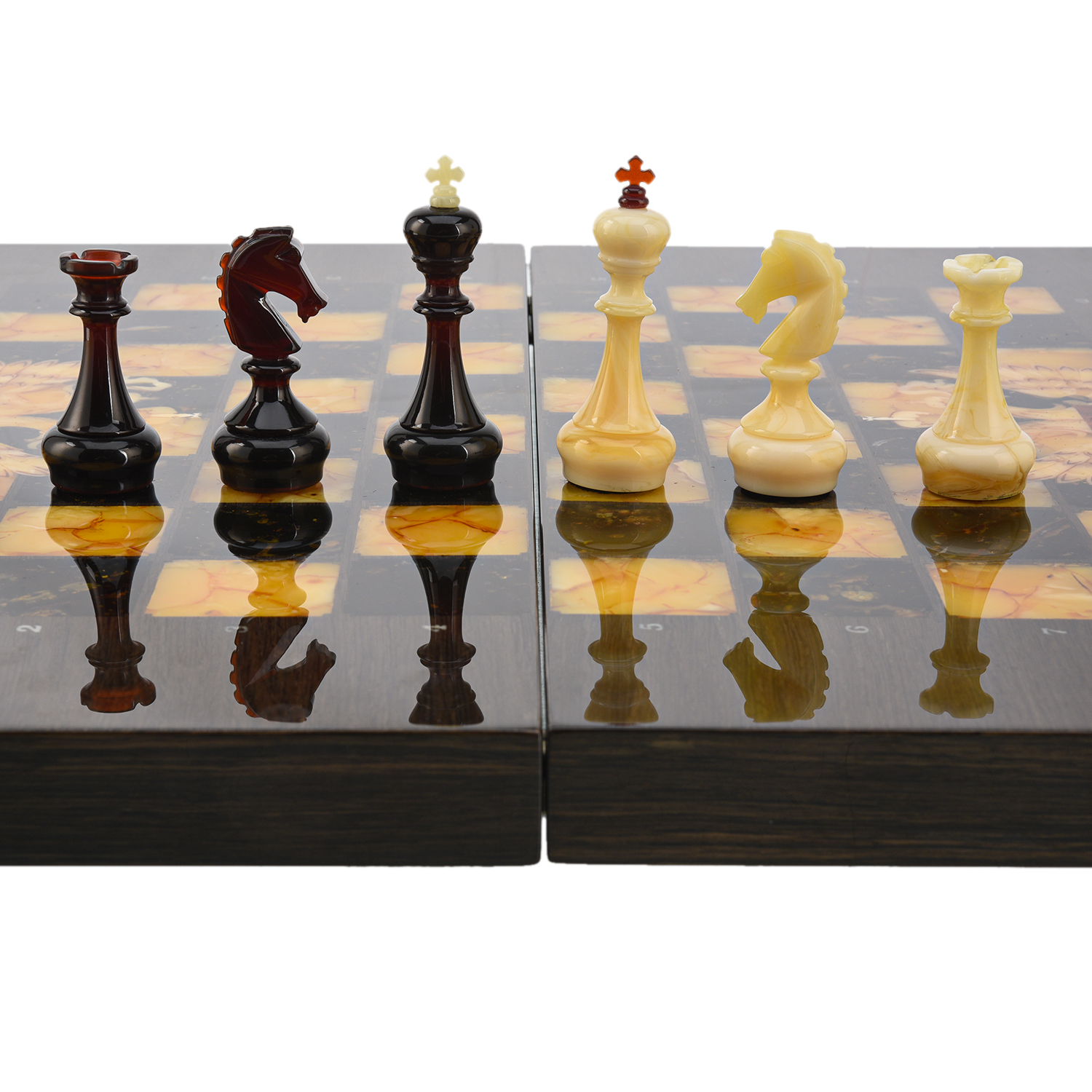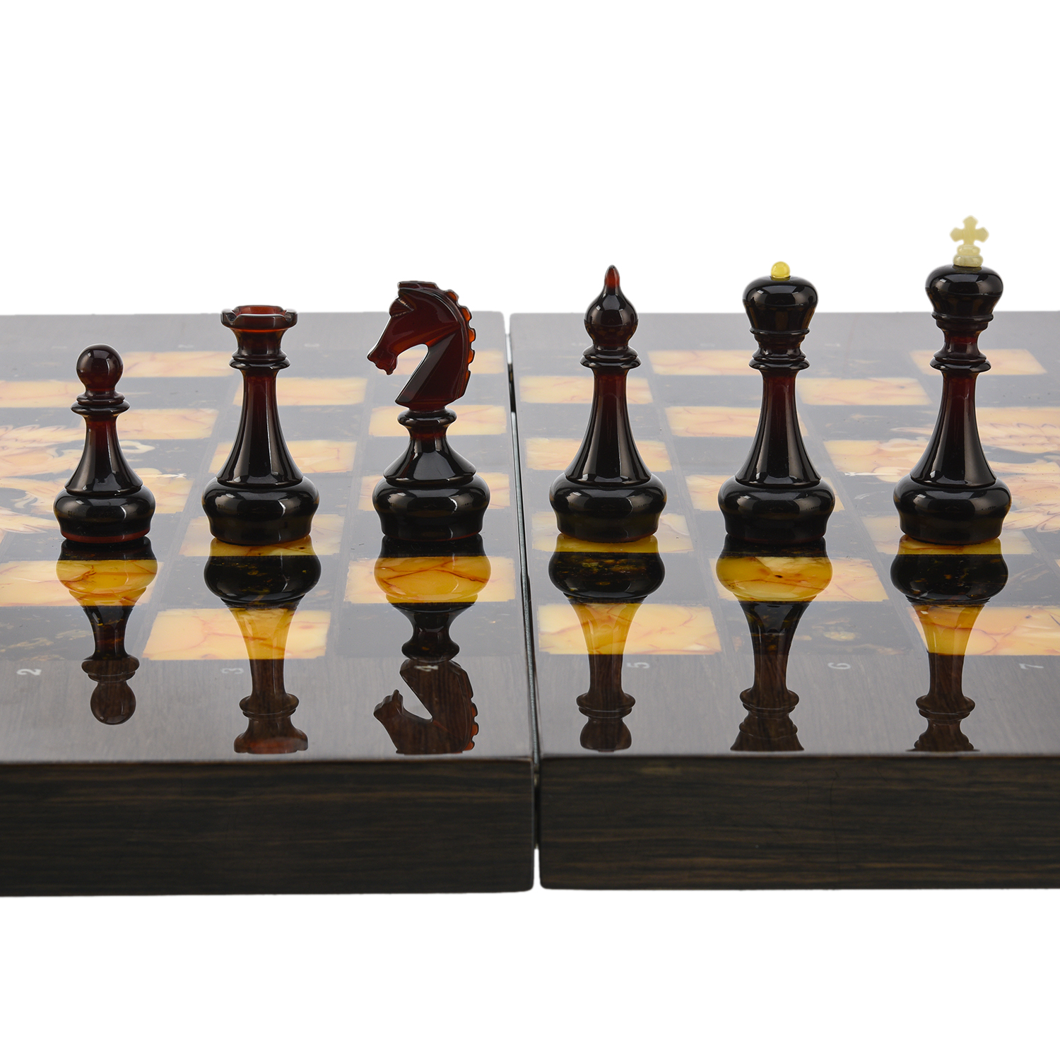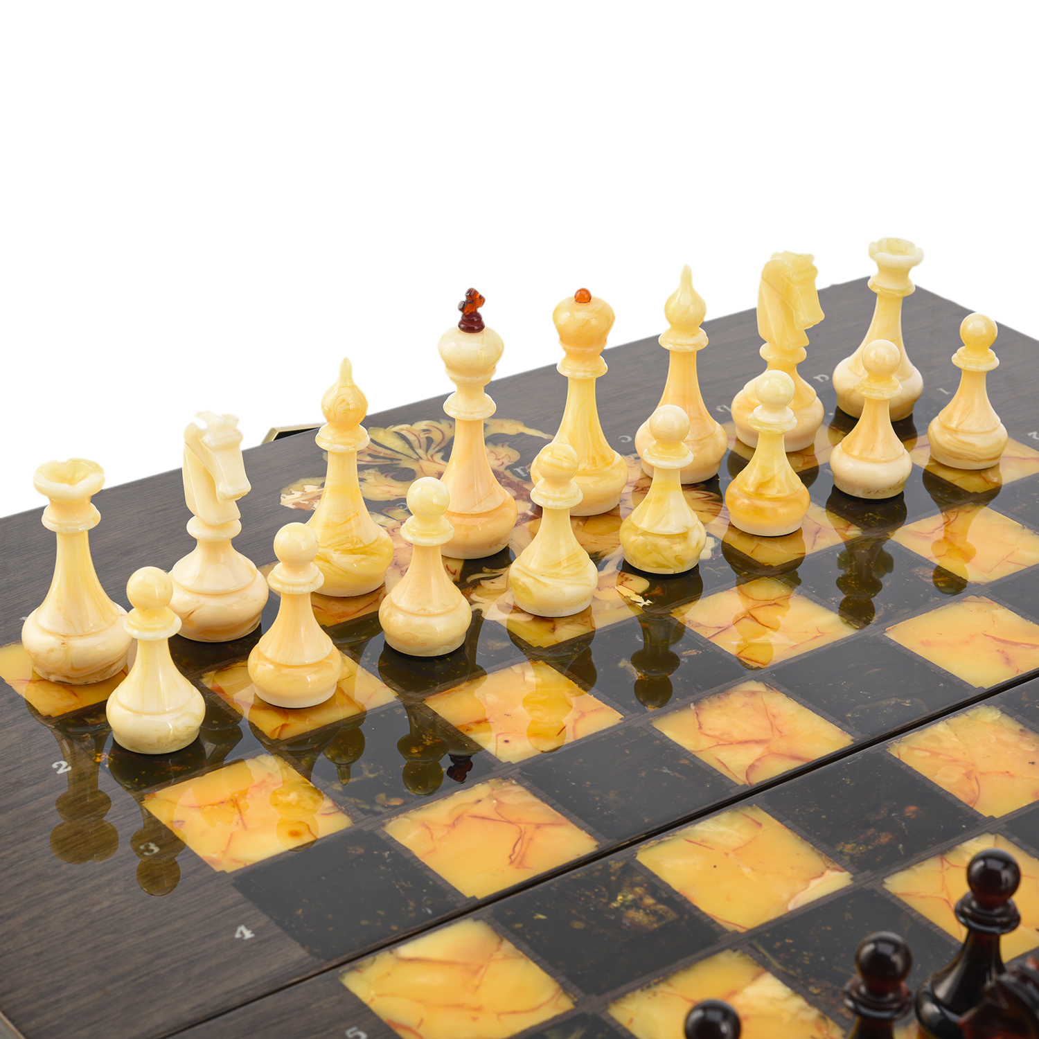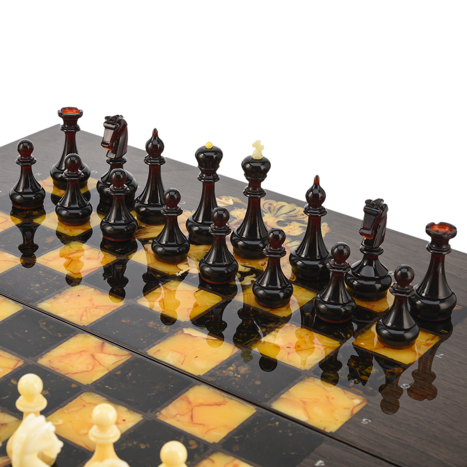 Шахматы из карельской березы с фигурами из янтаря 45х45 см