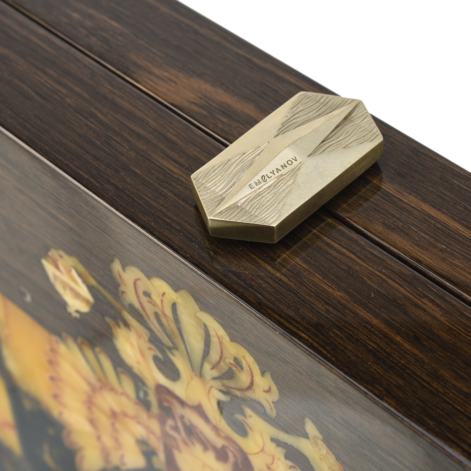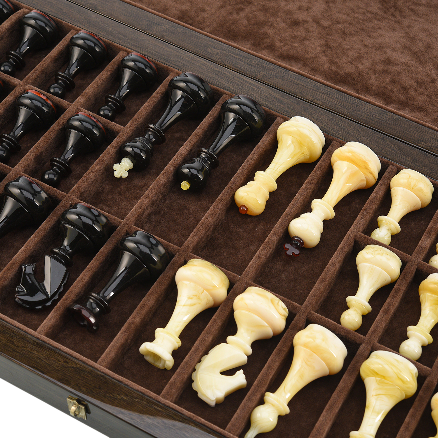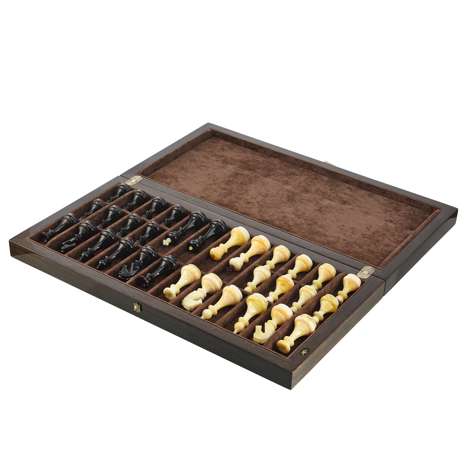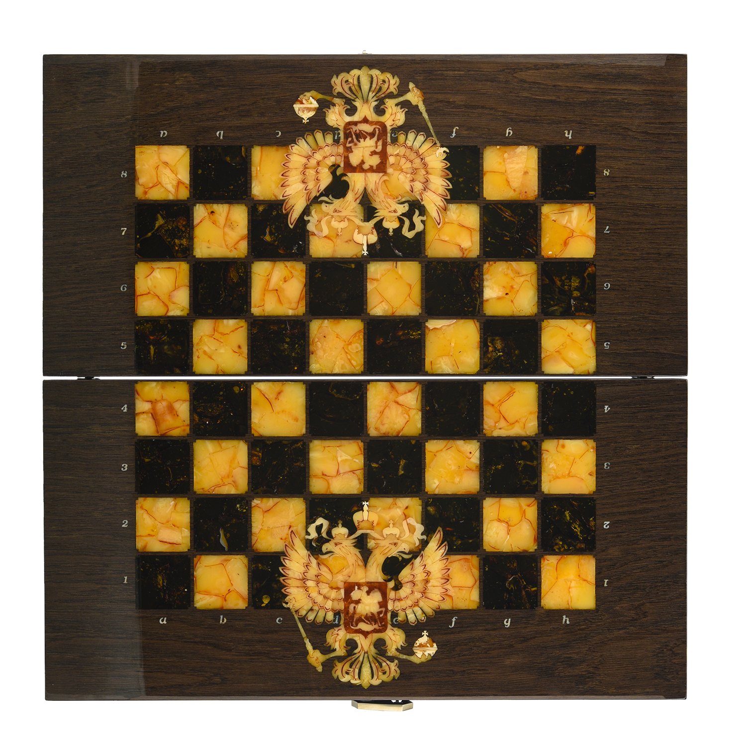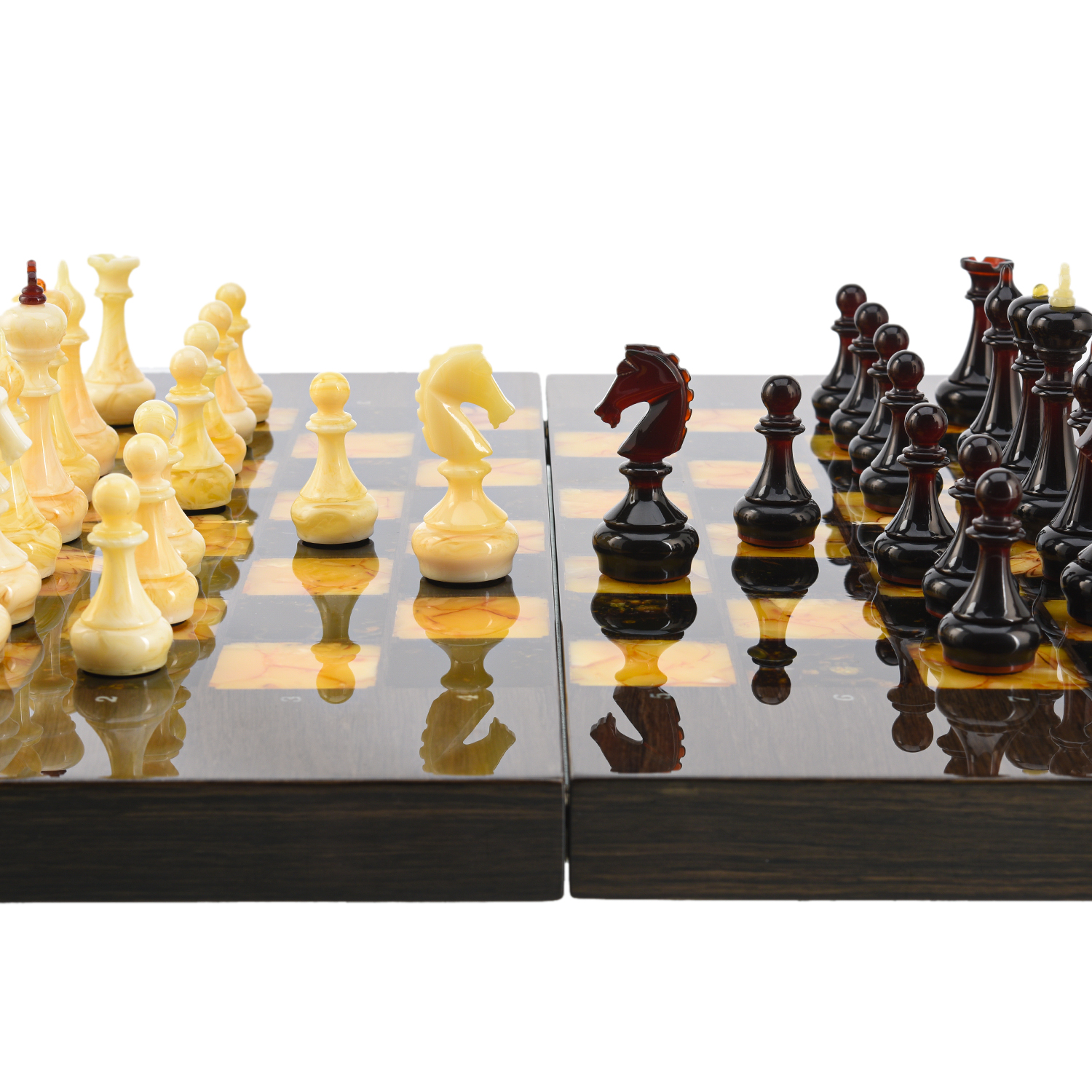 Шахматы из карельской березы с фигурами из янтаря 45х45 см