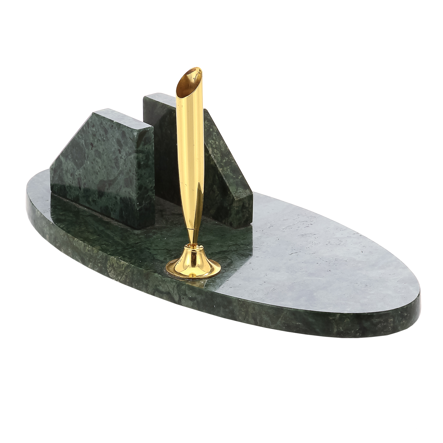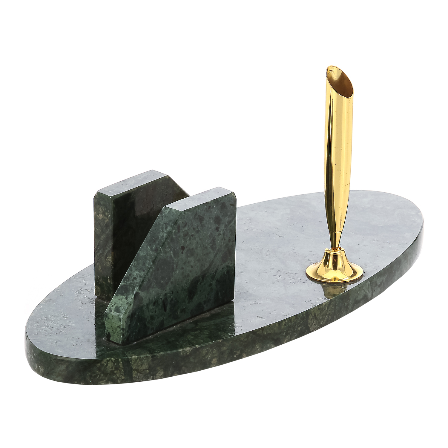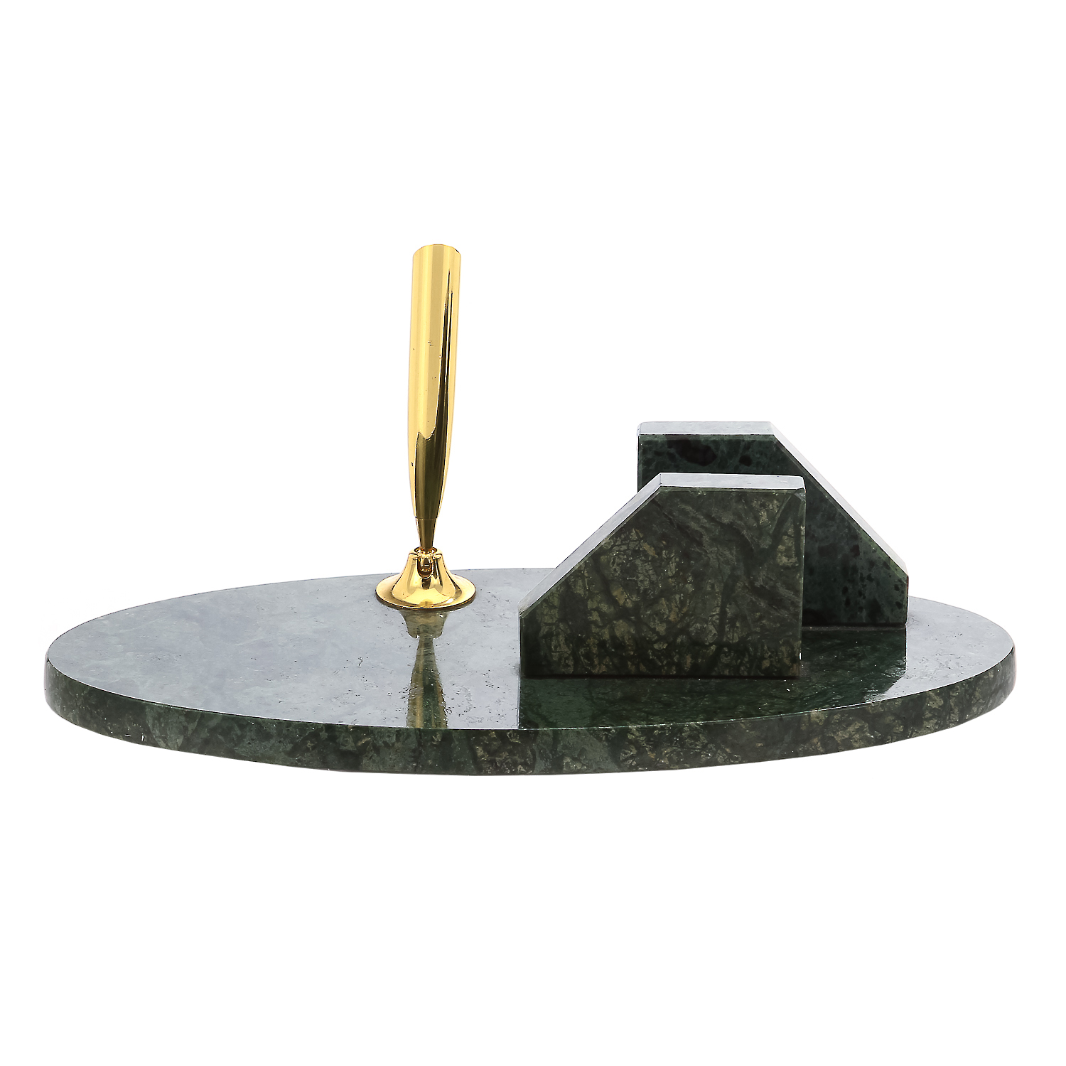 Классический письменный набор из красивого темно-зеленого мрамора пополнил наше собрание подарков для деловых людей. Письменный набор из мрамора включает в себя платформу, карандашницу, визитницу с двумя бортами и подставку под ручку. Стильный письменный набор из темно-зеленого итальянского мрамора станет хорошим памятным презентом коллеге, руководителю или другу. Классический письменный набор из красивого материала дополнит любой интерьер, поможет подчеркнуть хороший вкус человека.
