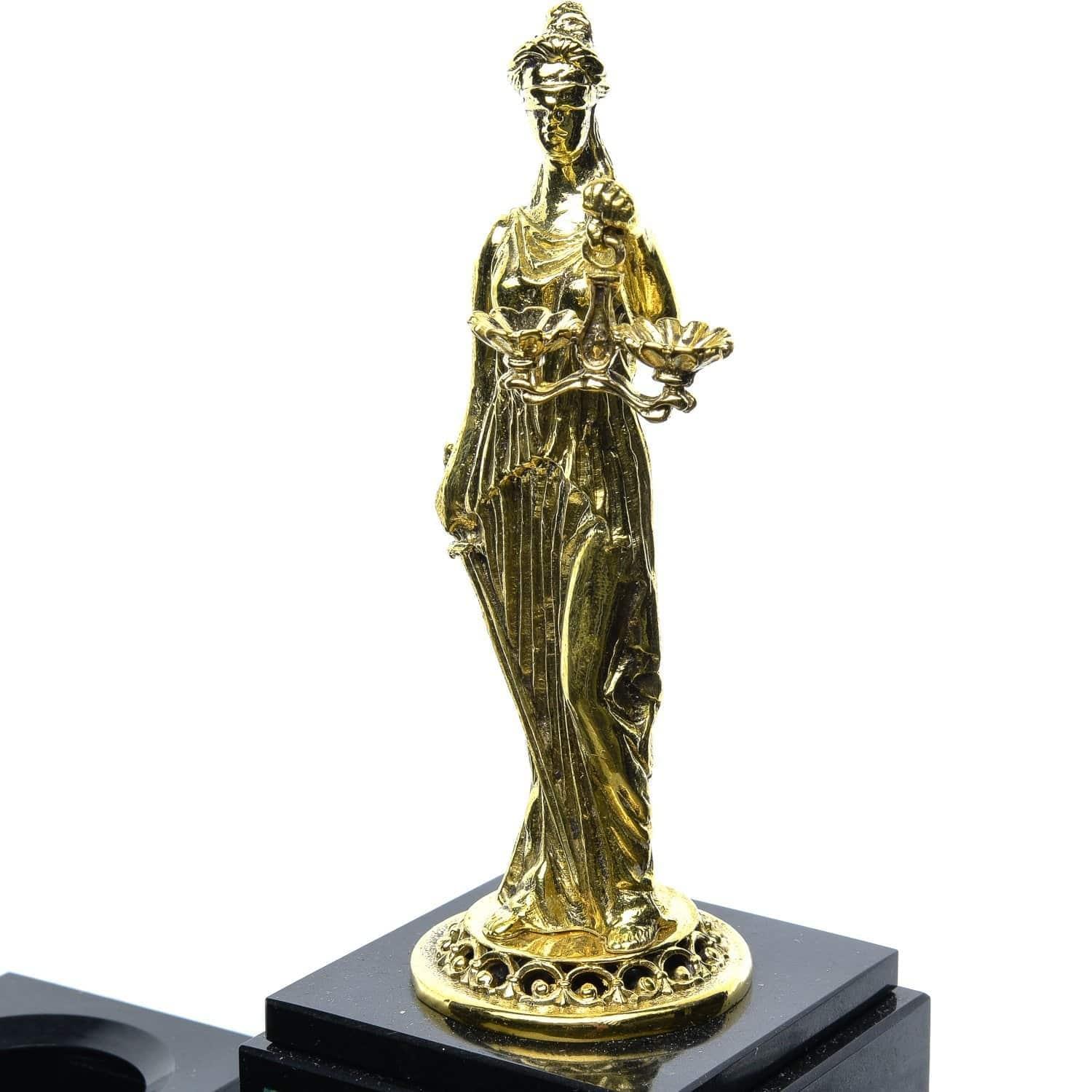 Набор для письменного - совместная авторская работа художников по камню и металлу. Корпуса набора изготовлены из поделочного камня березита; центральный корпус с часами увенчан скульптурой греческой богини правосудия Фемидой, второй супругой Зевса. Вашему вниманию - вариант представительного подарка для юриста, адвоката.