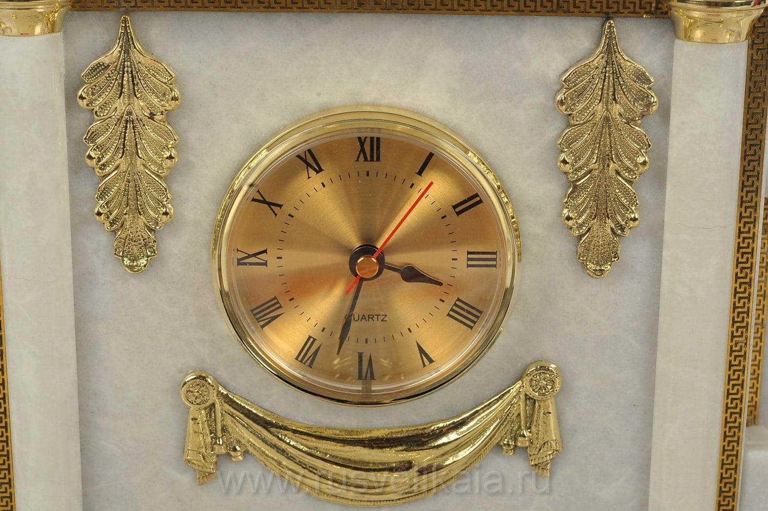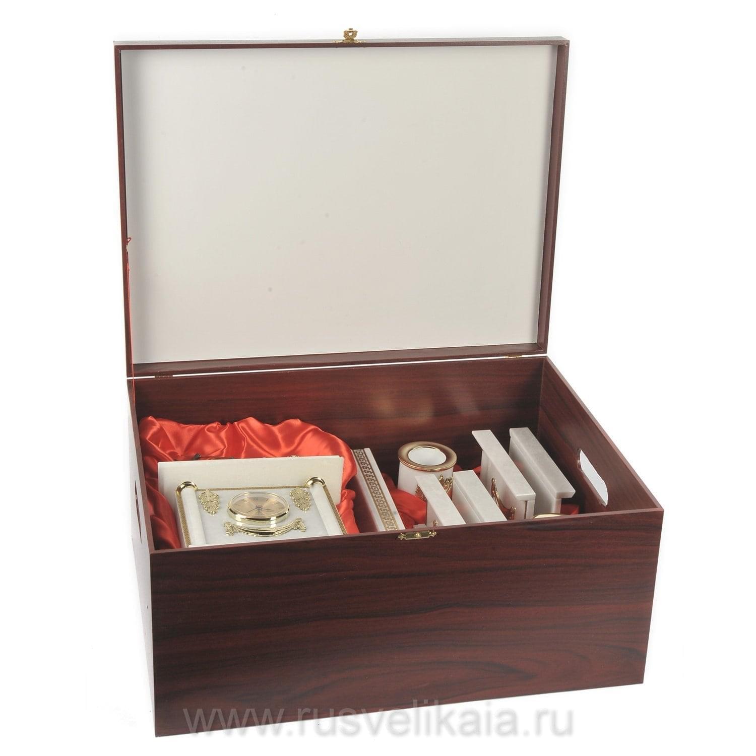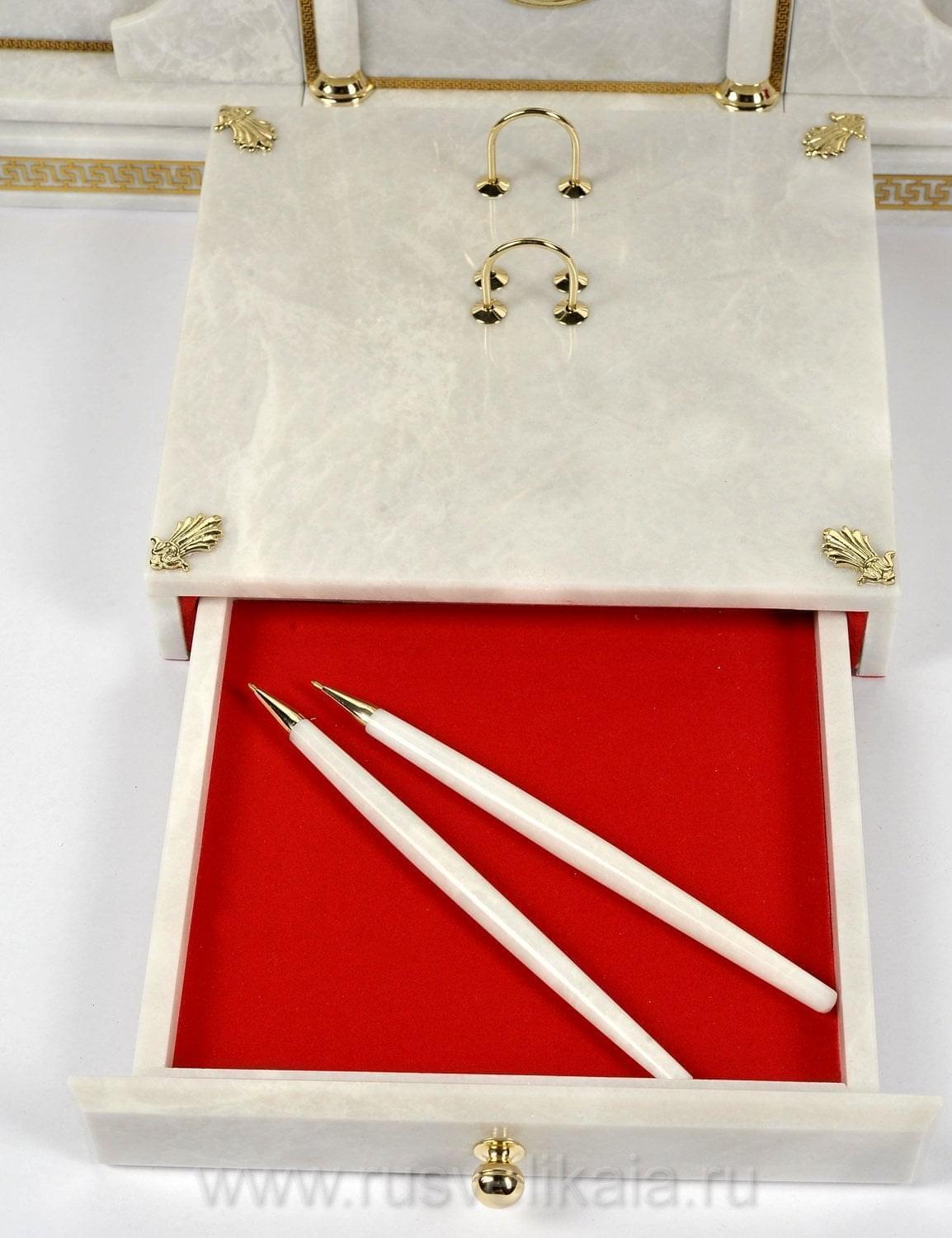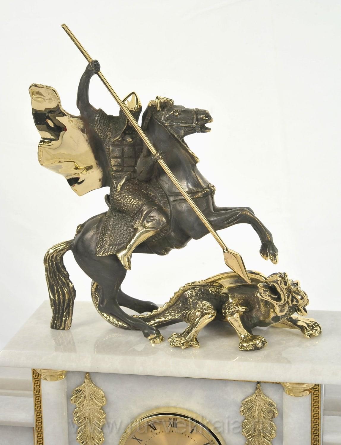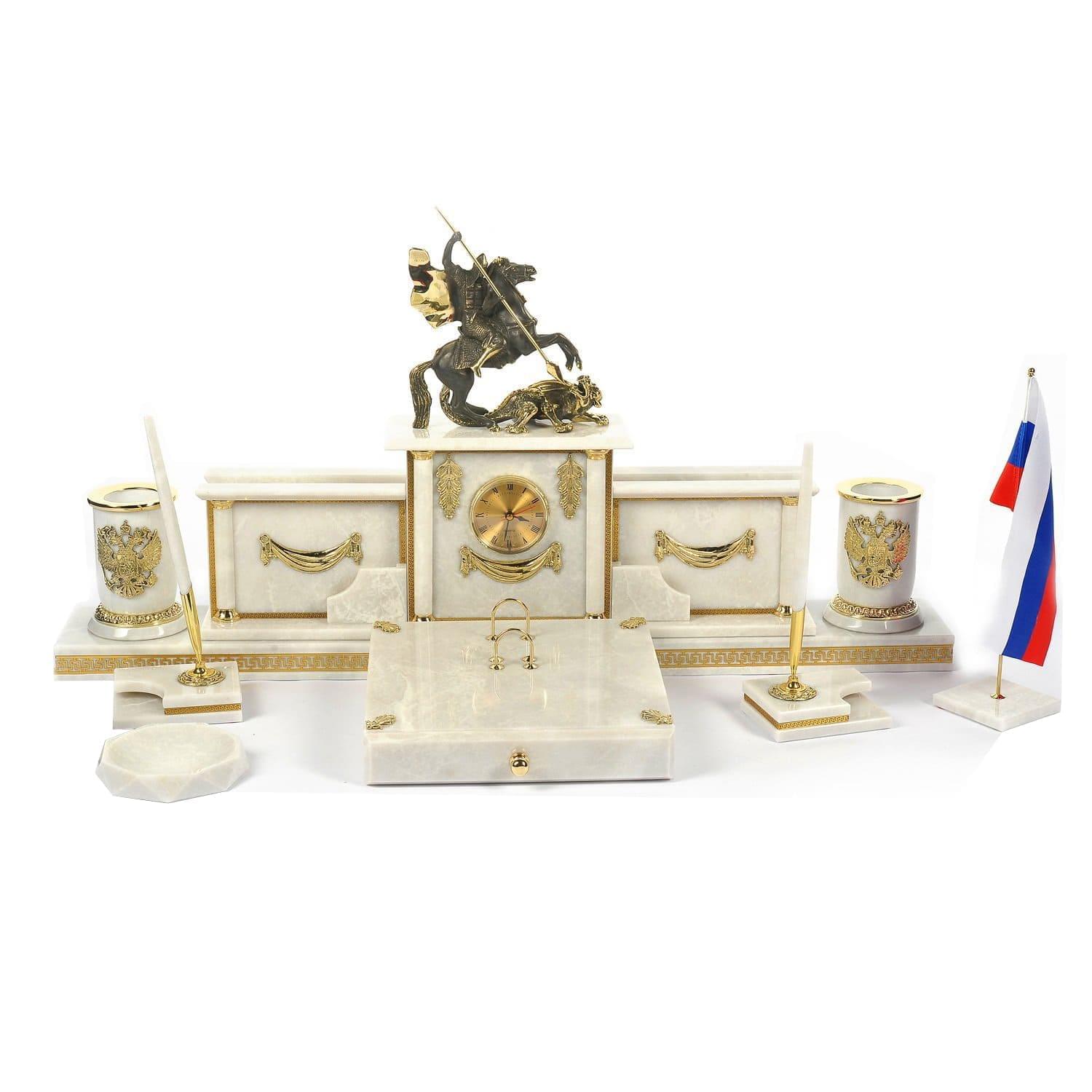 Заполучить на стол образ Святого и воина Георгия Победоносца - пункт № 1 в списке гос.закупок. Для рабочего стола президента, премьер-министра изготовлен настольный сет из нескольких каменных корпусов с позолоченными декоративными элементами, напоминающий архитектурный ансамбль. Рады предложить Вашему вниманию совместную работу российских художников по камню и металлу, часовых дел мастеров. В качестве поделочного материала для предметов набора использован итальянский мрамор, названный "душой мироздания".