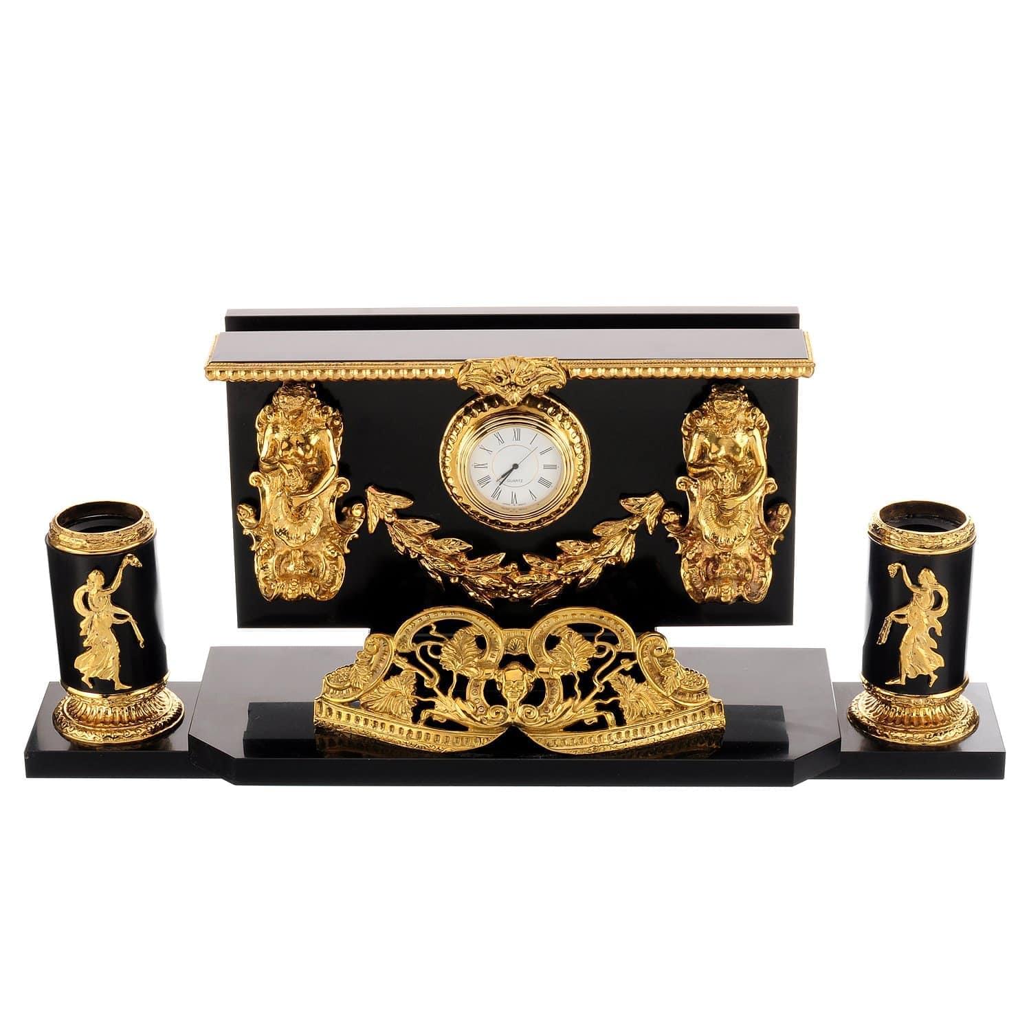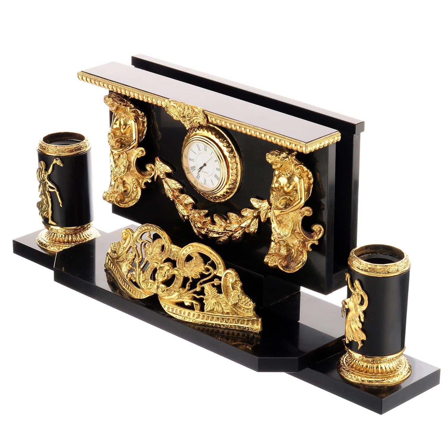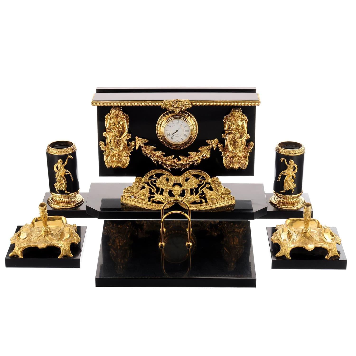 Корпуса набора выточены вручную из долерита - камня, обладающего чудесными природными свойствами. Он усмиряет гнев и раздражение, помогает собраться с мыслями и силами. Позолоченные детали, украшающие каменные корпуса, являются образцами бронзового литья. Это старинный народный промысел, а его штучные образцы со временем обретают высокую антикварную ценность. Бронза представляет собой сплав на основе меди с небольшой долей компонента, а медь гармонизирует пространство вокруг себя, нейтрализует вредные воздействия электроизлучений и геопатогенных зон. Она усиливает природные свойства натурального камня.