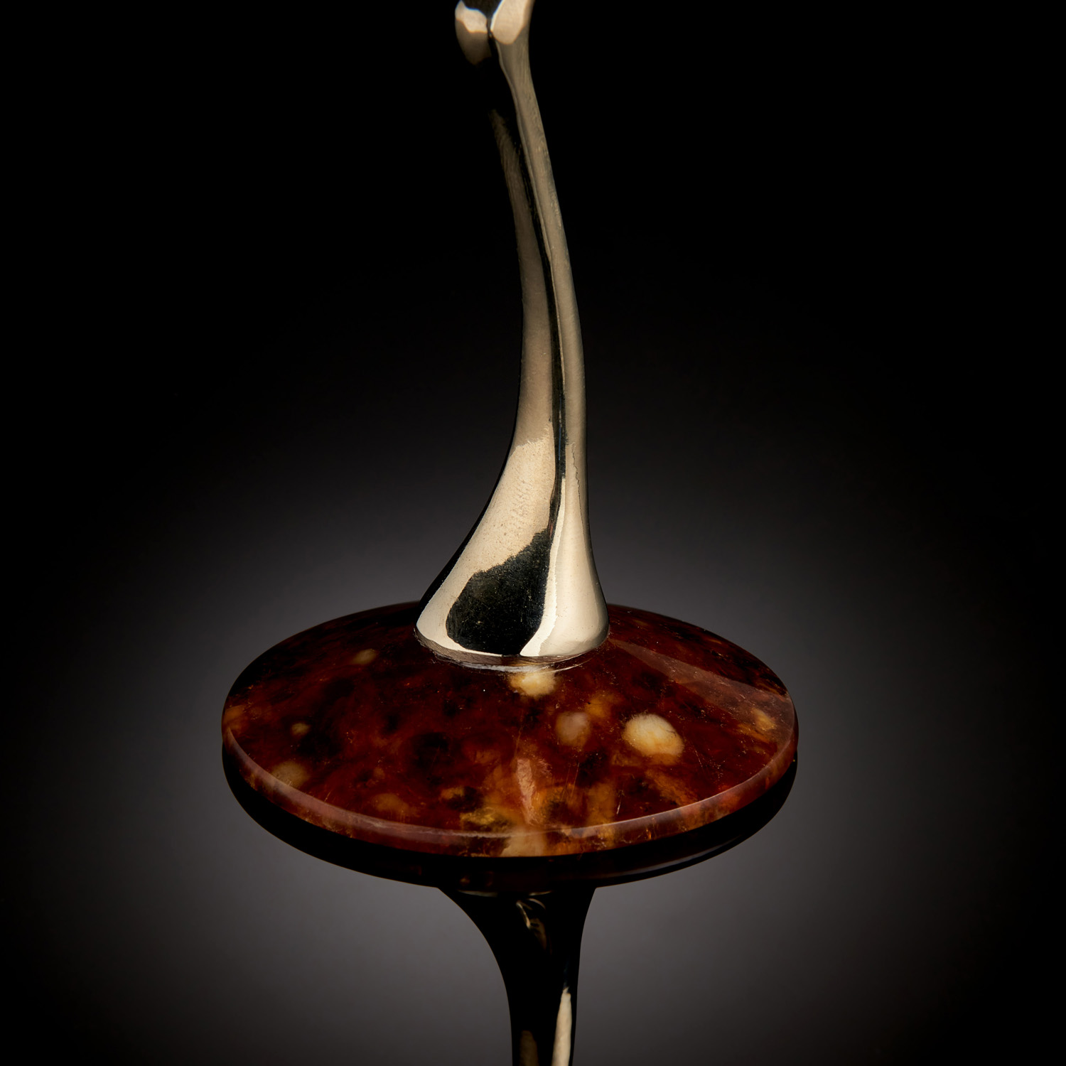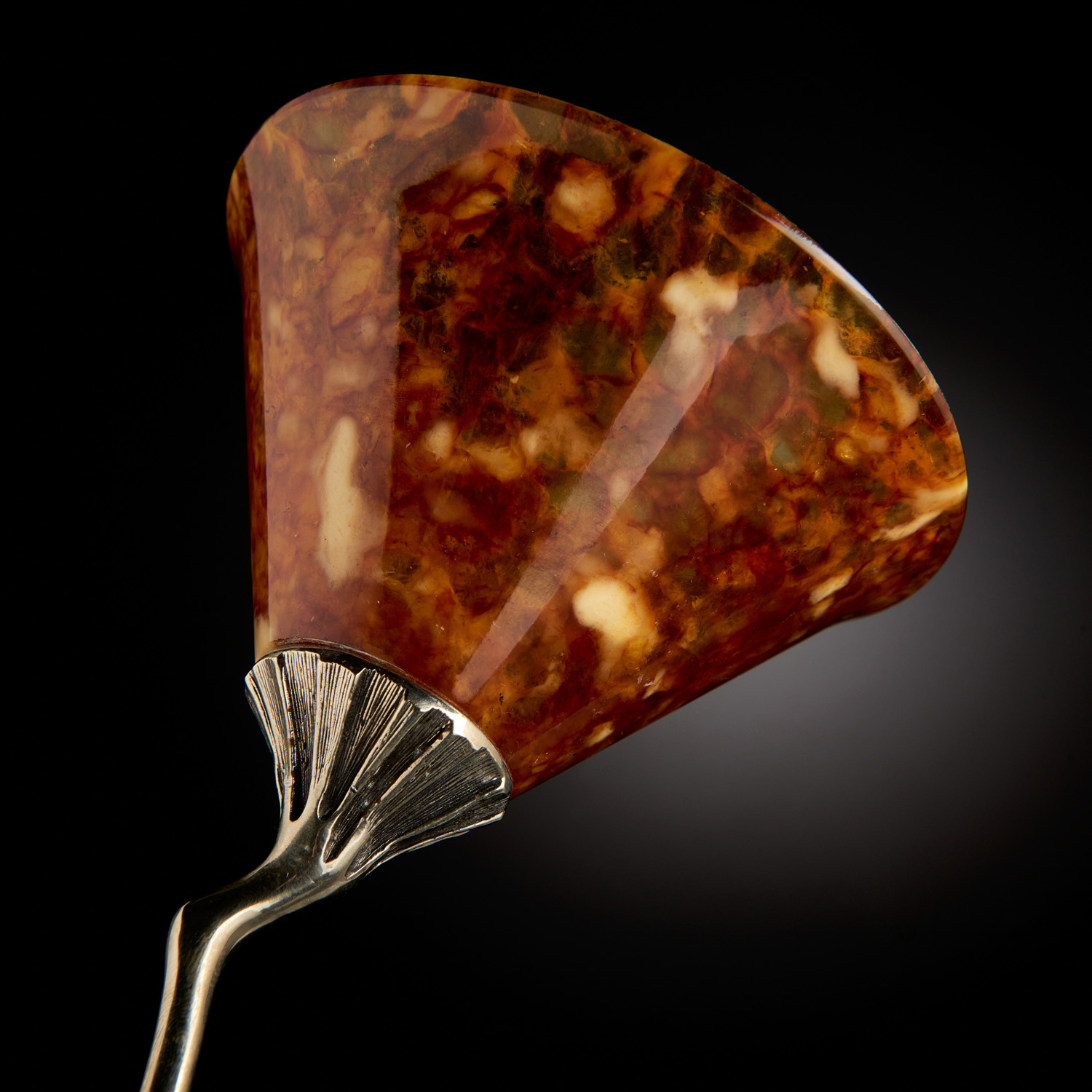Бокал для мартини «Лето» выполнен из натурального янтаря медового цвета. Он не зря получил такое название. Ведь при одном взгляде на янтарь создаётся впечатление, что он хранит в себе лучи солнца. От этого камня веет теплотой и благородством. Бокал имеет изысканные очертания. Тонкая изящная ножка сделана из бронзы, цвет которой идеально дополнен мягким сиянием натурального янтаря. Бокал выполнен талантливым мастером по авторскому эскизу вручную. Причудливые янтарные узоры делают его действительно эксклюзивным. Ведь второго такого же найти просто не получится.