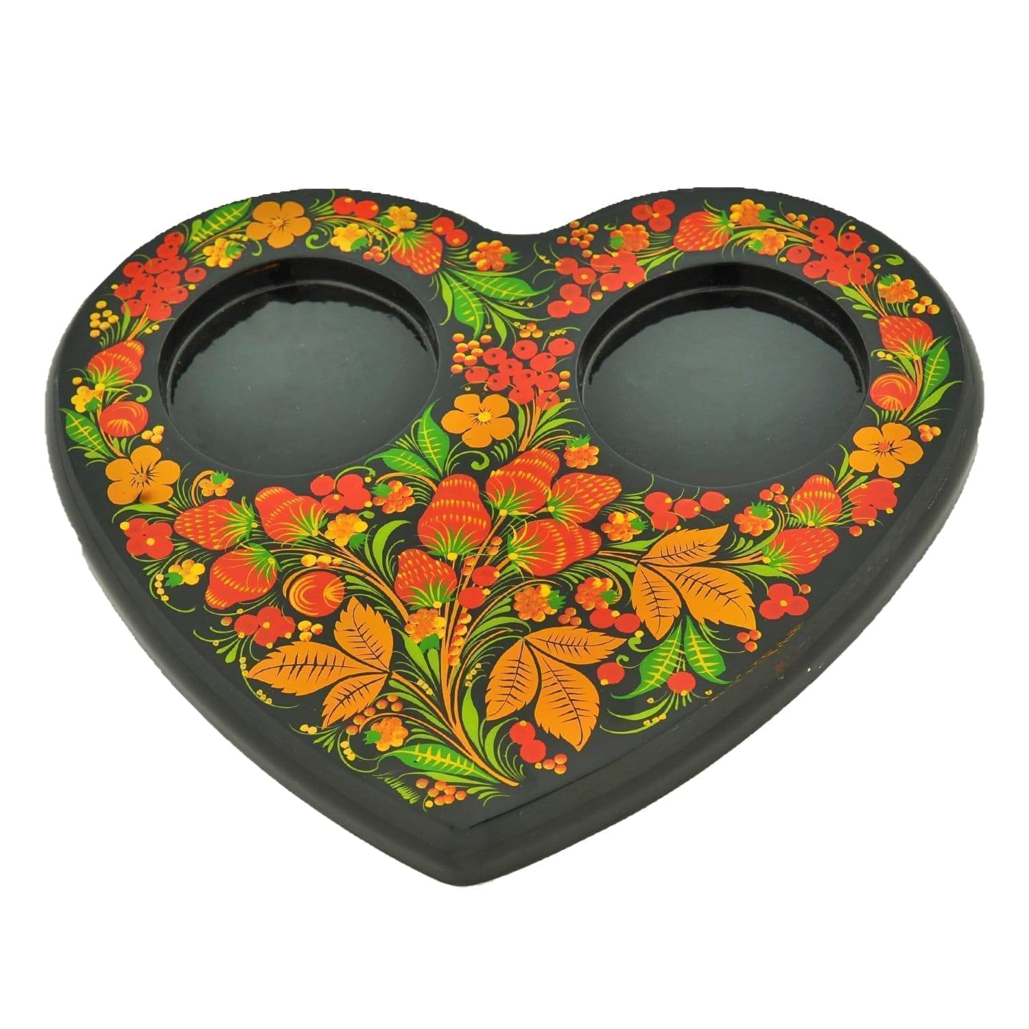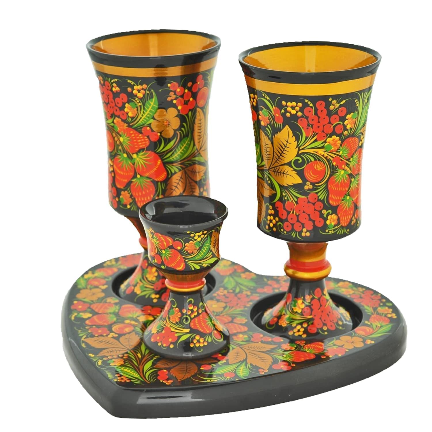 Для влюбленных! Вариант подарка в русском стиле на Свадьбу. Оригинальный набор включает пару стопок с с мини-стопочкой под соль, которые располагаются на плоском подносе в форме сердца. Эта авторская посуда ручного производства из дерева декорирована в технике хохломской росписи. Алкоголь покажется небывало вкусным в деревянных стопках Хохлома.