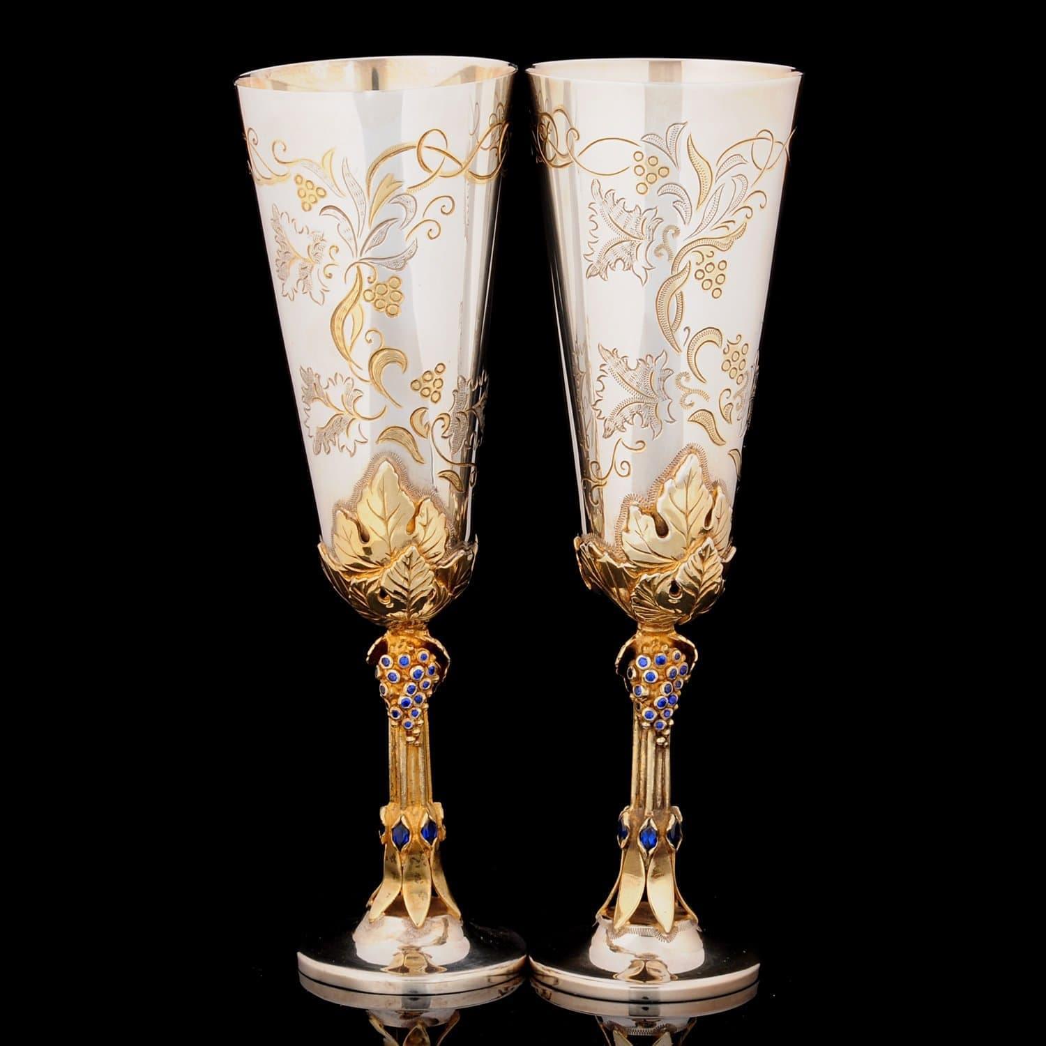 Серебряные фужеры украсят свадебный стол новобрачных, подчеркнув торжественность события. Более того, они останутся у них еще на долгие годы, положив начало коллекции фамильного серебра. Изделия станут частью семейной истории, которая свяжет поколения. Изысканные сосуды украшены гравировкой и позолотой, изображающей гроздья винограда. Однако, главной «изюминкой» изделия является потрясающая позолоченная ножка. Ее верх выполнен в виде листа с гроздью винограда, который придерживает чашу фужера. Ягоду Диониса имитируют синие фианиты, которые «играют» на свету. Переход от ножки к основанию выполнен ажурно, что придает изделию легкость и изящество.