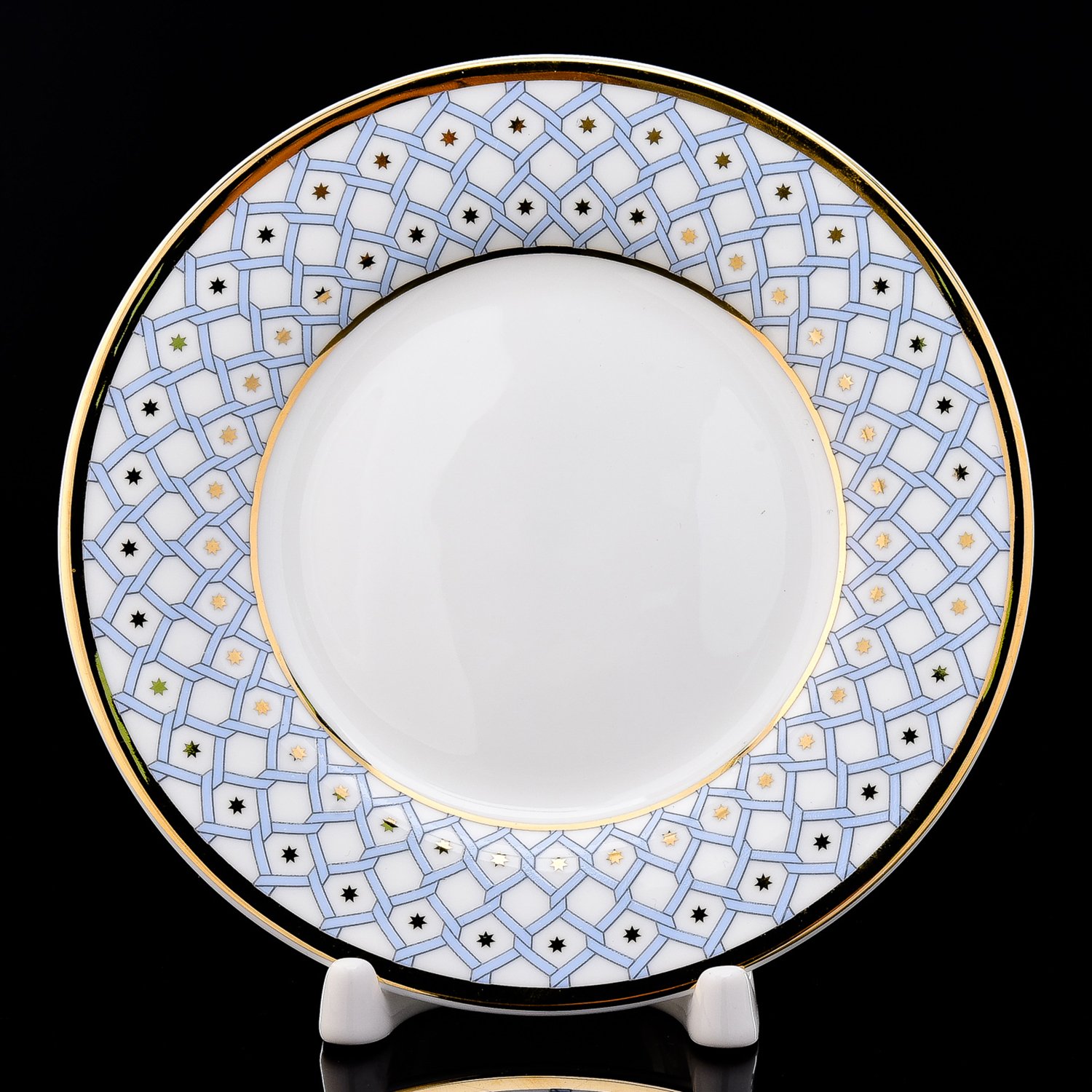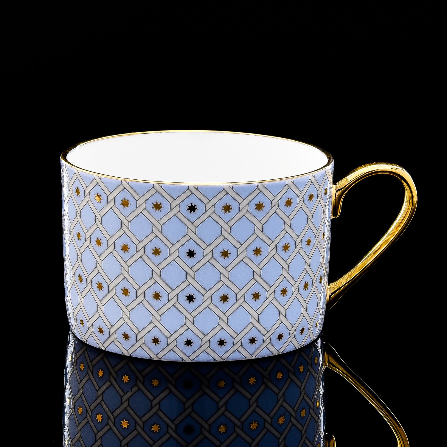 Чашка с блюдцем носит название «Азур», что в переводе с французского означает оттенок синего цвета (от небесно-голубого до насыщенно-синего), один из геральдических цветов. Еще азур - это группа органических красителей и наименование халцедона-хризоколлы (минерала темно-синего и голубого цветов (с персидского - лазурь, синева). Сделана посуда из костяного фарфора, украшена надглазурной полихромной позолотой. Создала рисунок талантливый молодой художник, продолжающий славные традиции петербургской школы искусства фарфора, Юлия Чистякова. Чайная пара отличается изысканным декором на тему знаменитой росписи Императорского фарфорового завода «Кобальтовая сетка», прототипом которой является Собственный сервиз Елизаветы Петровны середины 18 века. Современная роспись строится по образцу популярной в середине 18 века «трельяжной решетки», отвечающей вкусам эпохи рококо. Строгий геометрический декор, задающий основной ритм, художник смягчает мягкими заливками цвета и золотыми акцентами в виде изображений рождественской звезды. Размер: чашка (250 мл) - высота 5,5 см; диаметр 8,5 см. блюдце - диаметр 15 см. «Артикул завода изготовителя: 81.26829.00.1»