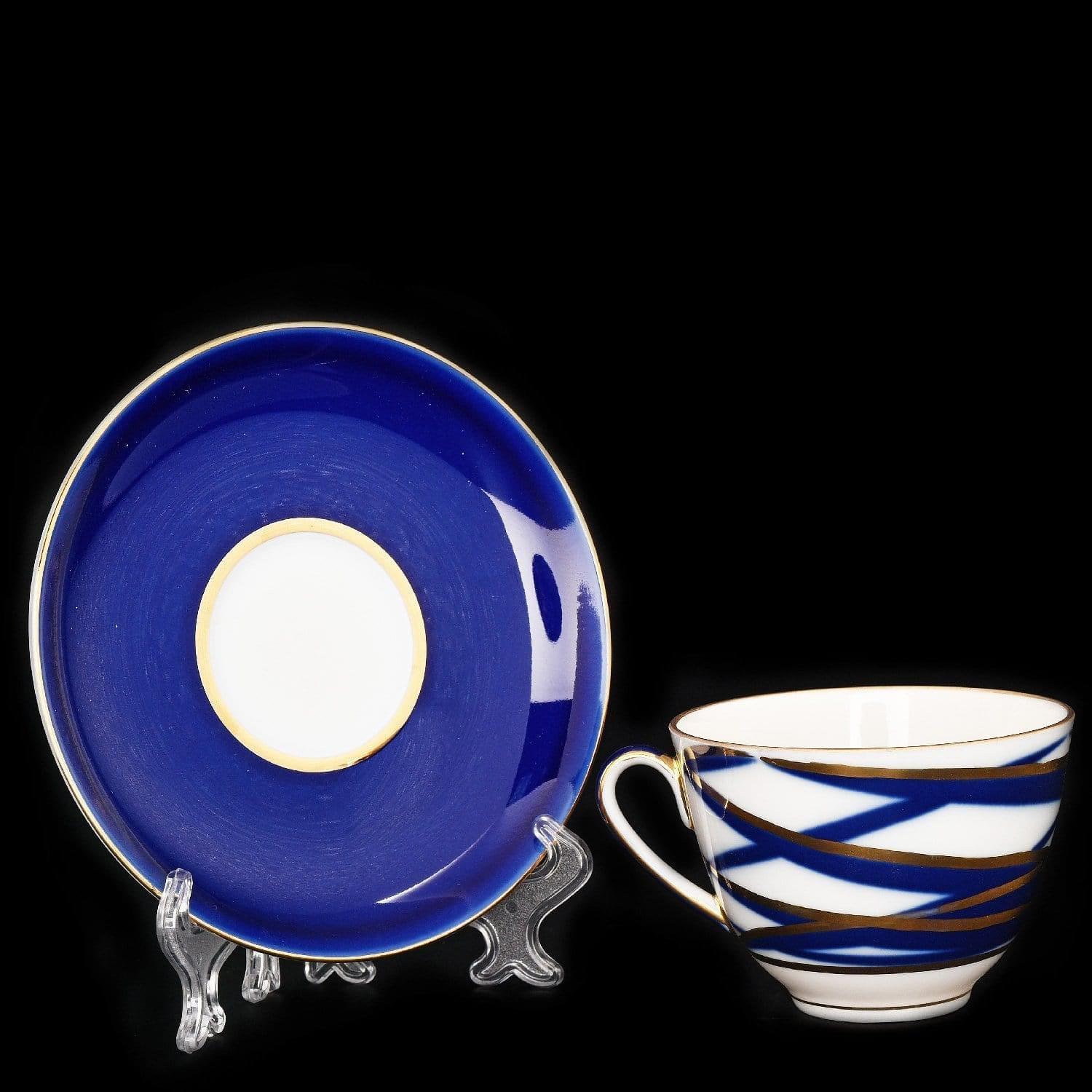 Их корпуса изготовлены из русского "белого золота" - твёрдого, не пористого фарфора, прошедшего обжиг в печи при температуре около 1500 градусов. Форма чашки с блюдцем называется "Весенняя". Роспись выполнена в технике деколь, предполагающей нанесение рисунка на поверхность фарфора с бумажного листа. Позолота нанесена от руки поверх защитных слоев прозрачной стеклянной глазури.