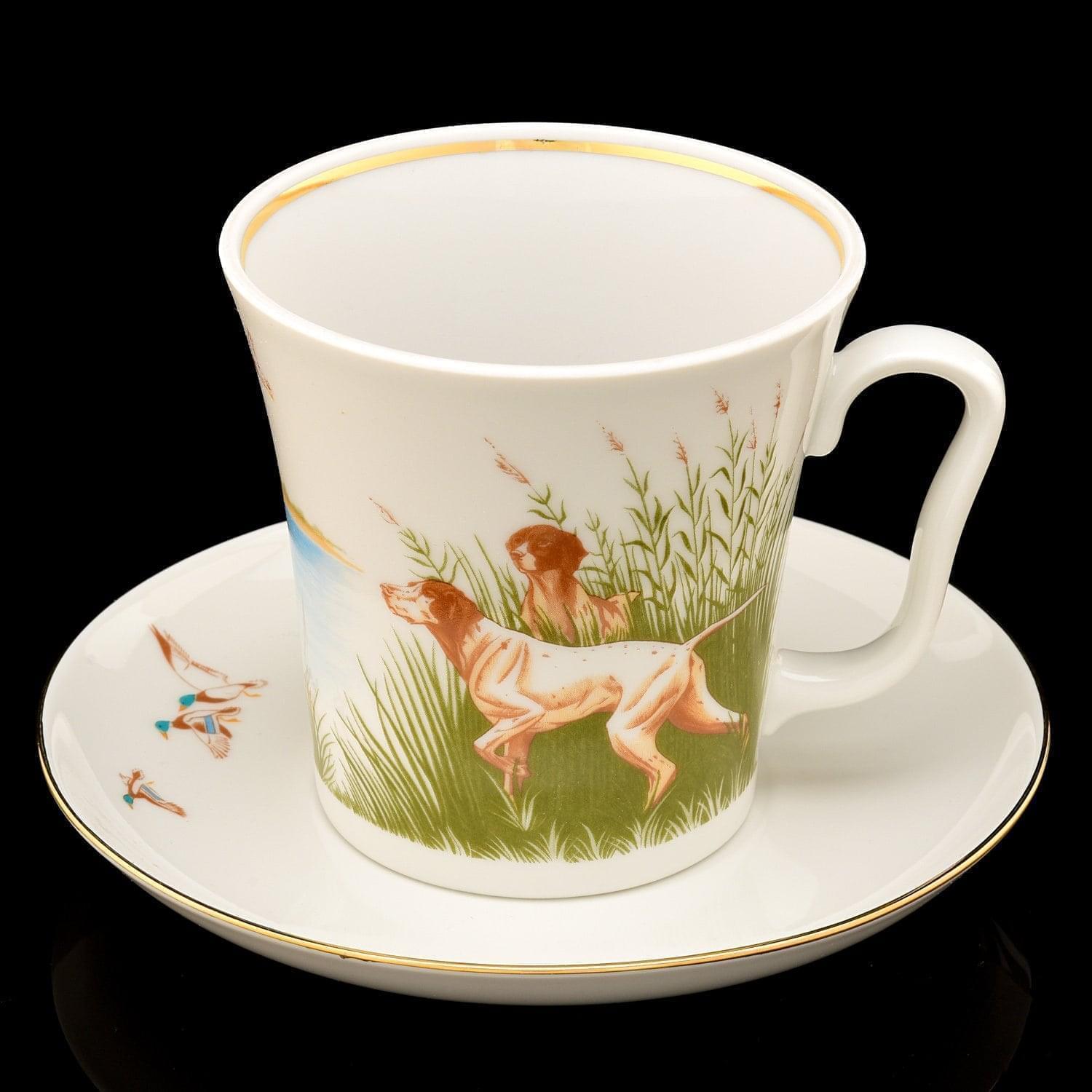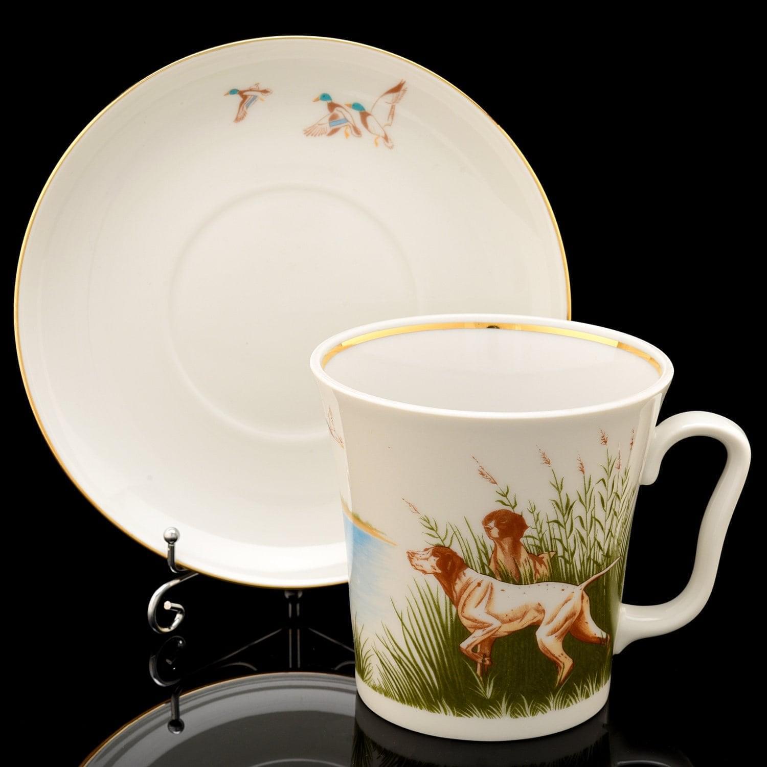 Рады предложить Вам образцы посуды из Санкт-Петербурга в комплектах, сервизах и поштучно. Так Вы можете оценить их качество и выбрать нужную комплектацию. Перед Вами - чашка с блюдцем, корпус которой оформлен из "русского белого золота" - твердого, не пористого фарфора - в соответствии с формой "Ленинградский". Роспись выполнена в технике деколь, предполагающей нанесение рисунка на поверхность фарфора с листа бумаги. Композиция со сценкой по мотивам охоты на уток защищена слоями прозрачной стеклянной глазури; поверх нее выполнен декор посредством краски на основе золота.