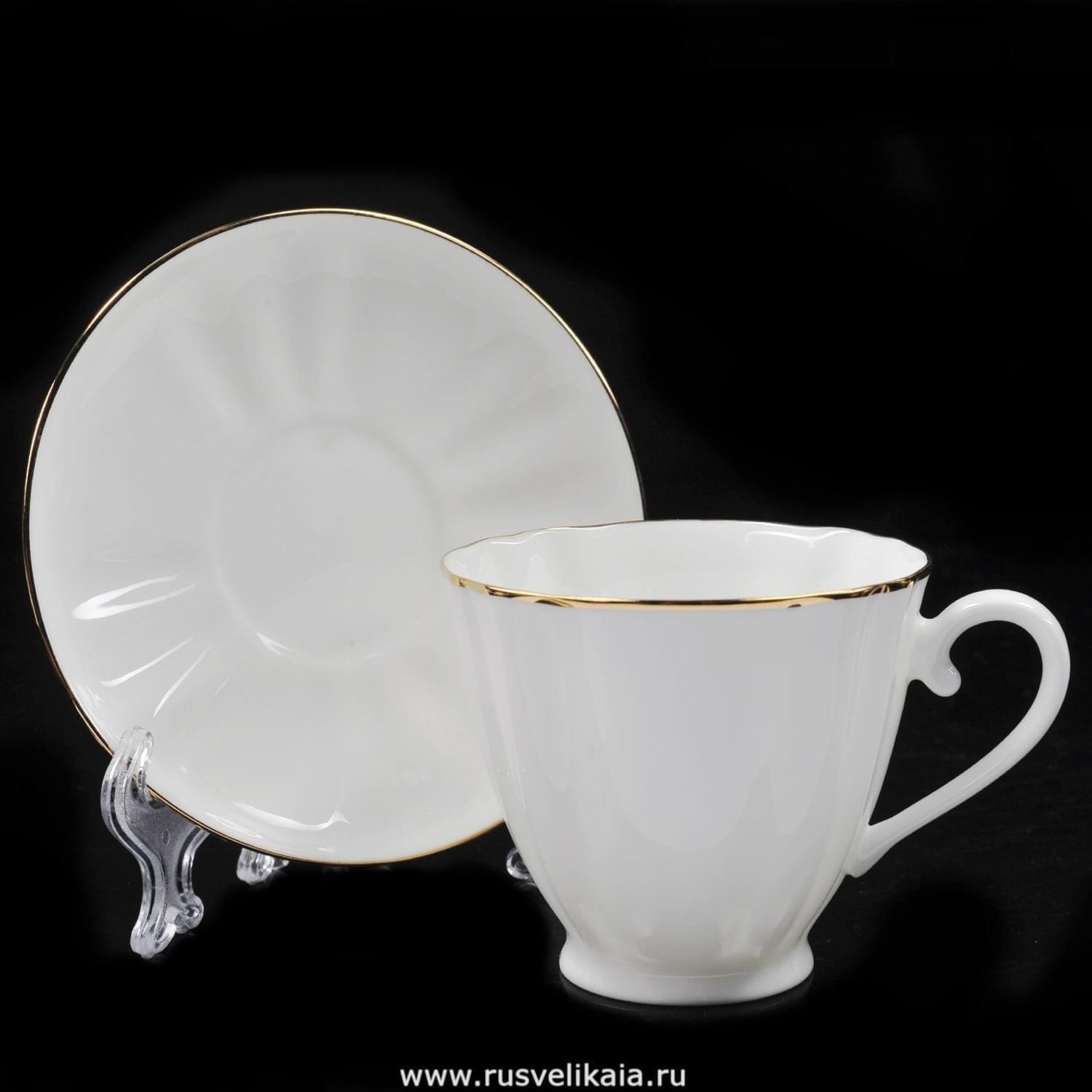 Элегантный чайный ансамбль с классическим дизайном придется по душе любителям хорошего чая и красивой качественной посуды. Чайная пара (чашка + блюдце) изготовлена из тонкостенного костяного фарфора в соответствии со старинными традициями Императорского фарфорового завода. Форму «Гвоздика» создала художница, скульптор ИФЗ Татьяна Линчевская. Техника росписи отводка золотом вручную подчеркивает белизну костяного прозрачного фарфора, который считается самым элегантным и модным во всем мире. Изделие Императорского фарфорового завода (ИФЗ/ЛФЗ). Коллекция: Белое золото. Форма: Гвоздика. Рисунок: Золотой кант. Материал: тонкостенный костяной фарфор, золото. Размеры: чашка 200 мл. высота - 7,5 см. диаметр блюдца - 12 см.