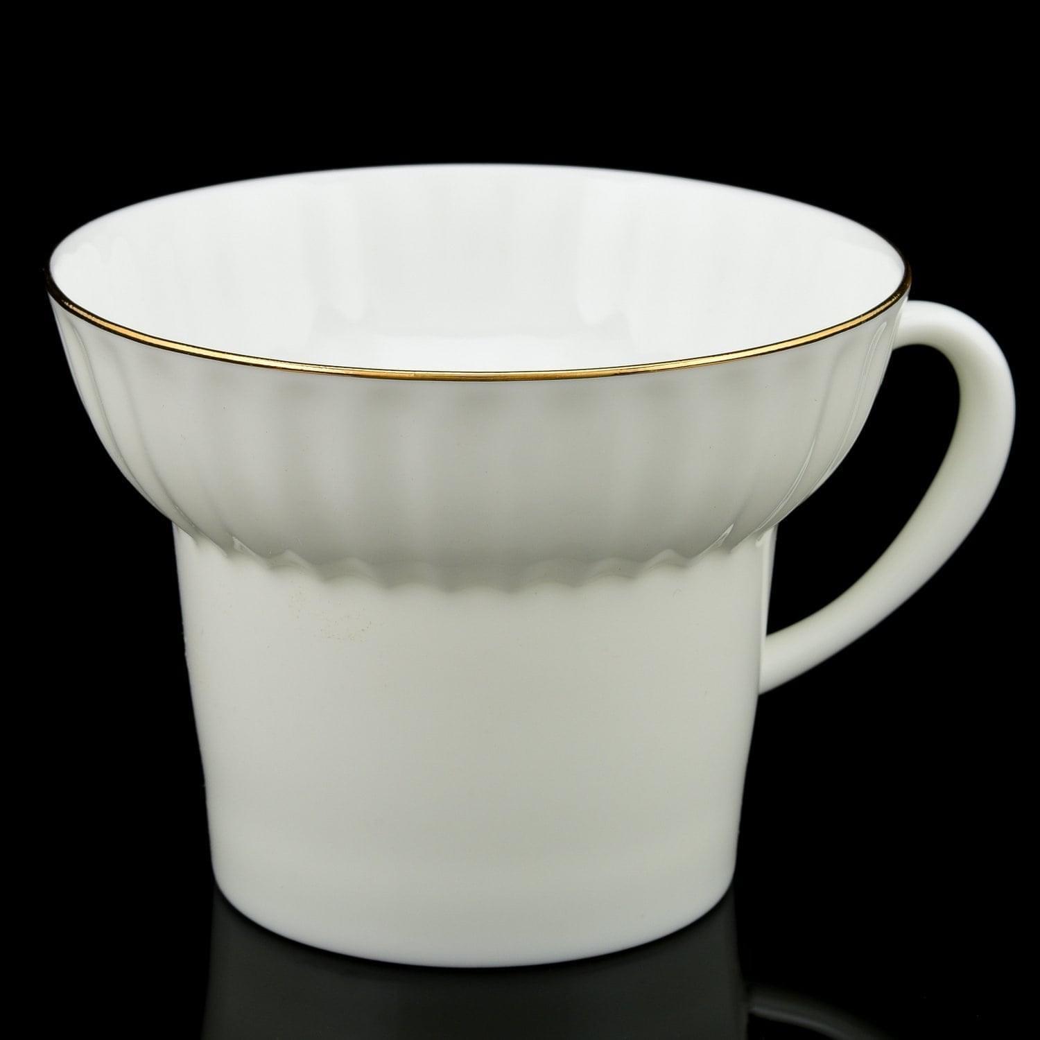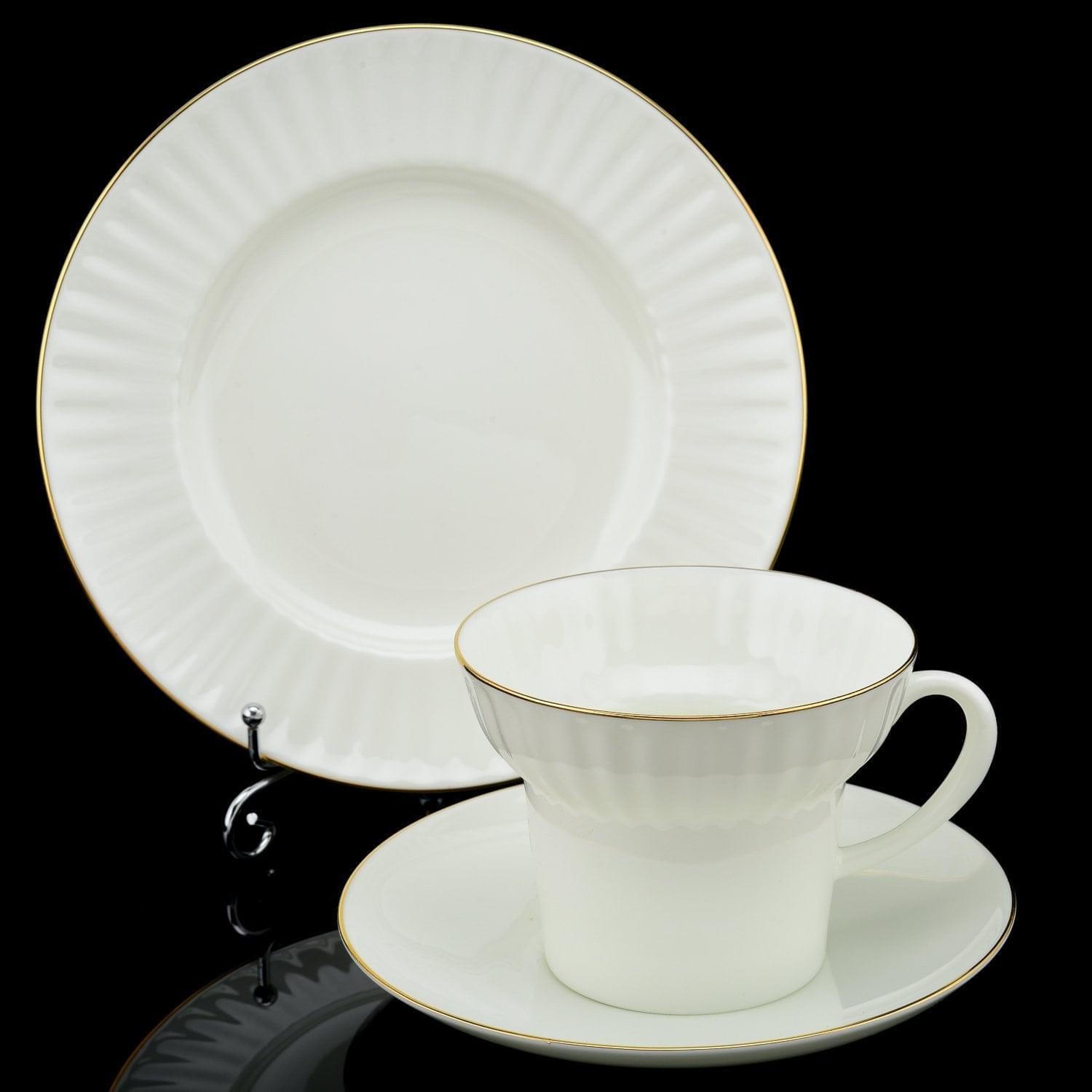 В фарфоровый набор входят чашка, блюдце, ложка чайная серебряная (925 пр.). Чайная пара изготовлена из костяного фарфора, комплект упакован в подарочный футляр. Рисунок Золотой кантик исчерпывающий и стильный. Форму придумал Эдуард Михайлович Криммер, график, сценограф, живописец, дизайнер, искусствовед, работавший на ИФЗ с 1950 года. Его учителем был сам Казимир Малевич! Роспись в технике отводка золотом привлекает внимание. Выпускается ансамбль с 1971 года, и за почти полвека стал хитом продаж. включая приемные президентов, уполномоченных представителей, коллекционеров фарфора разных стран. Объем чашки 165 мл. Диаметр блюдца 12 см. Длина ложки 13 см. Средний вес ложки 22 г.