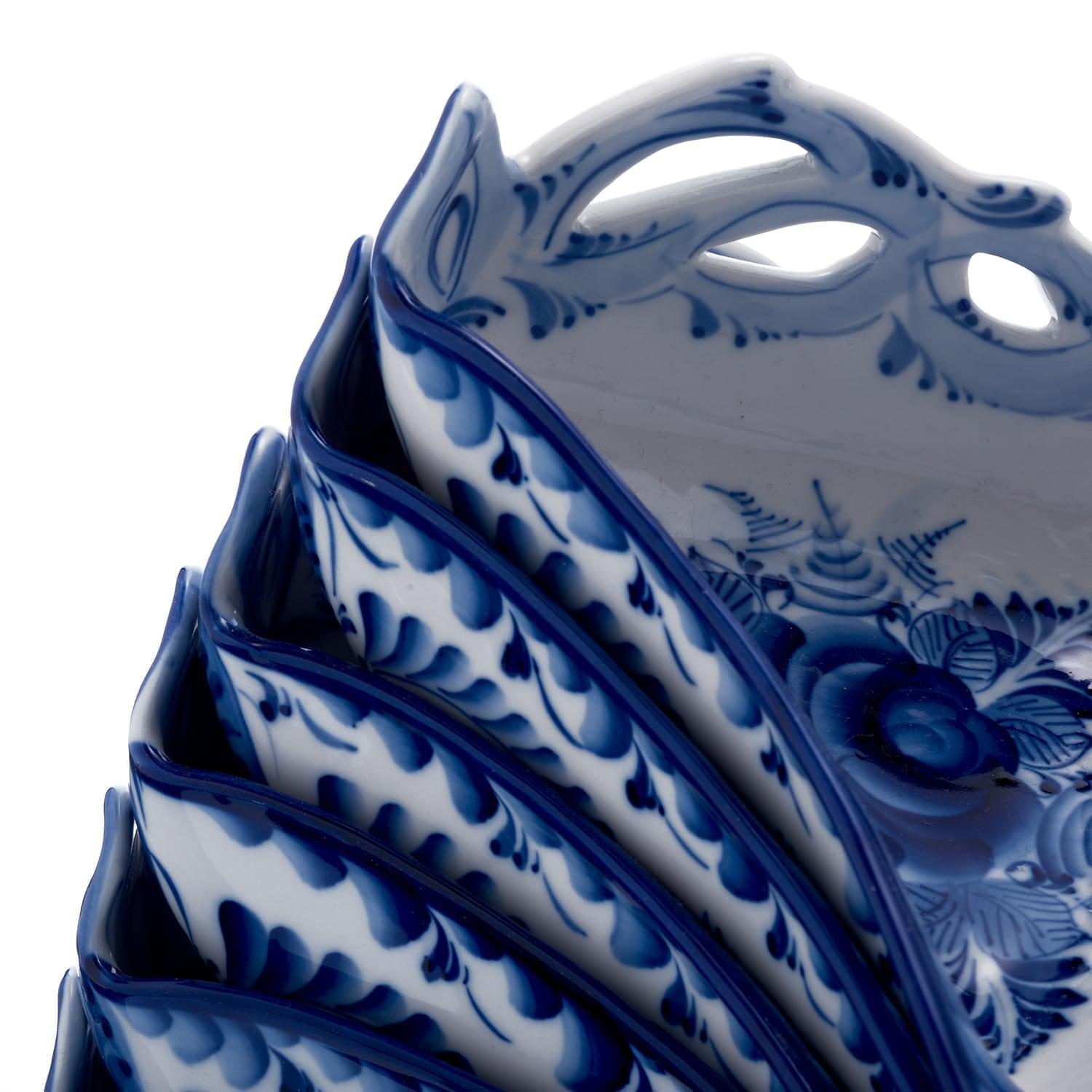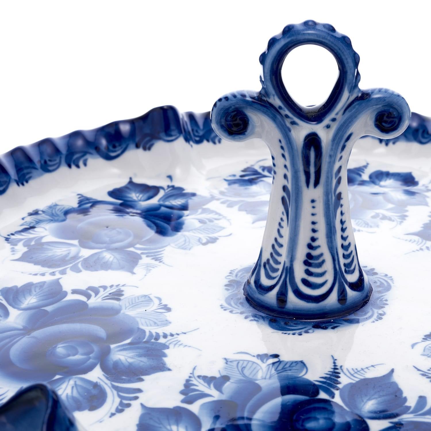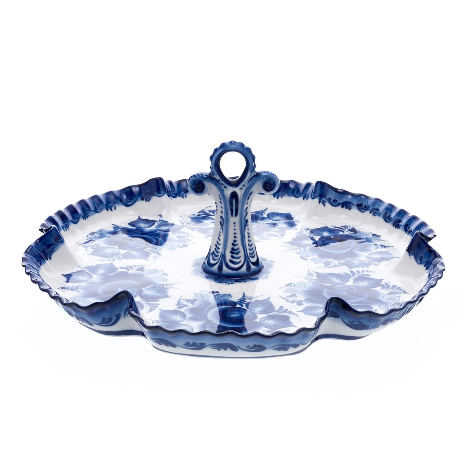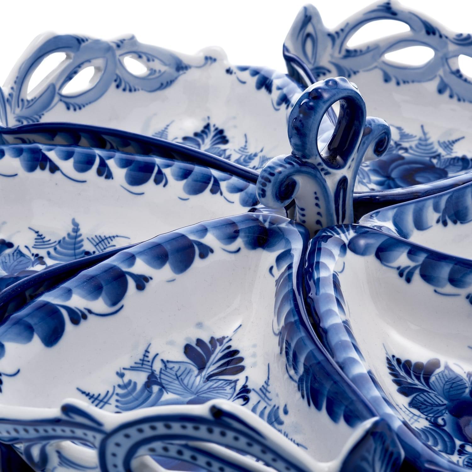 Каждое готовое изделие обмокнуто в жидкую стеклянную глазурь, надежно защищающую роспись. Авторские растительные орнаменты гжельских мастеров никогда не повторяются в точности. Авторская работа гжельского мастера, менажница Гжель - это красивый, символичный и функциональный подарок в русском стиле для мужчины или женщины на личный или общий праздник.
