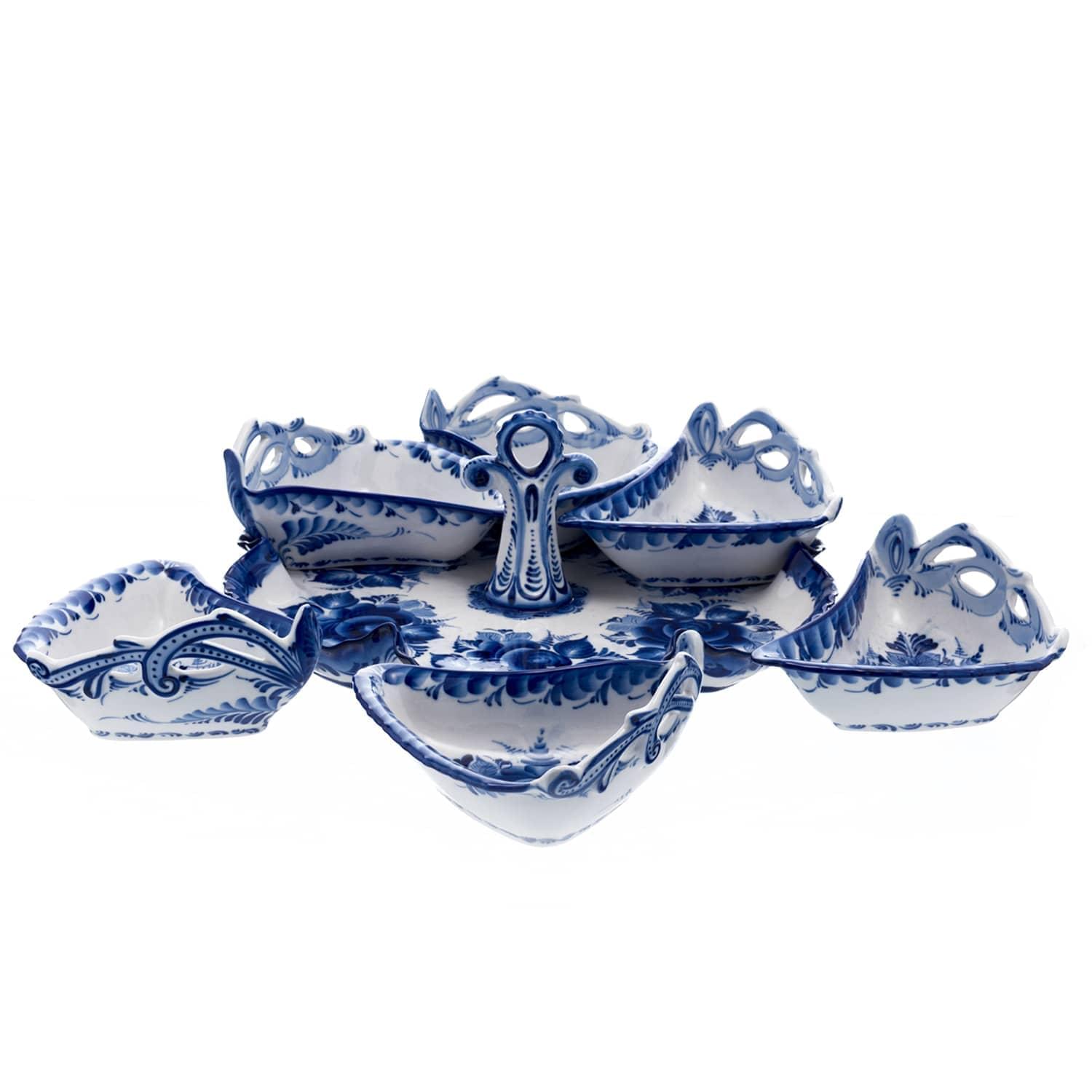 Шесть фигурных блюдец-треугольников и блюдо-цветок с фигурной ручкой по центру составляют ансамбль для сервировки стола в русском стиле. Эта менажница изготовлена и расписана ручную одним мастером. Русские народные блюда с соусами и подливками, а также индийское карри будут в этой посуде аппетитными и бесподобно вкусными!