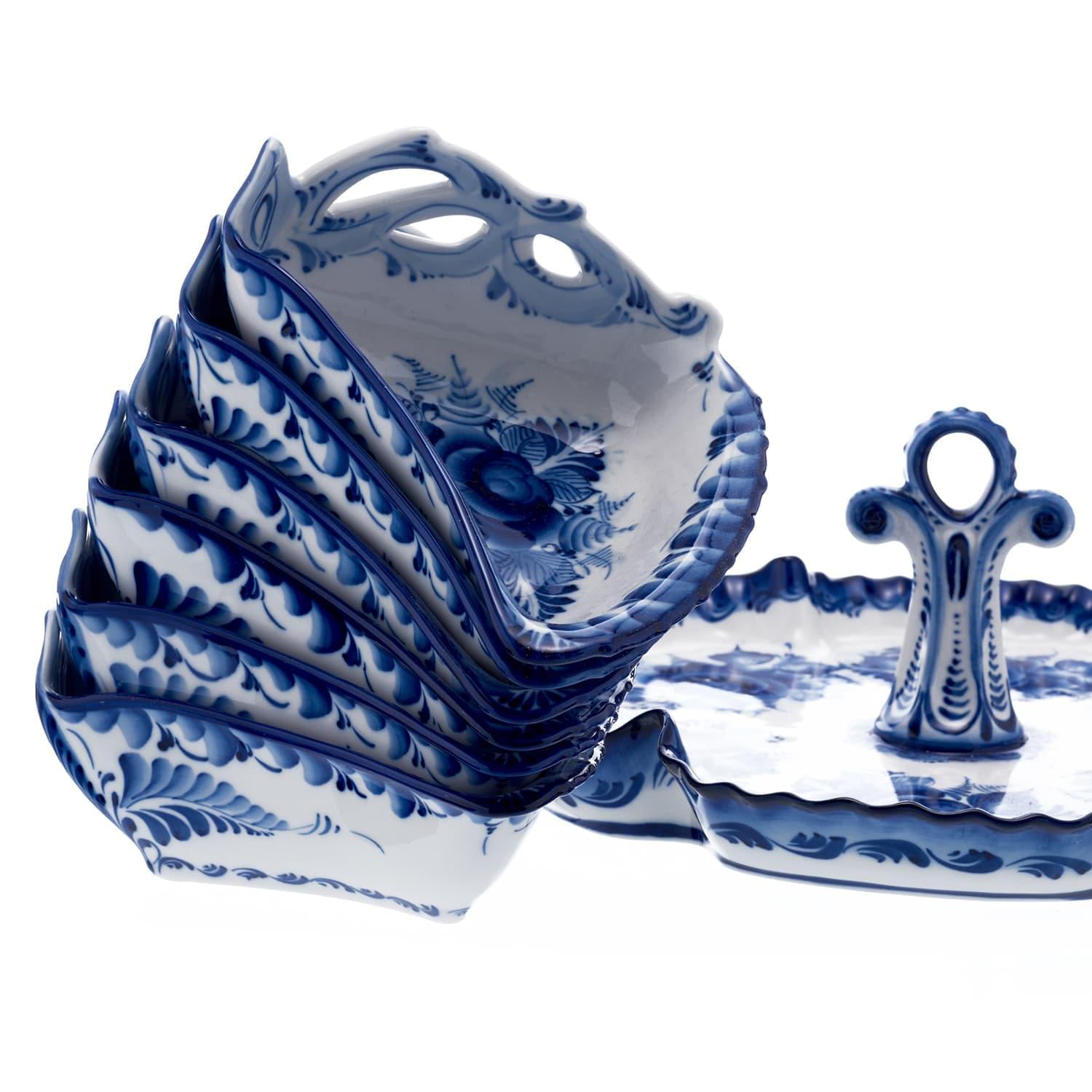 Этот оригинальный комплект является замечательным образцом старинного гжельского промысла, который уже несколько веков развивается на территории двух бывших губерний, Бронницкой и Богородской, богатых глиной. На основе высококачественной подмосковной глины готовится гжельский фарфор, используемый для создания посуды и элементов декора ручной работы.