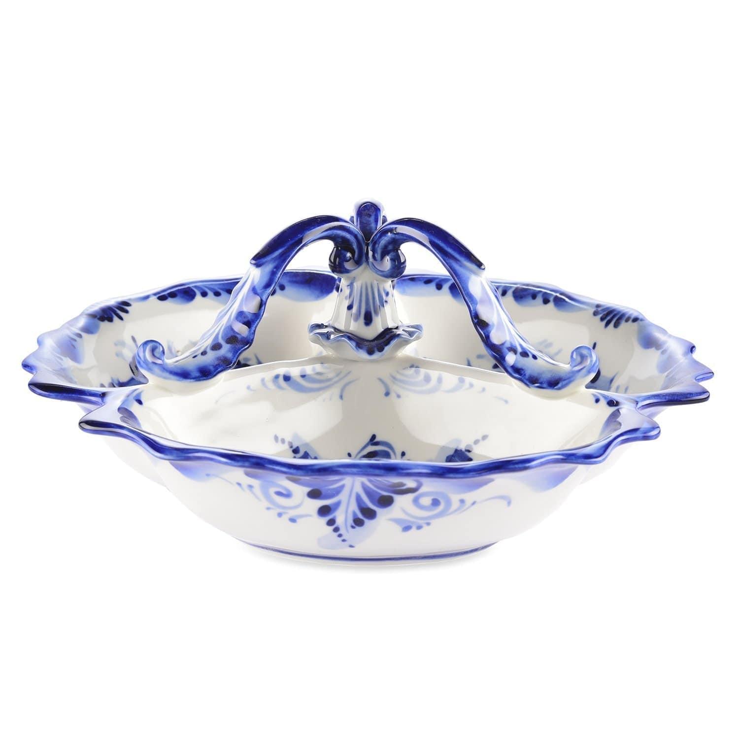 Глубокий корпус менажницы оформлен гжельским гончаром из твердого, не пористого фарфора, называемого русским