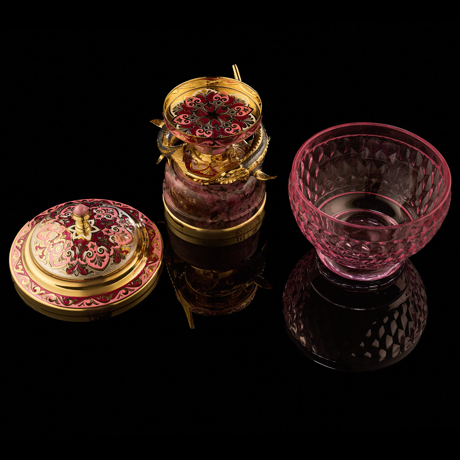 Материалы: латунь, никель, золото 999,9*, эмаль, стекло, родонит.