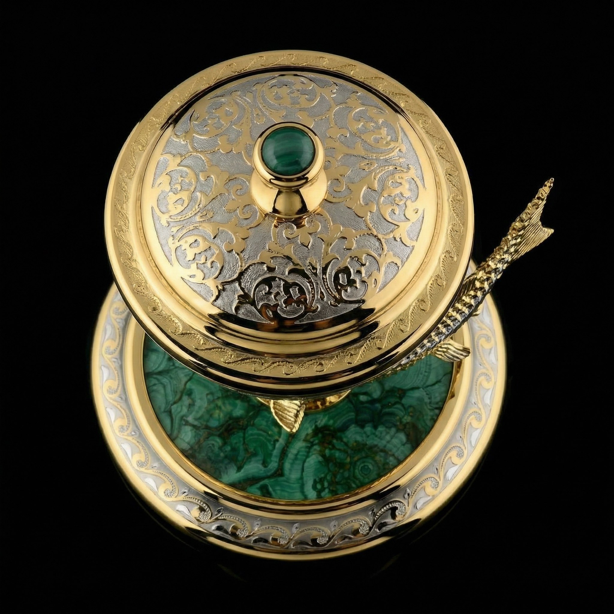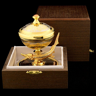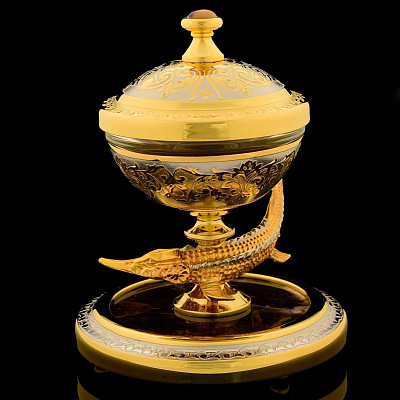 Икорница «Стерлядка» — это роскошное изделие из Златоуста, где искусство гравюры встречается с природной красотой уральского камня. В её основе — изящная фигура стерляди, выполненная методом Златоустовской гравюры по металлу, которая покоится на устойчивой подставке из цельного малахита. Этот полудрагоценный камень с его знаменитыми витиеватыми узорами придаёт композиции особую живописность и солидность, делая каждый экземпляр уникальным.