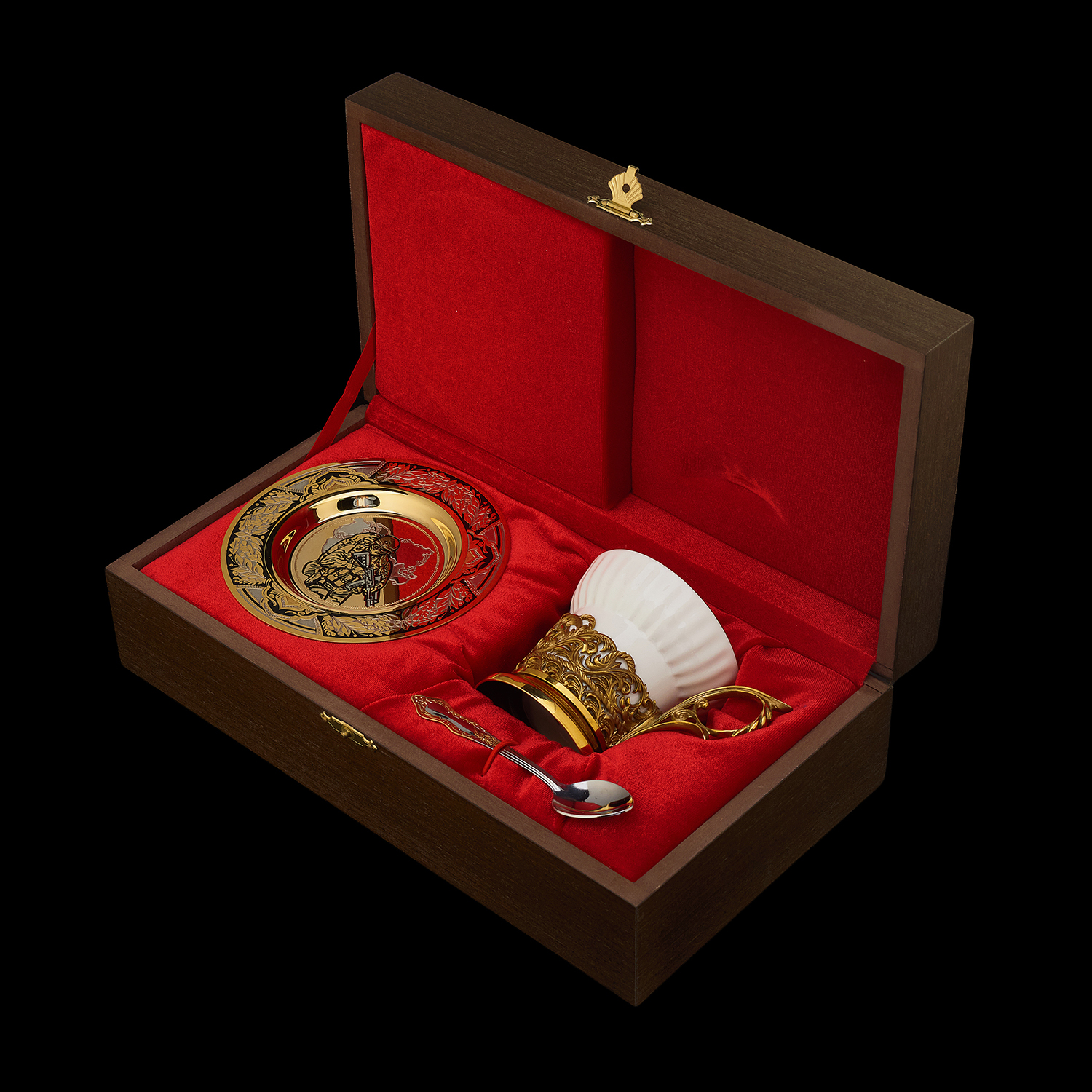 Кубок «Георгий Победоносец с гербом РФ» в подарочной шкатулке из дерева
