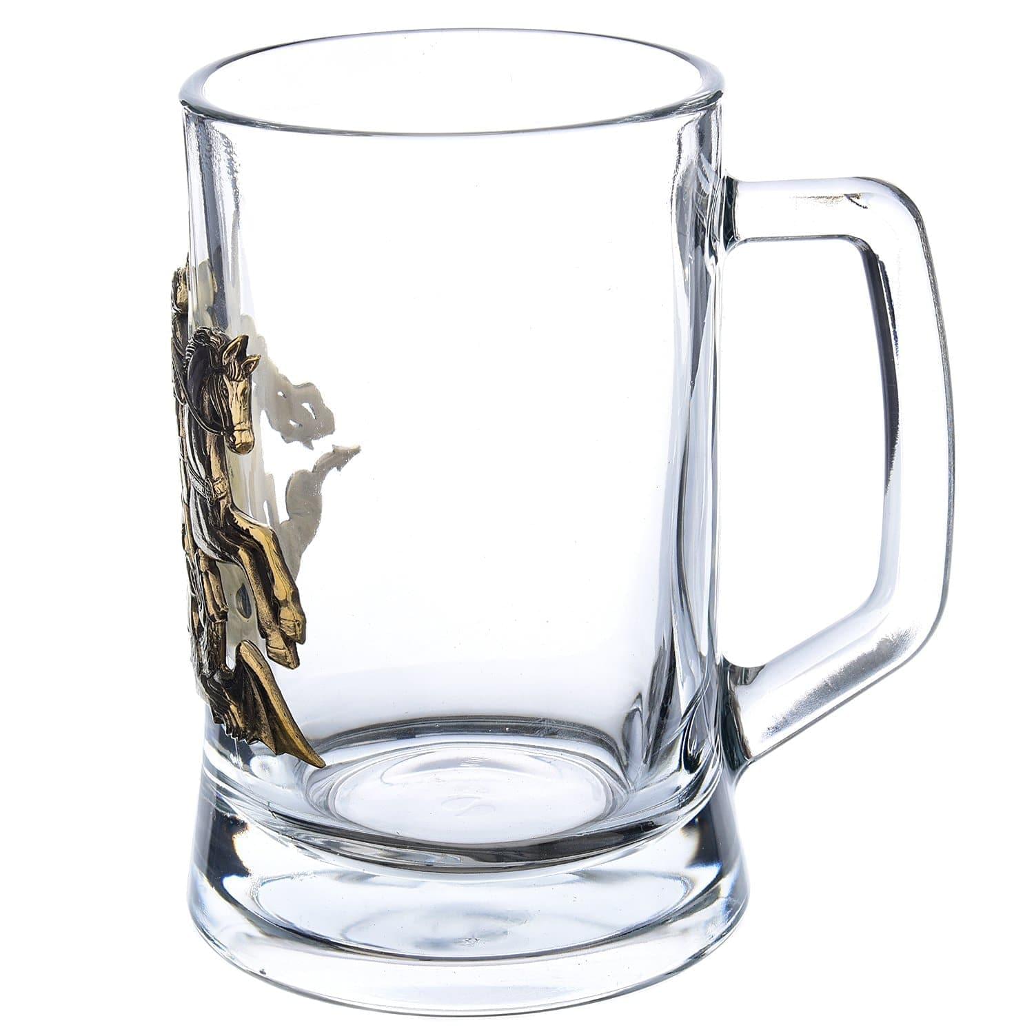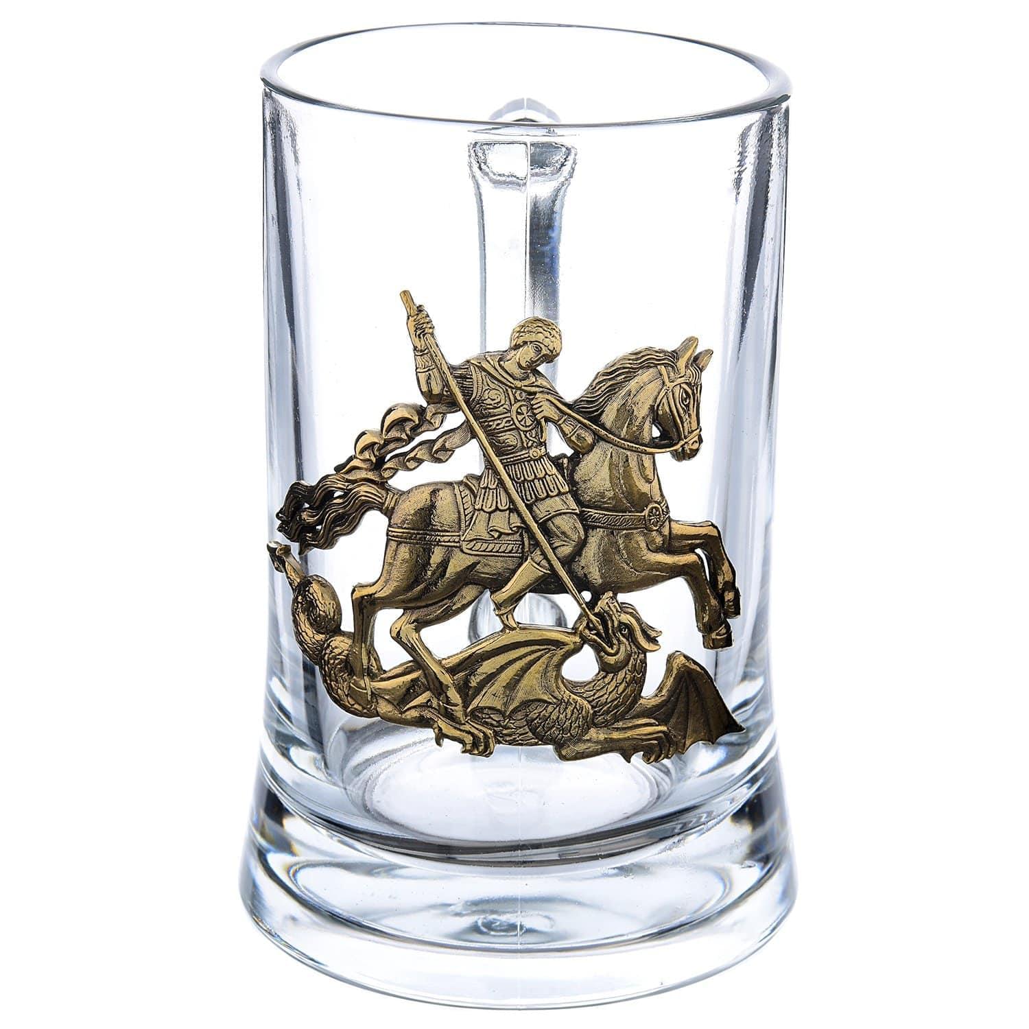 Необычная емкость специального назначения, мужская кружка для пива призвана стать стильным украшением мебельной поверхности и предметом гордости обладателя. Оригинальная авторская работа, кружка пивная "Георгий Победоносец" из стекла с накладкой из бронзы - это замечательный вариант подарка для мужчины на 23 февраля, День рождения, именины, Новоселье, общий или личный, в том числе профессиональный праздник.