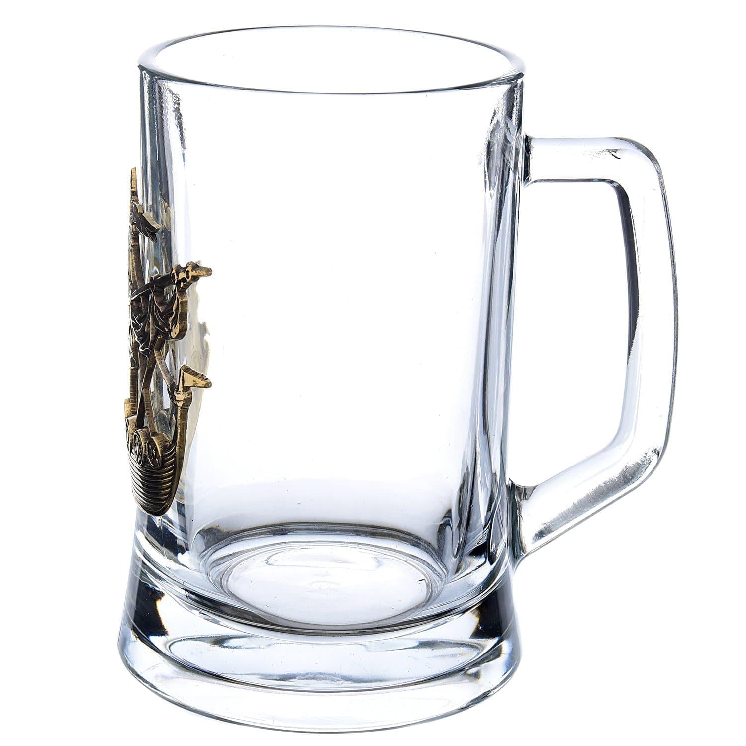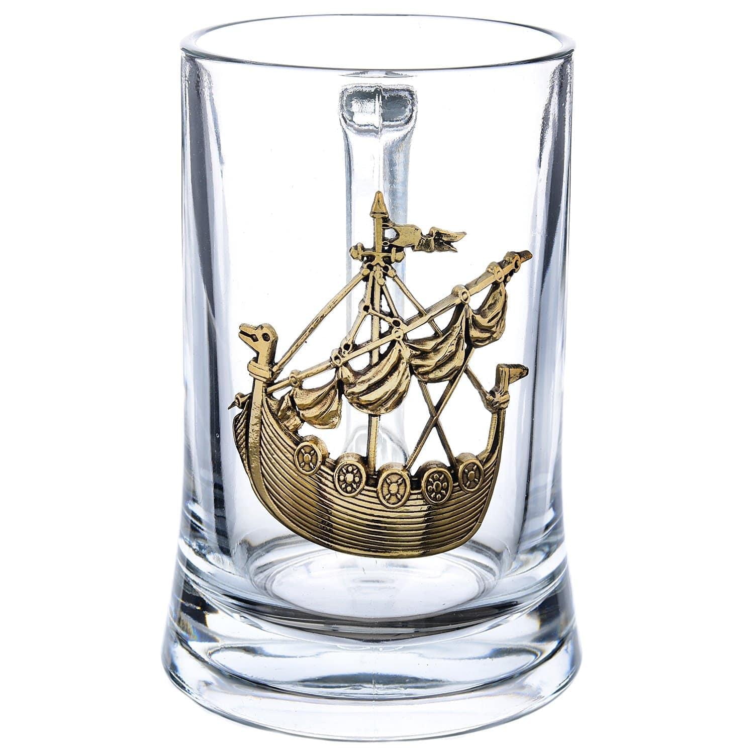 Большая, высокая пивная кружка сделана из высококачественного прозрачного стекла. Ее корпус украшен декоративной накладкой с изображением ладьи. Композиция создана в соответствии с оригинальным авторским эскизом из металлического медного сплава, тонирована эффектной позолотой и патиной с целью придания объемов изображению.
