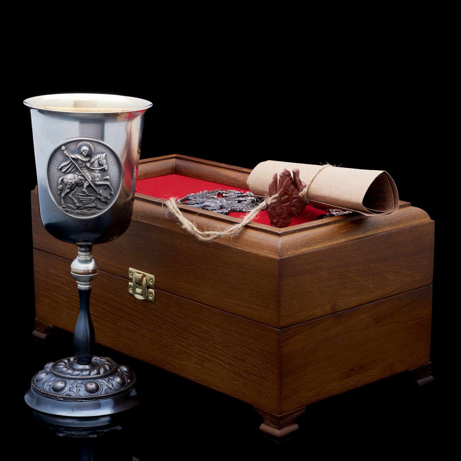 Кубок украшен гербом РФ и образом Георгия Победоносца, великомученика, почитаемого святого в христианском мире. Пострадал за веру, не отказался от Бога и был казнен язычниками. Одно из посмертных чудес святого Георгия - убийство копьем змея, опустошавшего землю языческого царя в Берите. Когда выпал жребий отдать на растерзание чудовищу царскую дочь, явился Георгий на коне и пронзил змея копьем, избавив царевну от смерти. Многие жители после этого обратились в христианство. Иносказательно: царевна - церковь, змей - язычество, победа над «древним змием» - победа над дьяволом. Согласно преданию, святой Георгий захоронен в городе Лод, в Израиле. Часть мощей содержится в храме Сент-Шапель в Париже. Десница хранится в серебряной раке на святой горе Афон, в монастыре Ксенофонта.