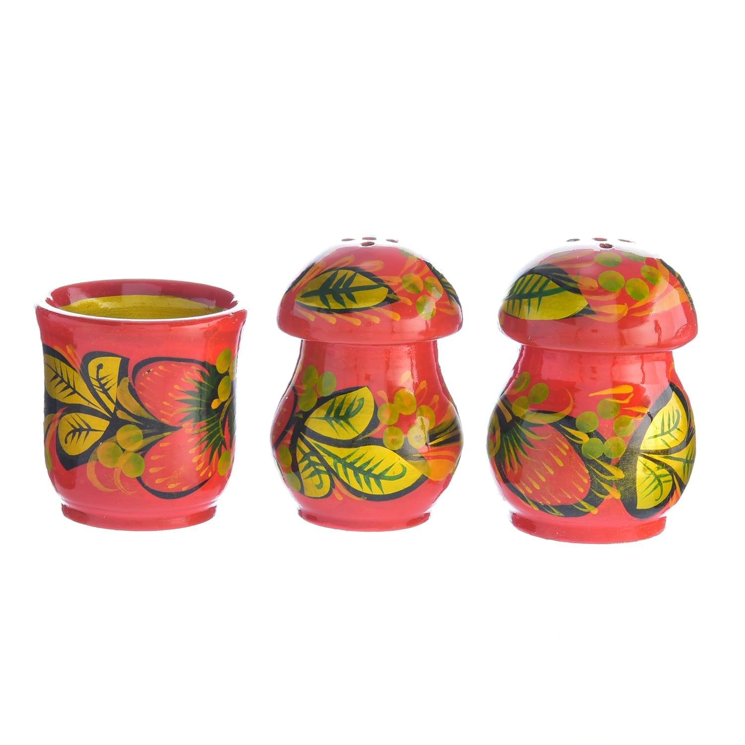 Коллекция оригинальных кухонных аксессуаров «Руси Великой» продолжает пополняться новыми привлекательными работами. Одна из новинок – нарядный набор для специй. Аксессуар создан из экологически чистого материала – натурального дерева. Набор включает в себя три емкости для специй и блюдо. Емкости для специй оформлены в виде грибочков. Ансамбль расписан вручную профессиональным мастером в лучших традициях старинного русского искусства – Хохломы.