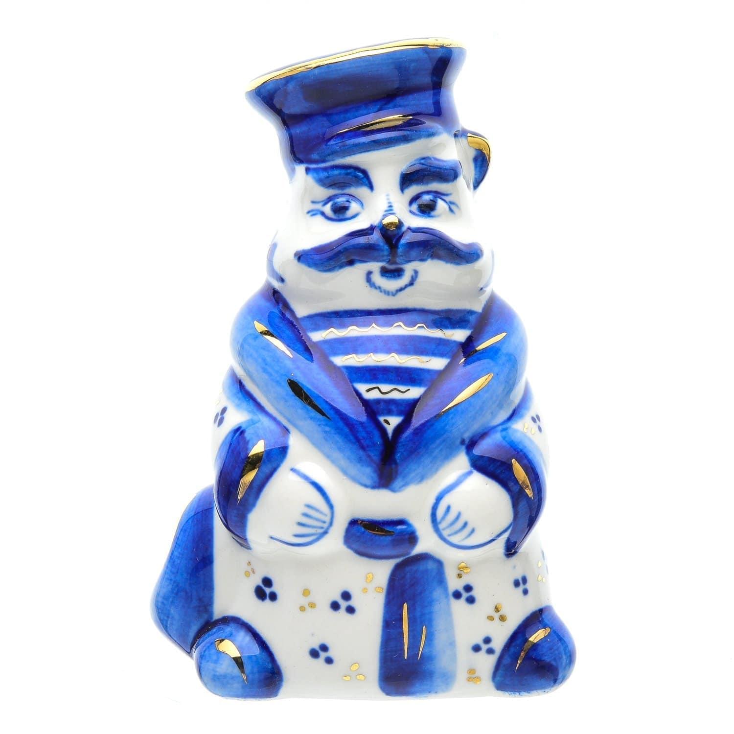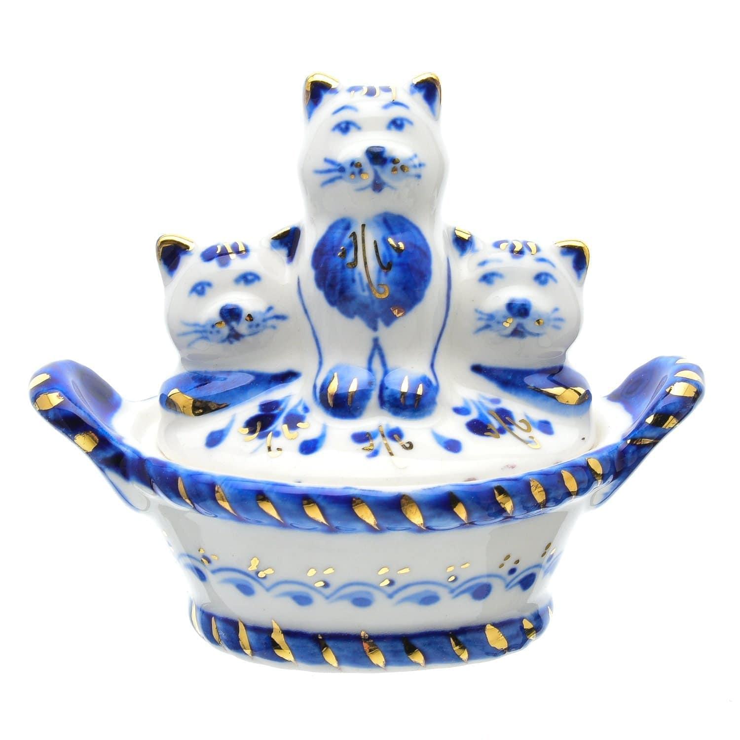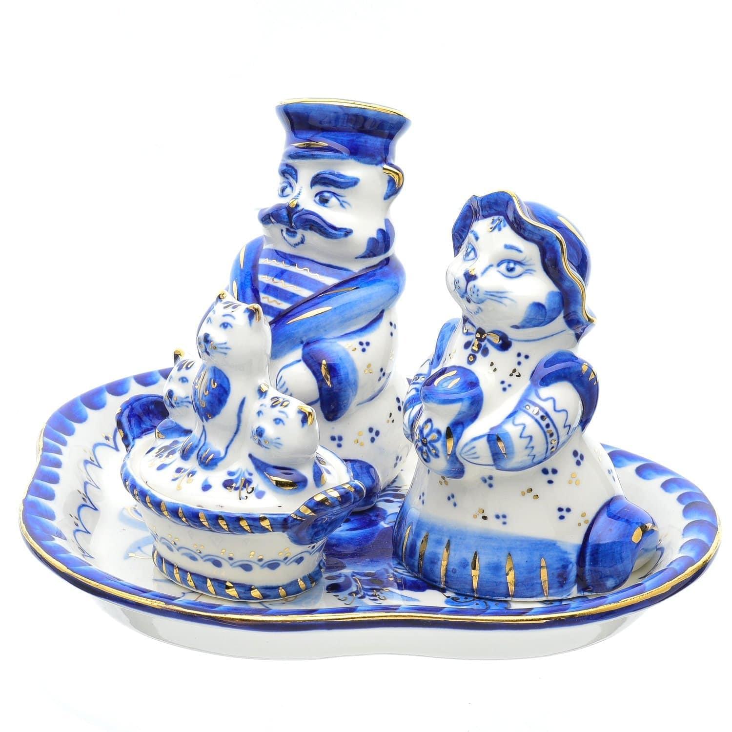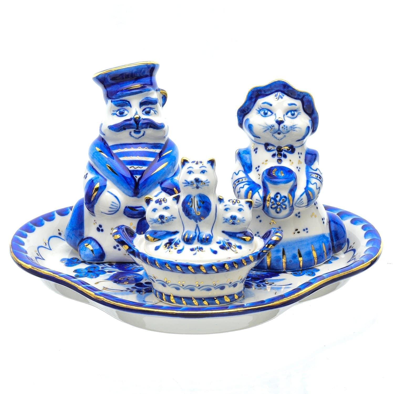 Кот в матроске и кошка-сударыня, а с ними - их котята. Все вместе предстали в виде скульптурных сосудов для специй на подносе. Перед Вами - красивый дизайнерский набор для сервировки стола и декора кухонного интерьера. Предметы изготовлены и расписаны вручную одним гжельским мастером, обладающим навыками гончара и художника-рисовальщика.