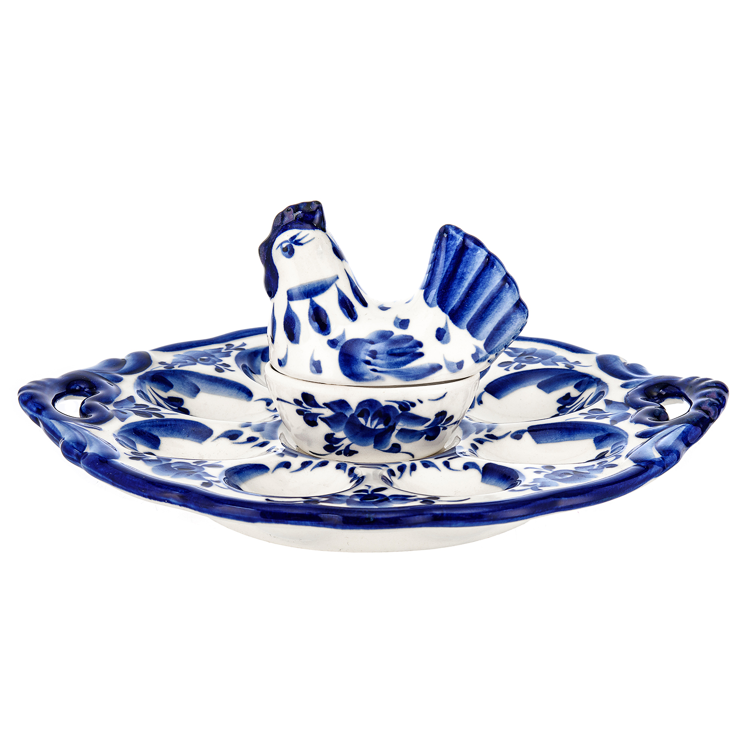 Глубокий фигурный корпус этой пасхальницей с ручкой посредине в виде скульптуры курицы-несушки создан гжельским художником по авторскому эскизу из фарфора, приготовленного на основе высококачественной подмосковной глины. Он расписан вручную детальным цветочным орнаментом в технике свободно-кистевой росписи в узнаваемом гжельском стиле посредством окиси кобальта - главной краски гжельских художников, которая после обжигов в печи при сверхвысоких температурах приобретает синий цвет с более чем 40 его оттенками. Поверхность защищена несколькими слоями прозрачной стеклянной глазури.