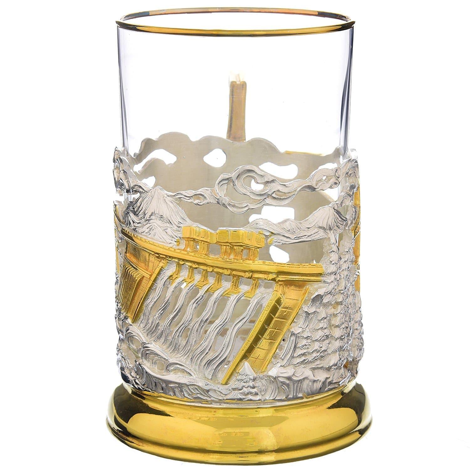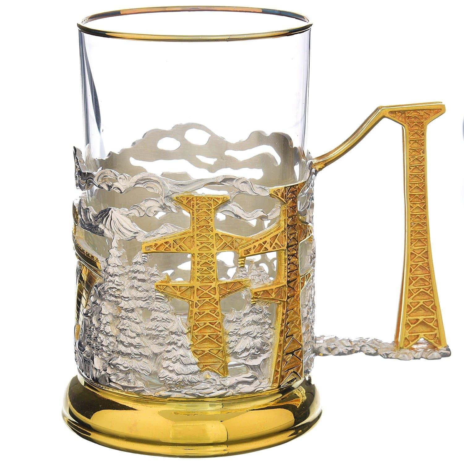 На корпусе подстаканника - символы энергетической отрасли, выделенные на серебристом фоне посредством эффектной, яркой позолоты. Перед Вами - ХИТ продаж Галереи подарков, сувенир во славу России и дизайнерский предмет утвари в русском стиле с высоким стаканом из прозрачного стекла, украшенным золотой каемкой.