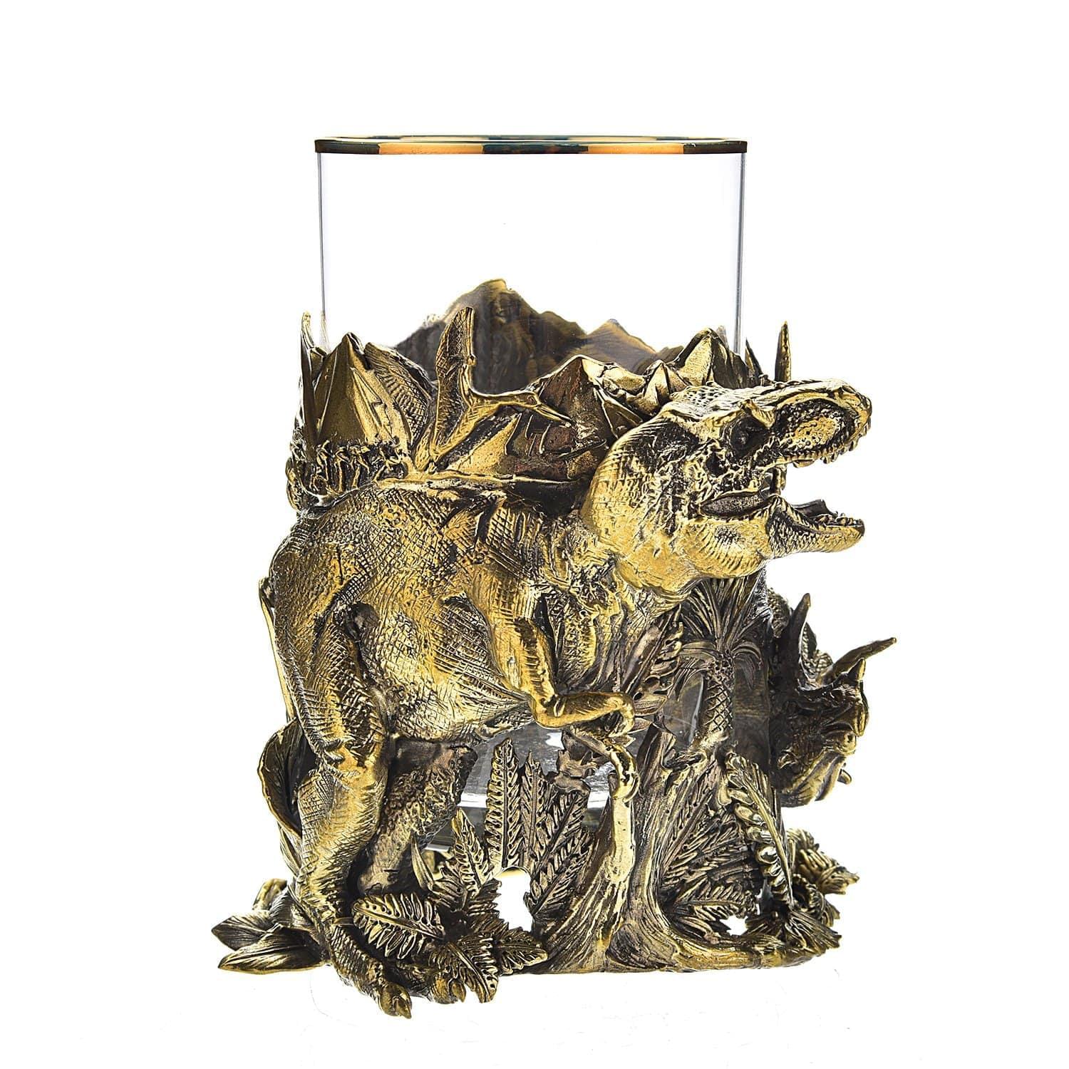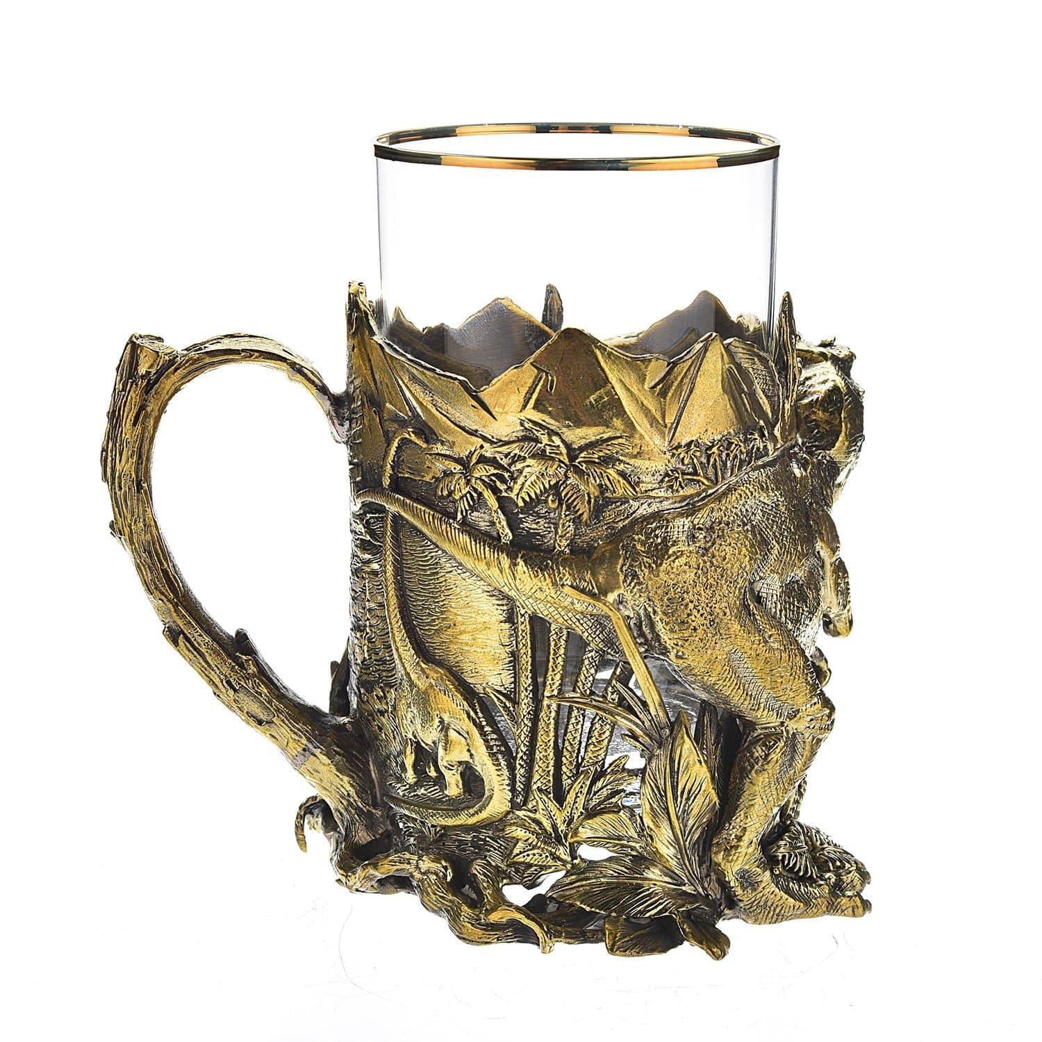 Только подстаканник, без стакана! Изделие представляет собой интерьерный аксессуар, который является образцом художественного литья. В него можно вставить стакан и использовать его как сосуд для питья. Но совершенно необязательно. Корпус подстаканника представляет собой объемную 3D-композицию с динозаврами, от которой глаз не оторвать.