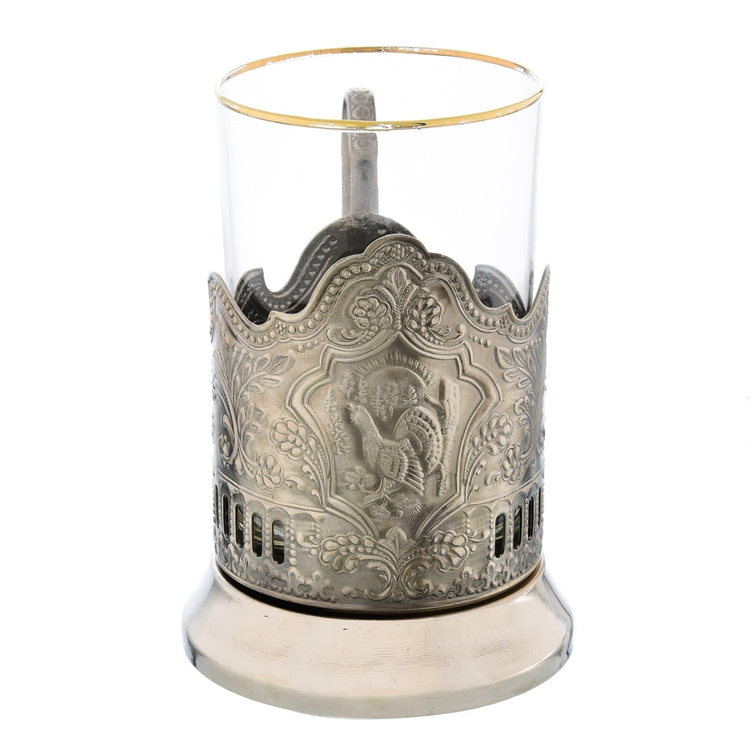 Вашему вниманию - сувенир-ХИТ, дизайнерский питейный сосуд в русском стиле с изображением глухаря - символа свободы, важности и уверенности, - который предназначен для горячих и холодных напитков. Это практичный вариант универсального представительного подарка, который точно не будет лежать без дела.. Дизайн подстаканника с литым корпусом из никеля и вставным стаканом из хрусталя понравится имениннику. Хрусталь - стекло с некоторыми добавками (не менее 24% окиси свинца или бария), которые обеспечивают этому материалу новые свойства и новые преимущества, по сравнению со стеклом. Прочность, прозрачность, звонкость и прочие. Хрусталь полируют, шлифуют, украшают резьбой и гравировкой. Декорируют фольгой, в техниках травления, матирования. Подстаканник как предмет обихода в русском стиле из металла и стекла оригинального дизайна получил широкое распространение во времена активной государственной деятельности министра Витте. В 19 веке в оформлении ручки и